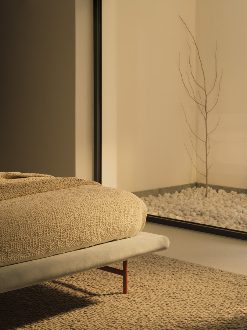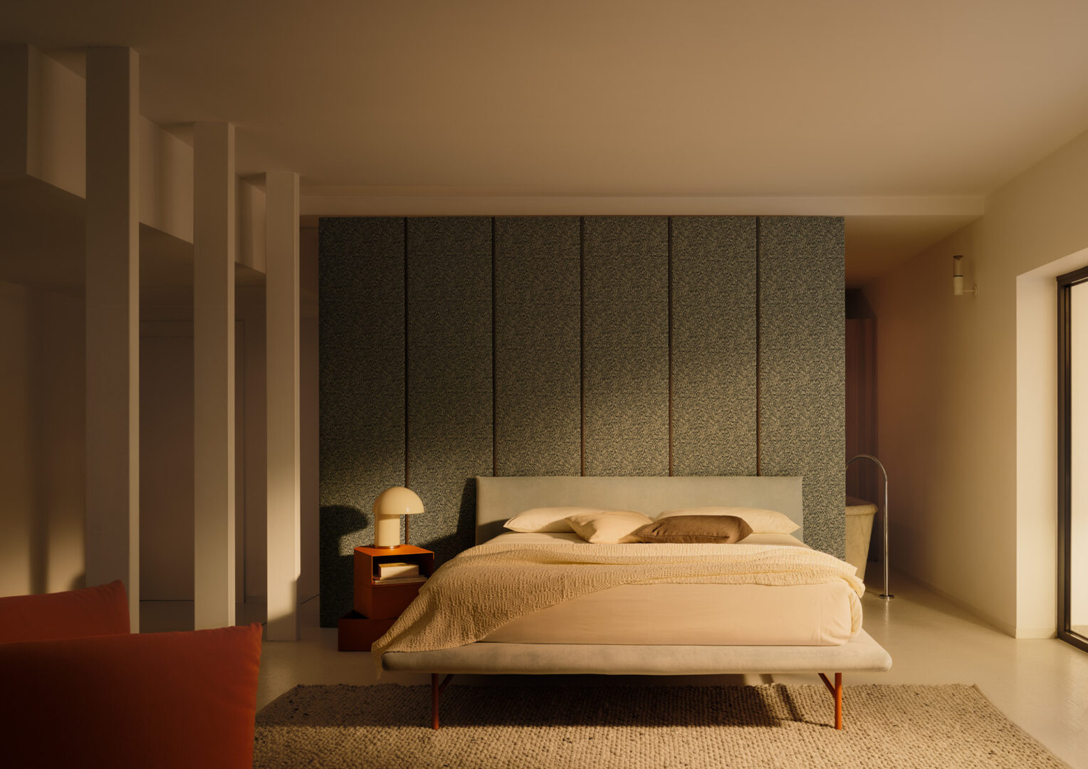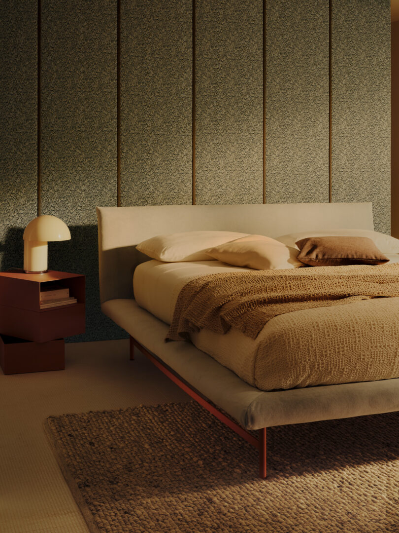 The design of Dora is essential yet full of character: its harmonious proportions and attention to detail highlight a thoughtful and refined design approach, enhancing comfort without compromising on aesthetics. The continuous and generous upholstered covering reinforces the bed’s inviting nature, making it the natural focal point of the bedroom space.