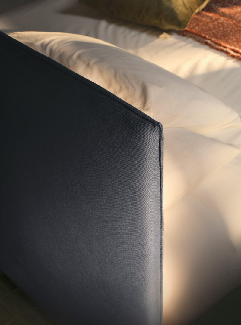 Eden can also be enriched with a large cushion, designed to fit seamlessly into the headboard. This additional detail enhances softness and comfort, turning the bed into an even more welcoming retreat.