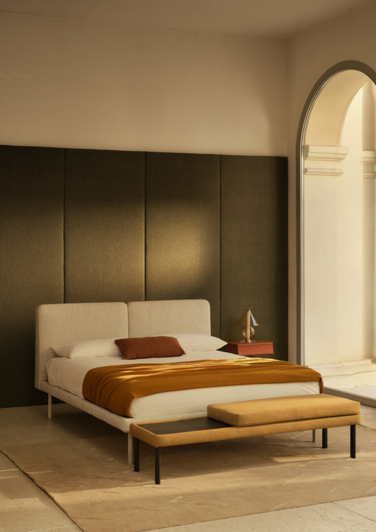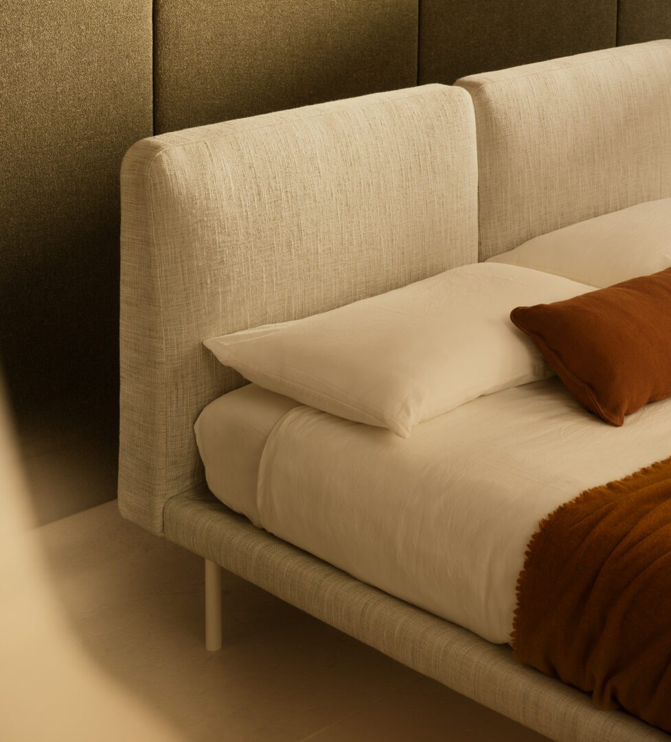 This soft curvature is not merely an aesthetic element, but also enhances comfort by offering ergonomic and pleasant support during moments of reading, relaxation, or rest. The upholstered structure conveys a sense of warmth and protection, making each awakening a moment to savour slowly and mindfully.