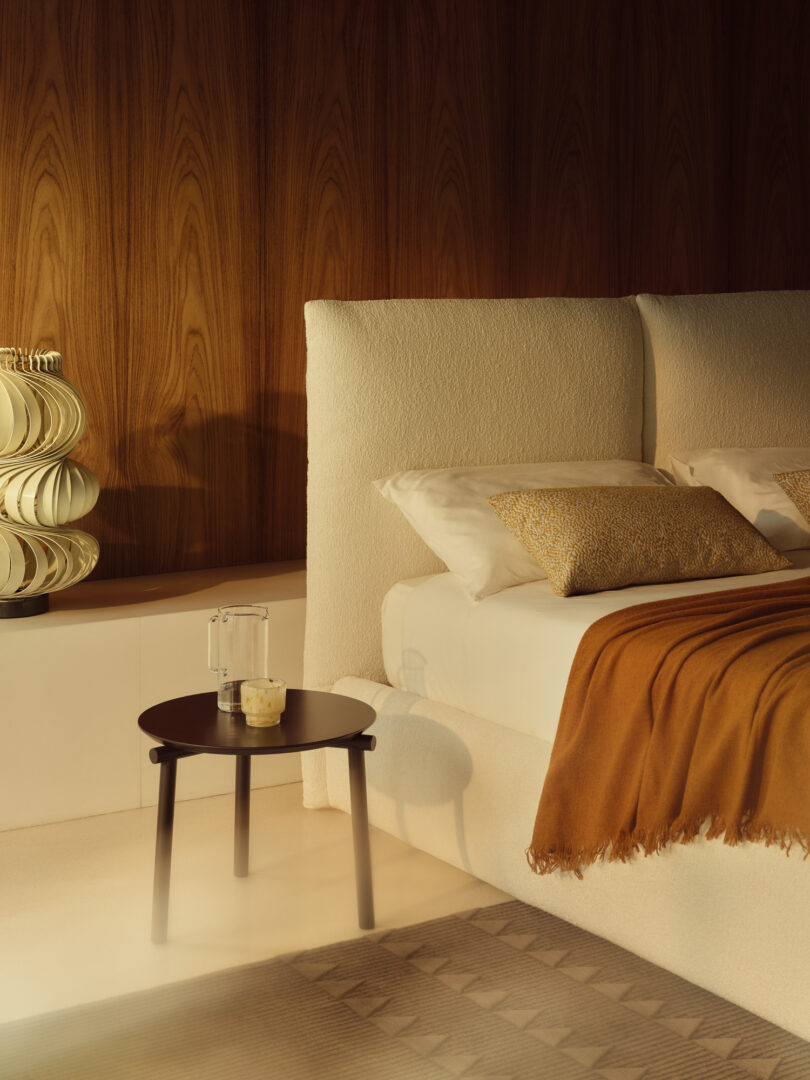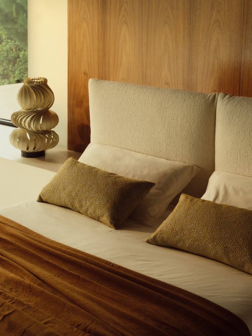 The distinctive feature of the project is the headboard composed of movable cushions, designed to adapt intuitively and naturally to the user's different postures and needs. Thanks to an integrated mechanism, each cushion can be easily reclined, transforming when needed into an ergonomic and comfortable support, perfect for reading, watching a movie, or simply relaxing in total comfort.