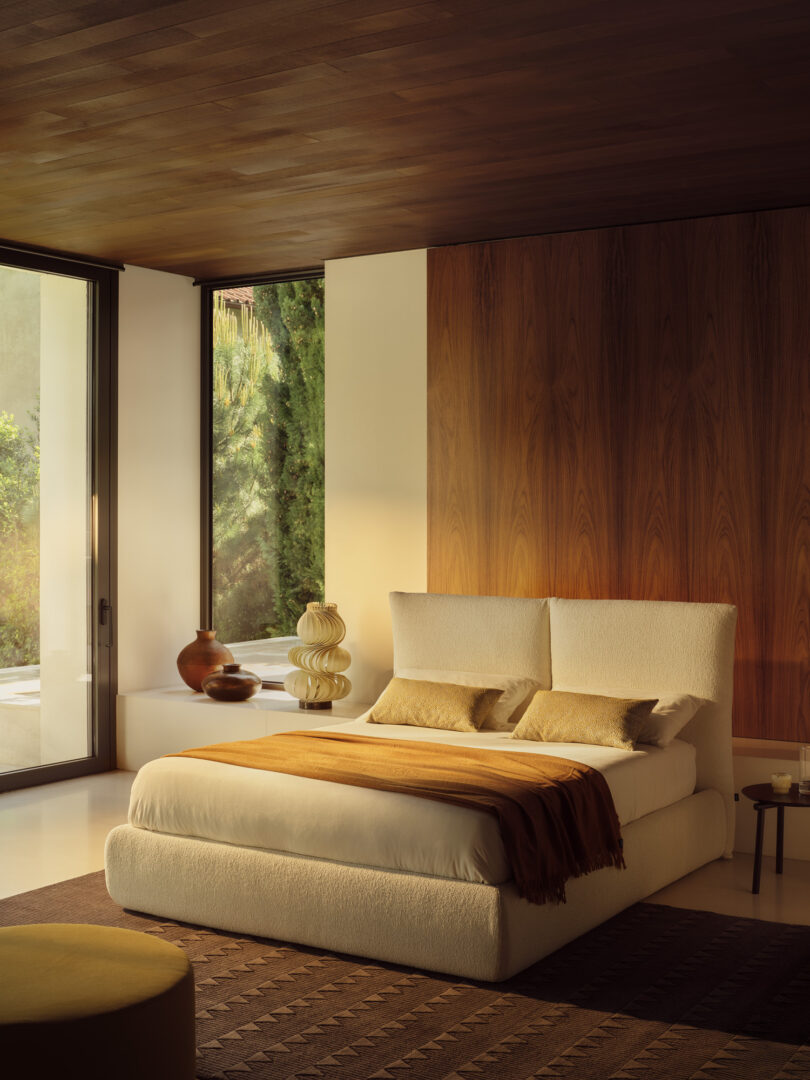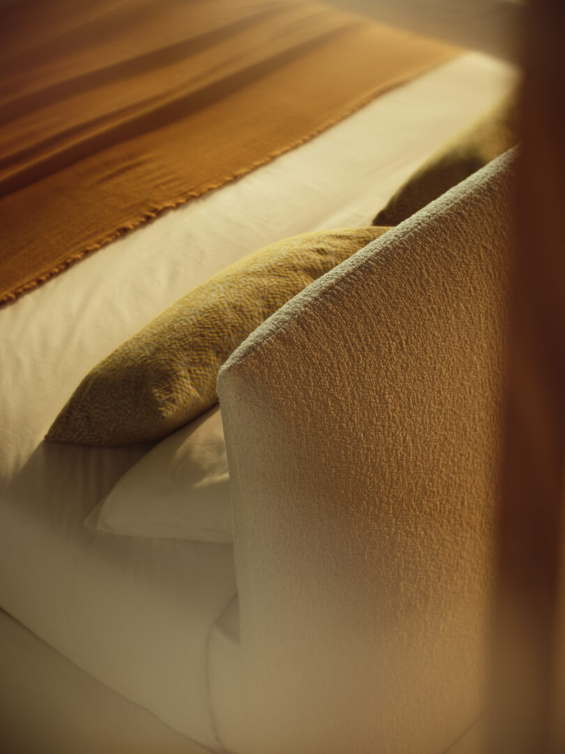 Liz's design is simple yet refined, with a solid structure and balanced proportions that give the bed an elegant presence. The soft lines and generous padding enhance the feeling of warmth and protection, helping to create an intimate and refined environment.