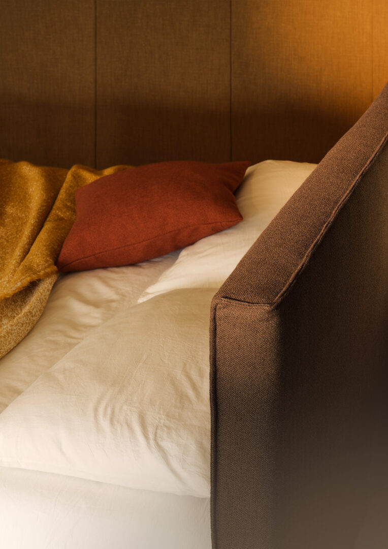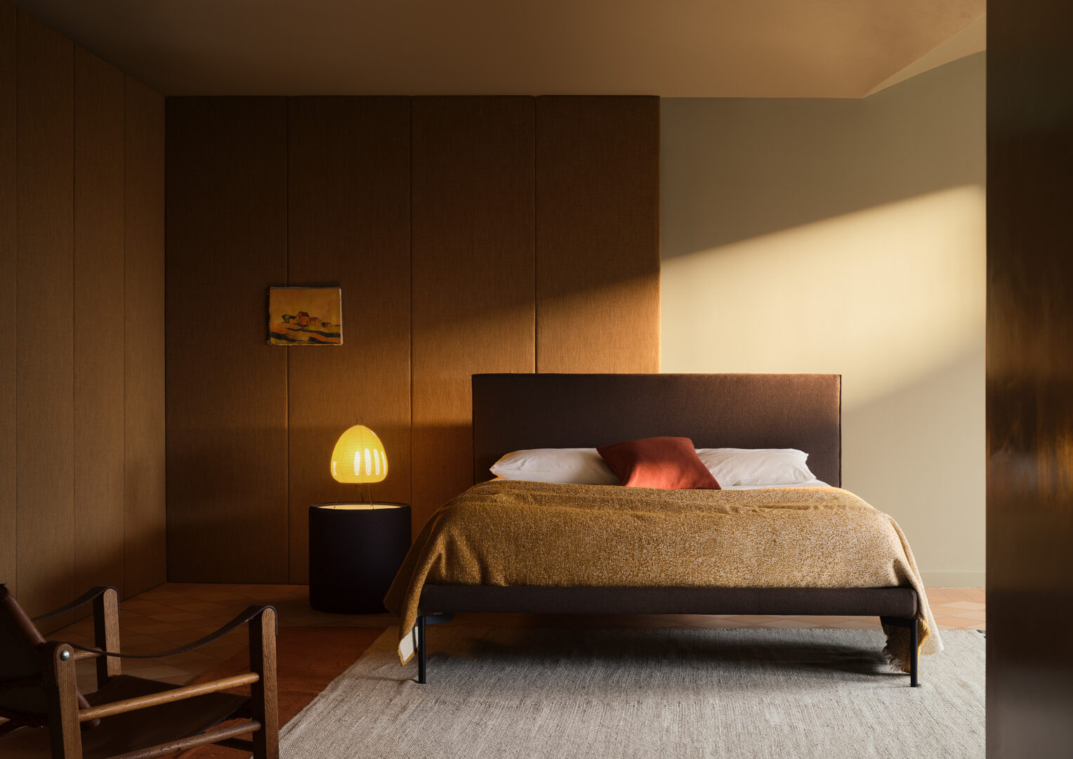 Metropolitan is an upholstered bed defined by rigorous lines and balanced proportions, designed to integrate effortlessly into a variety of settings, from residential interiors to hospitality spaces. The clean geometry of the structure interacts with soft surfaces, creating a sense of order, comfort and visual continuity.