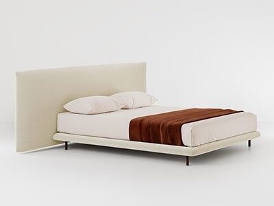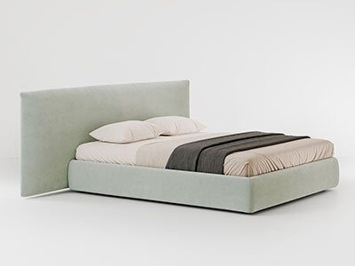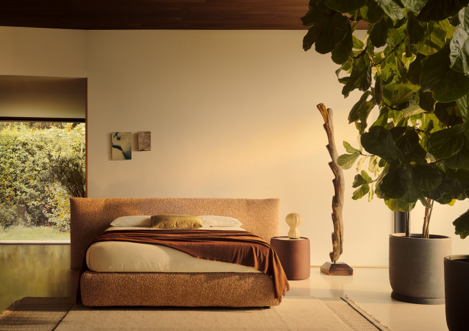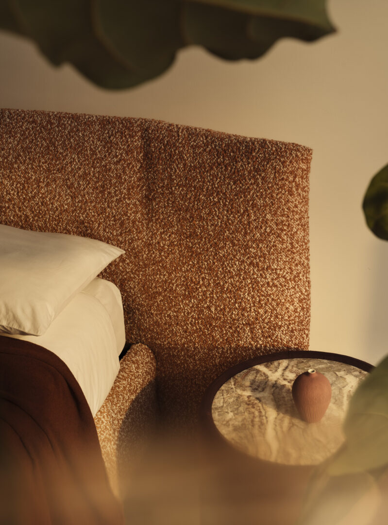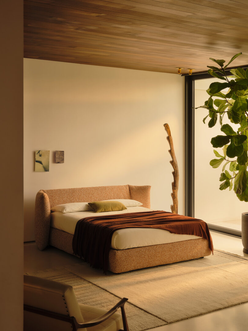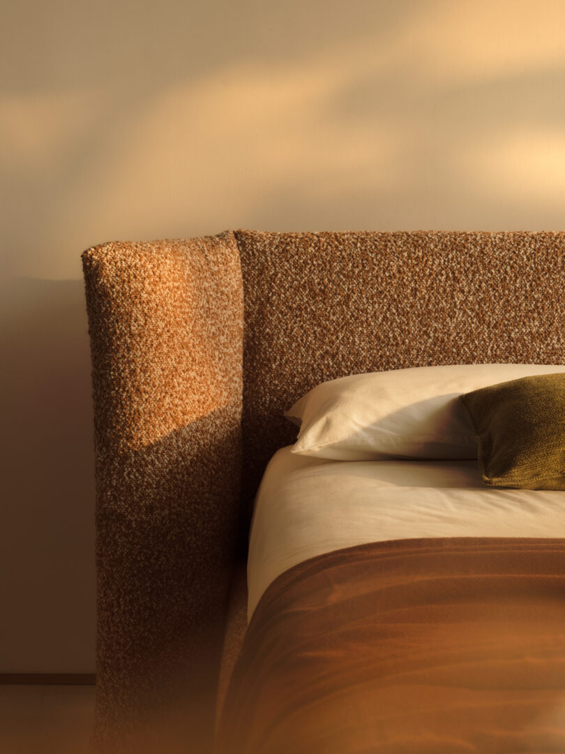 Milo is an upholstered bed that gently embraces dreams, thanks to its wide, enveloping, and scenographic headboard, designed to transform the bedroom into a personal, intimate, and sophisticated retreat. Its soft and generous shapes evoke a sense of protection and comfort, giving the piece a graceful presence that stands out effortlessly, even when placed in the centre of the room.