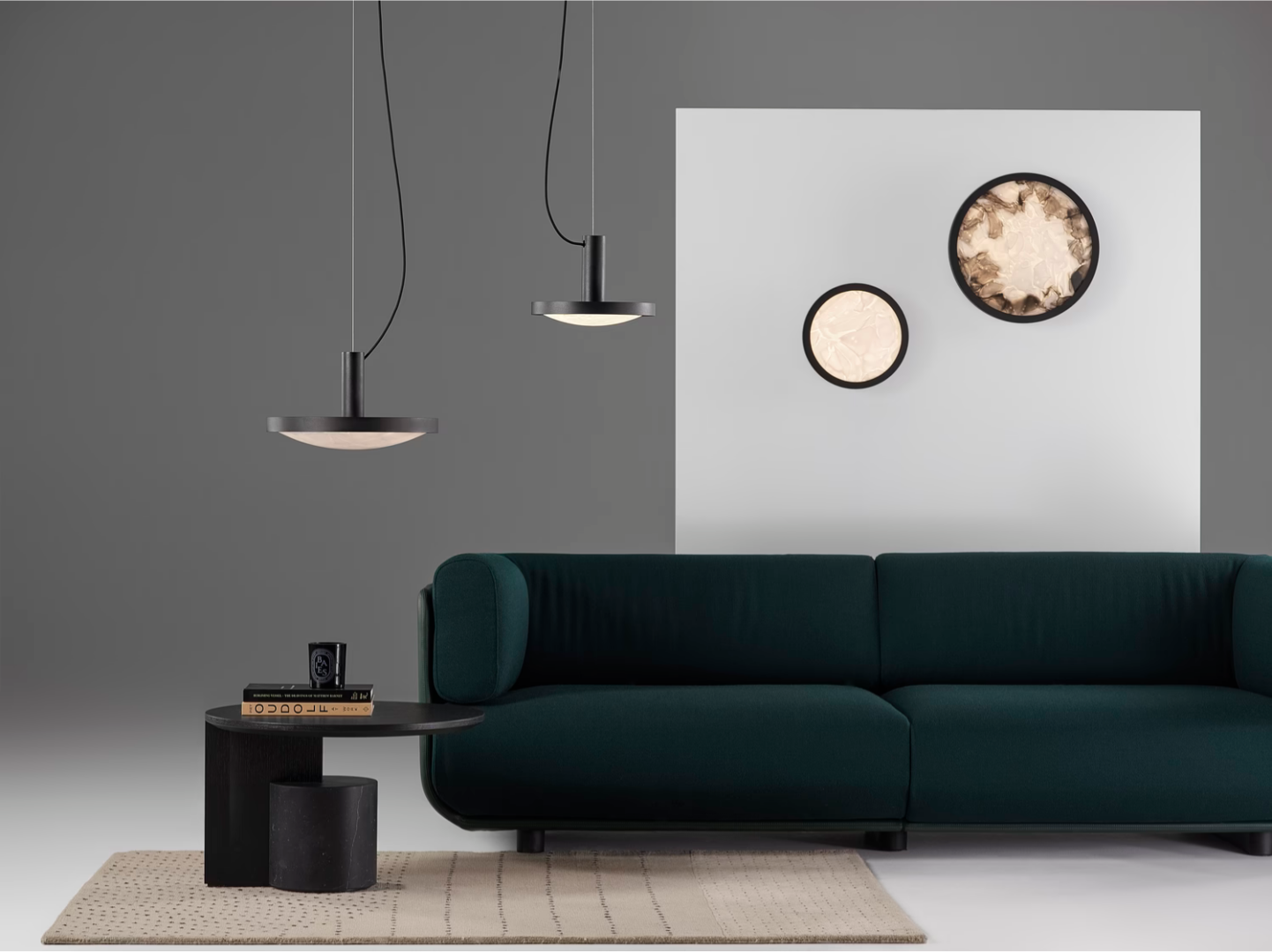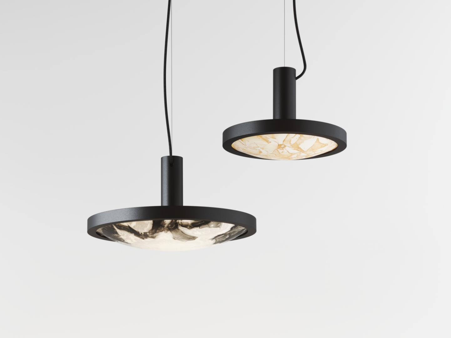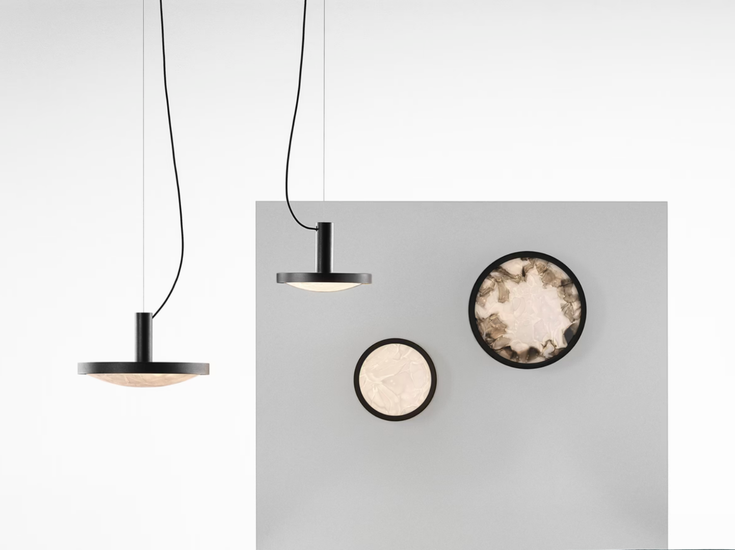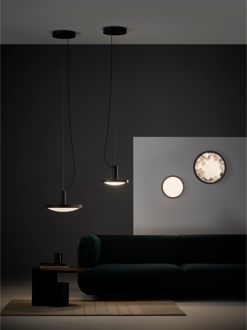 The Convex collection comprises a pendant and a wall light, each available in two sizes, whereas the wall variant can also be mounted on the ceiling. Choose from clear triplex opal, or a combination of clear triplex opal and grey triplex opal, where the darker fragments gradually transition to lighter towards the centre of the glass.