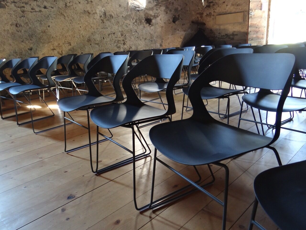 Shell in polypropylene, with seat upholstered or fully upholstered. Sled base in chromed or powdercoated steel.