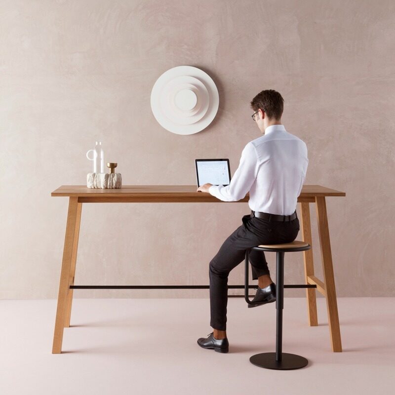 The Oxton family of tables is characterised by simple lines that highlight the handcrafted quality of the woodwork in different settings. They are available with a height of 74 cm or 110 cm and in numerous dimensions, square and rectangular, with bases in oak and tops in wood or laminate, with the possibility of adding office equipment.