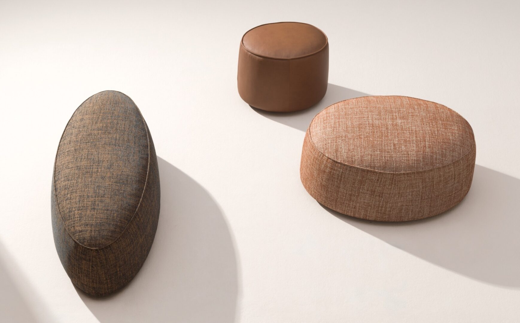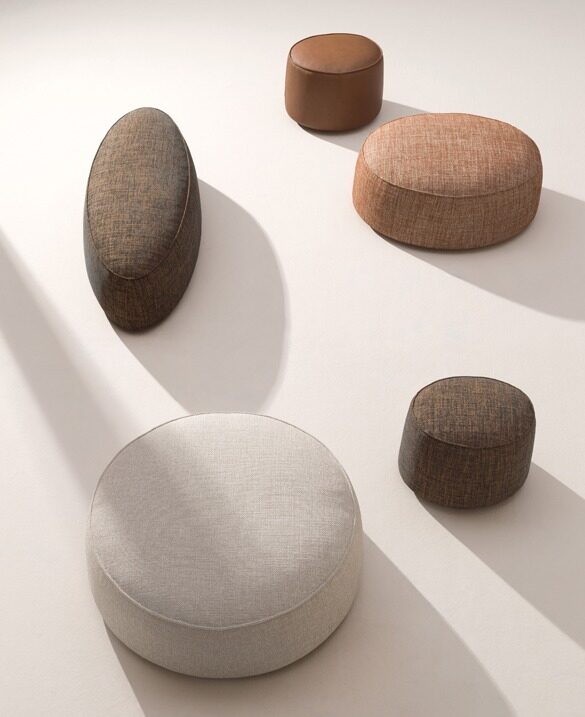 These upholstered appear as small, natural elements scattered in space. Available in various shapes, they have a raised trim that emphasises their form. They can be used in multiple ways: as a set-down surface, a footstool or as a place to sit.