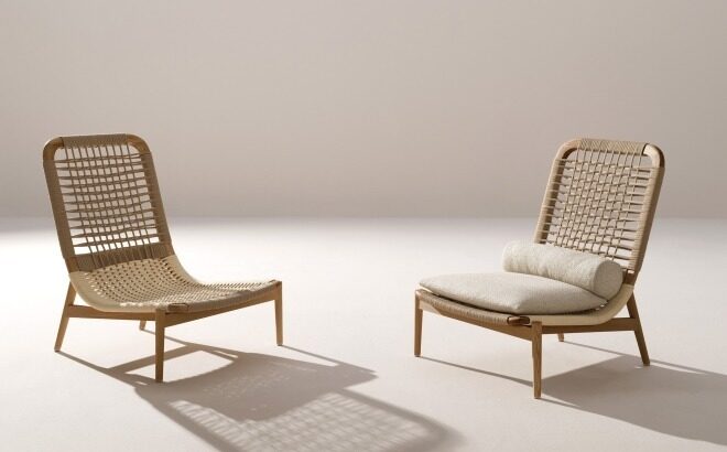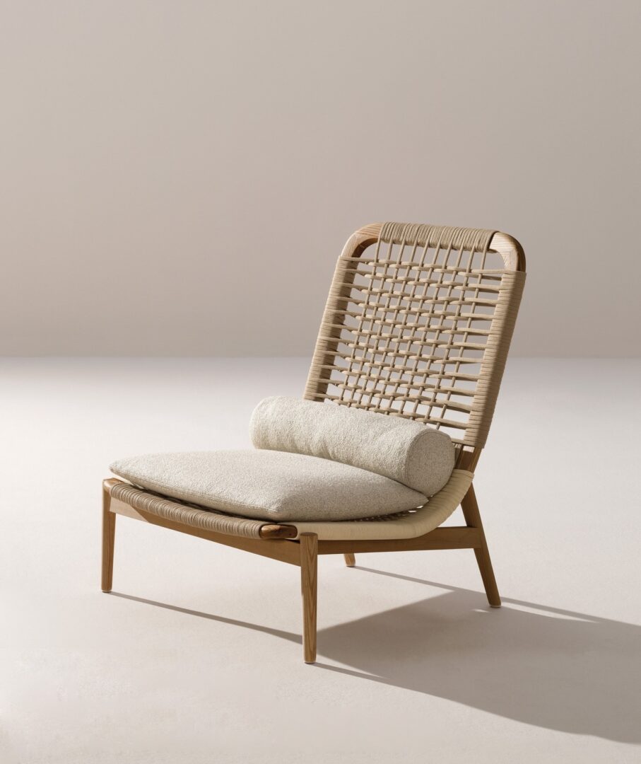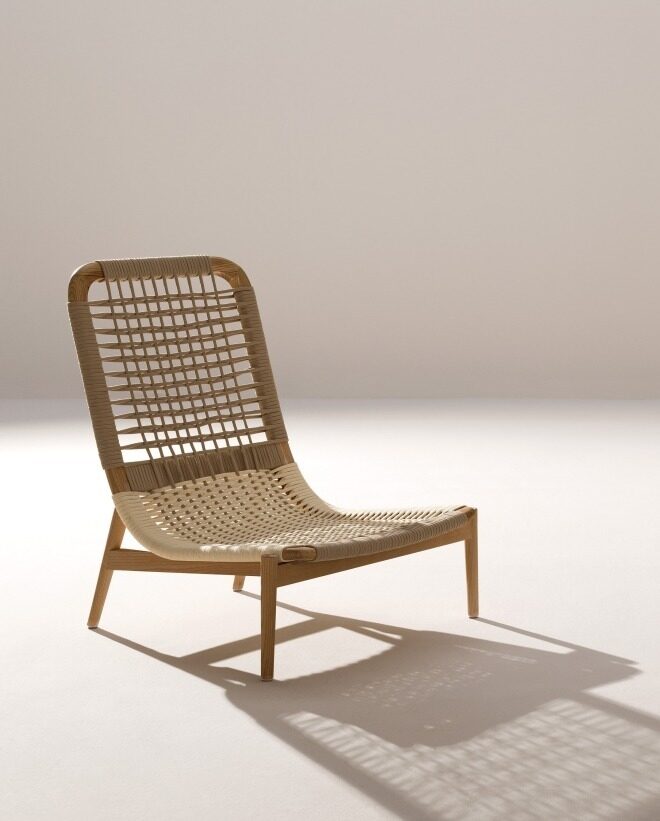 The outdoor version of the Eben armchair has a natural iroko wood frame, with a handmade polyester rope weave. The backrest is rounded to accommodate the seat, in a single essential and graceful stroke that encompasses, like a parenthesis, form and function. The cushion is made of padding and water-repellent polyester fibre cloth.