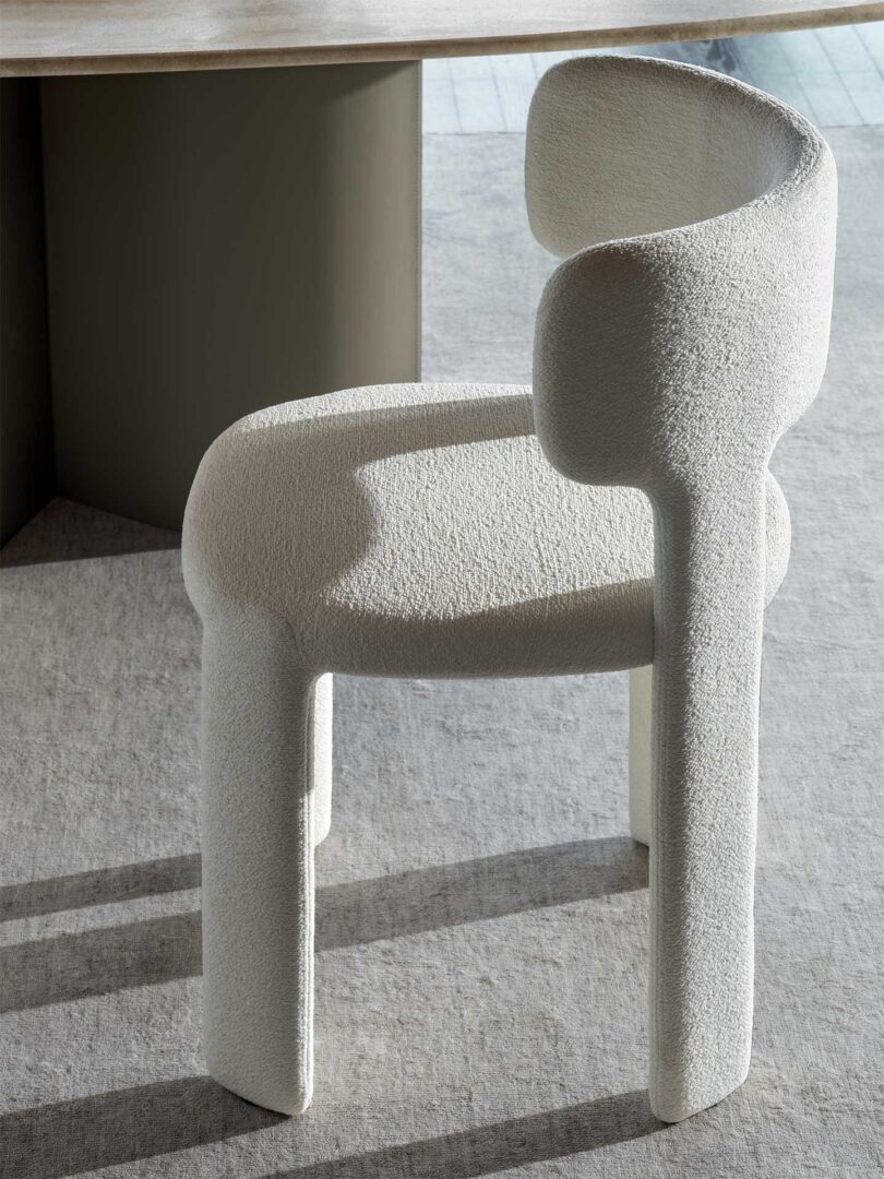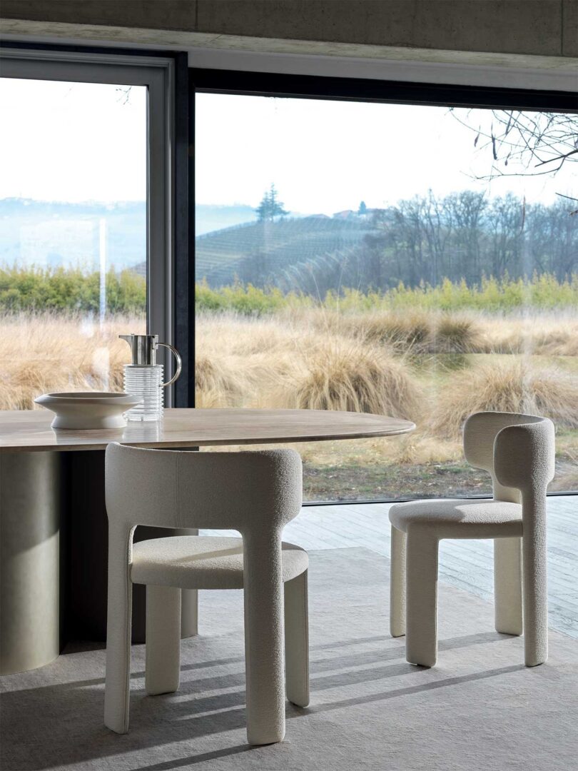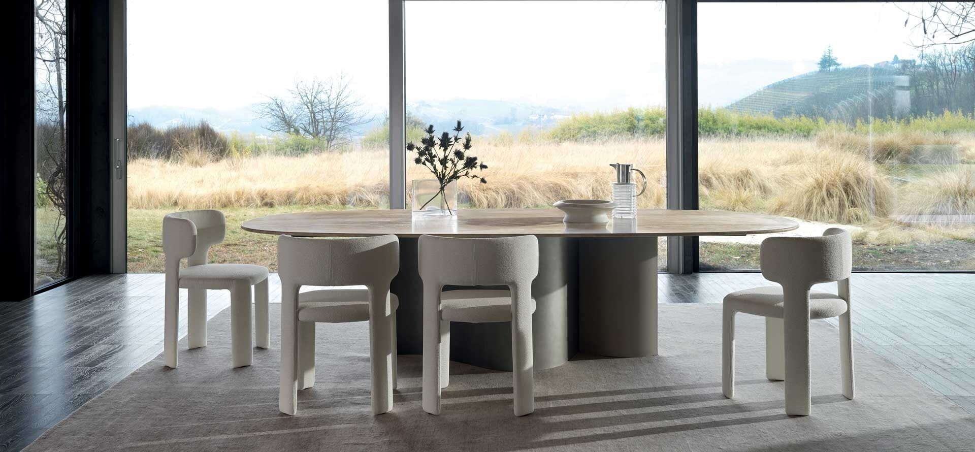 A fully upholstered chair, soft and enveloping yet light at the same time. With Lucy, designers E-ggs shine the spotlight on the fabric, which covers the entire seat down to the ground, and play around with solids and voids, geometrical volumes and rounded lines to create a chair that is comfortable without being clunky. The backrest, armrests and back legs combined in a single element enhance the sensation of comfort.