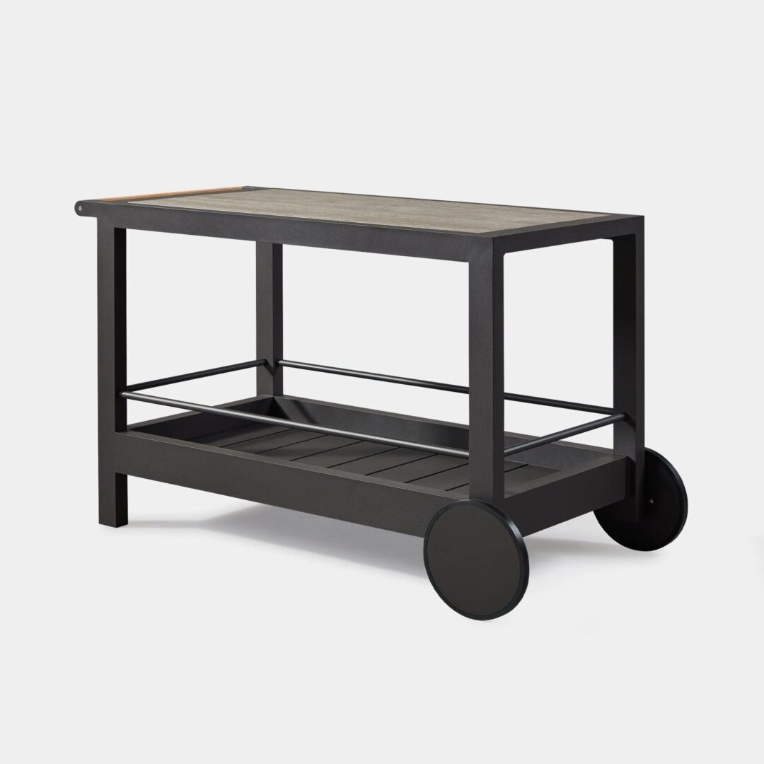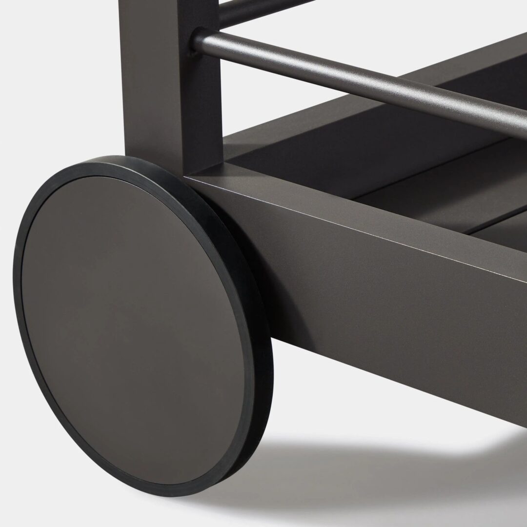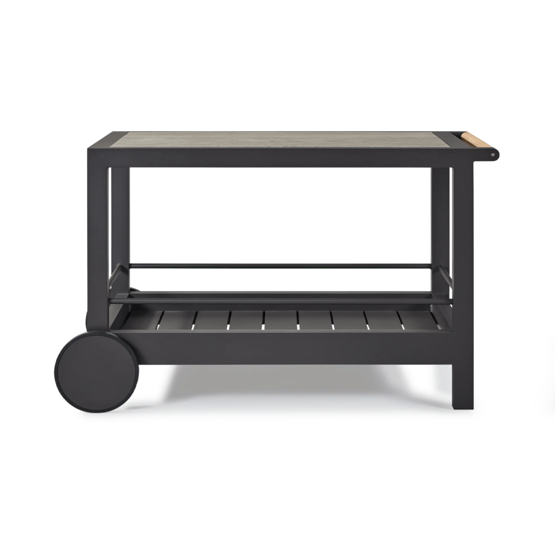 Our Tavola collection is made for al fresco entertaining. An all–weather update to the bar cart, the Tavola Bar Cart was designed for outdoor living — featuring a choice of slatted extruded aluminum construction or an inset travertine stone top, with a solid teak handle for visual contrast and wheels on one side for easy movement. Generous in size, this exceptionally crafted cart can double as a serving station or outdoor storage for both casual use and larger parties — making it an outdoor essential.