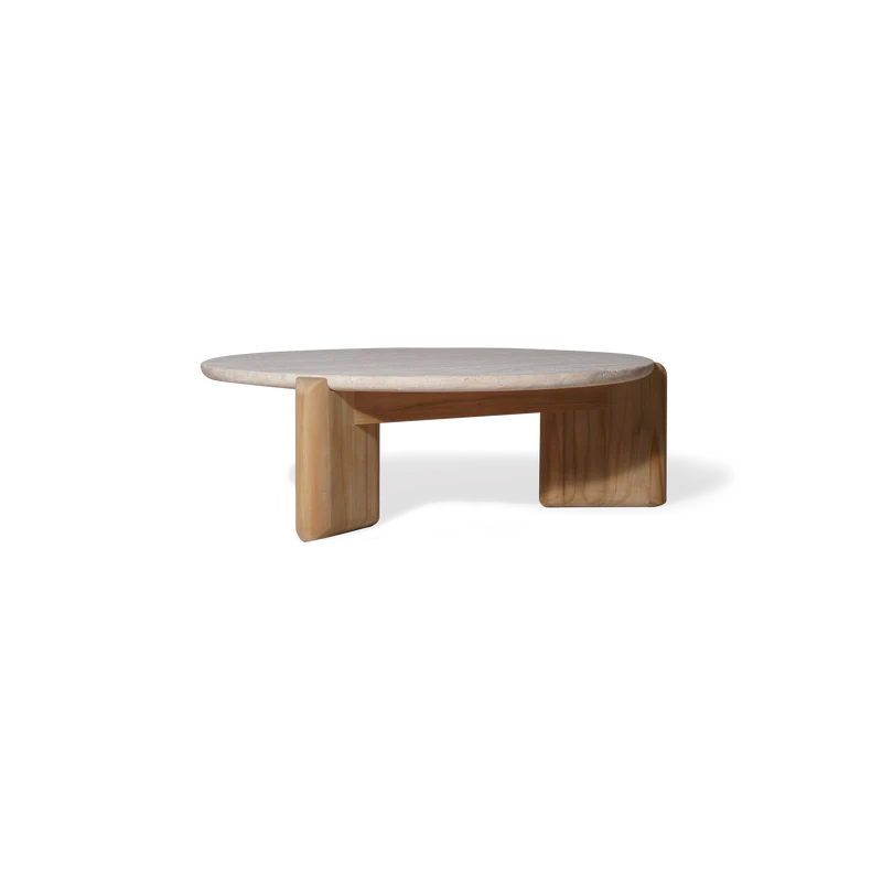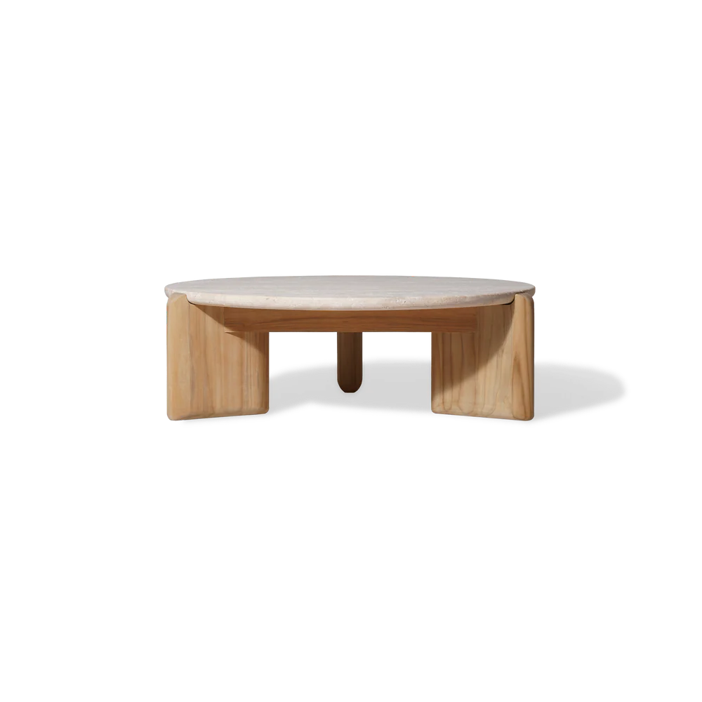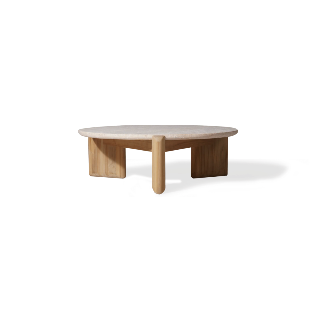 An elegant study in modern contemporary design with scale and proportion in perfect harmony. Feminine in spirit but contemporary in feel, the Chloe Round Coffee Table is a sophisticated and subtle piece—crafted in solid teak with a travertine top with a reverse rounded demi–bullnose design, it features the collection’s signature frame shape with subtle curves. From overhead, the table’s four delicately exposed legs showcase the stone top like a gemstone. With mixed materials creating a luxe and versatile design, this outdoor coffee table complements a range of styles. Also available in a rectangular style.
