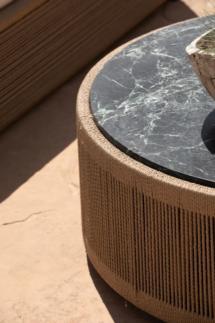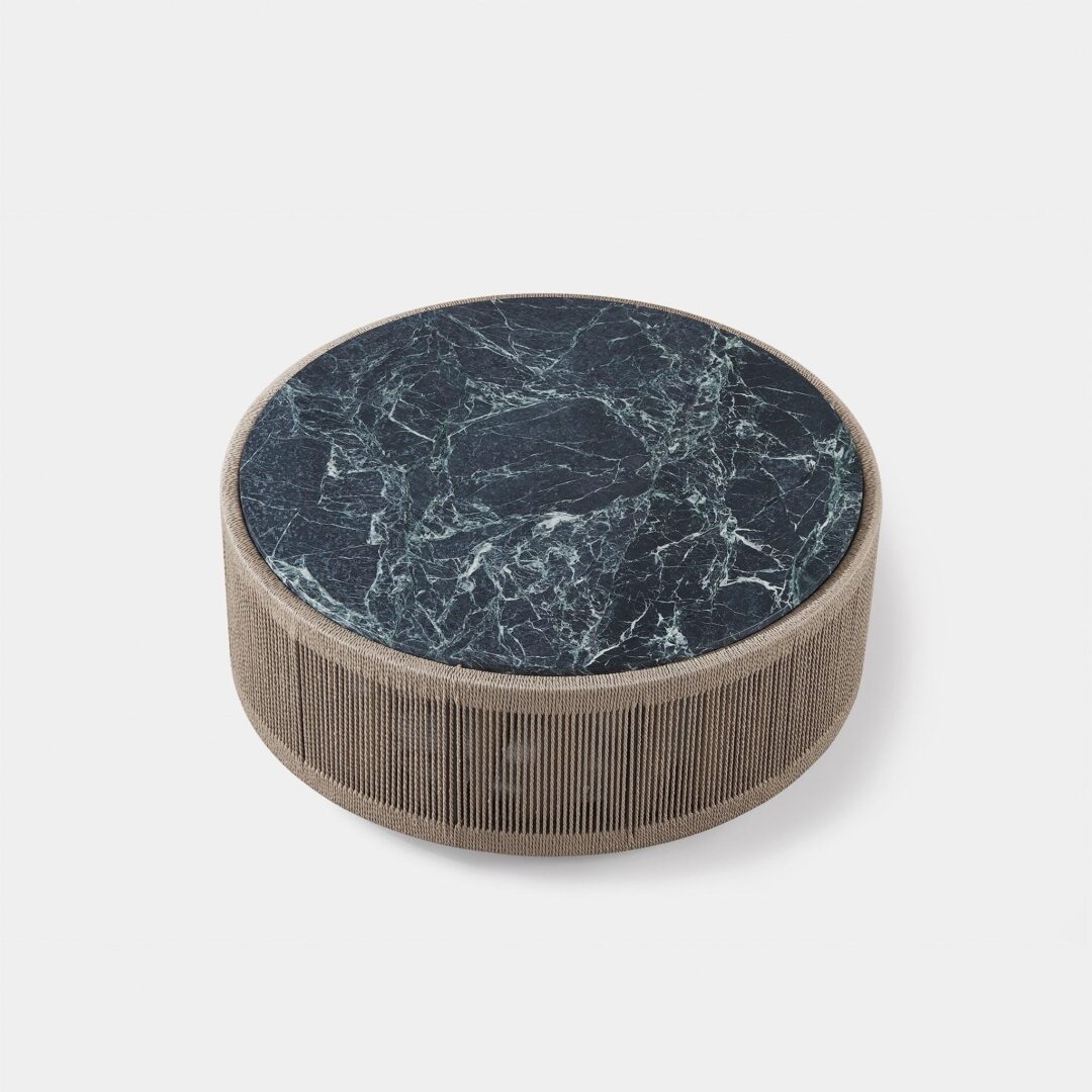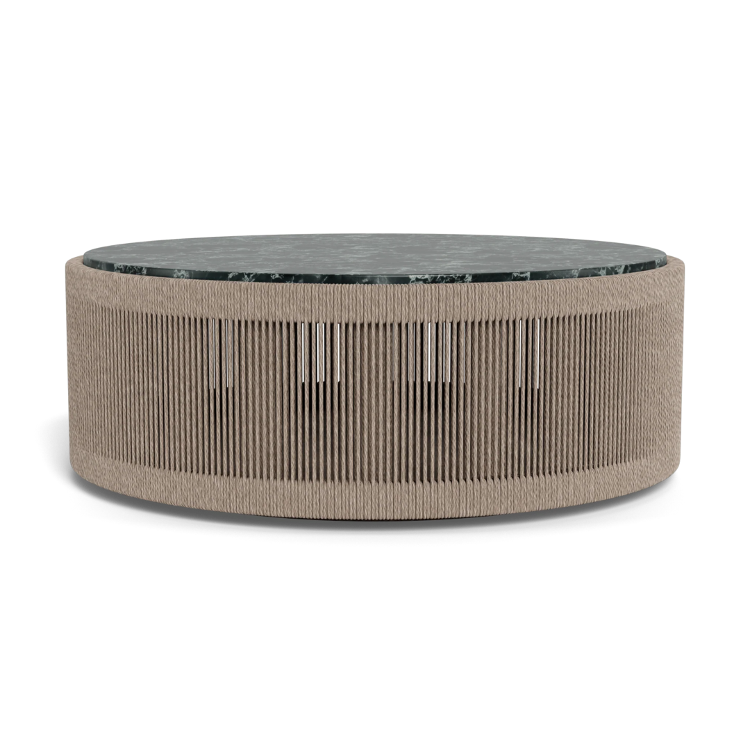 Designed by Kara Mann. Featuring exposed aluminum tube, twisted all-weather rope and deep green marble, our Formentera collection is organic luxury. The Formentera Round Coffee Table transforms traditional aesthetics for a coastal lifestyle — featuring a grounded plinth silhouette, hand woven with all-weather rope in our workshop. The rope features a twisted detail that recalls functional nautical ropes, while the vertical up-and-down pattern highlights the simplicity of form and allows light to pass through the rope onto the aluminum substructure. Topped with a stone surface in your choice of marble or travertine for an earthy detail, this piece is the perfect mix of contemporary materials for any outdoor space.