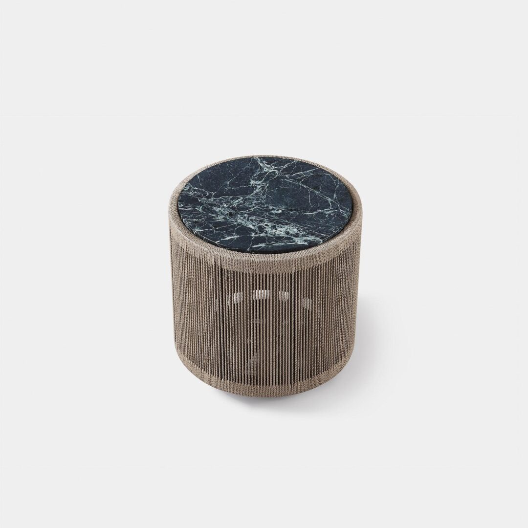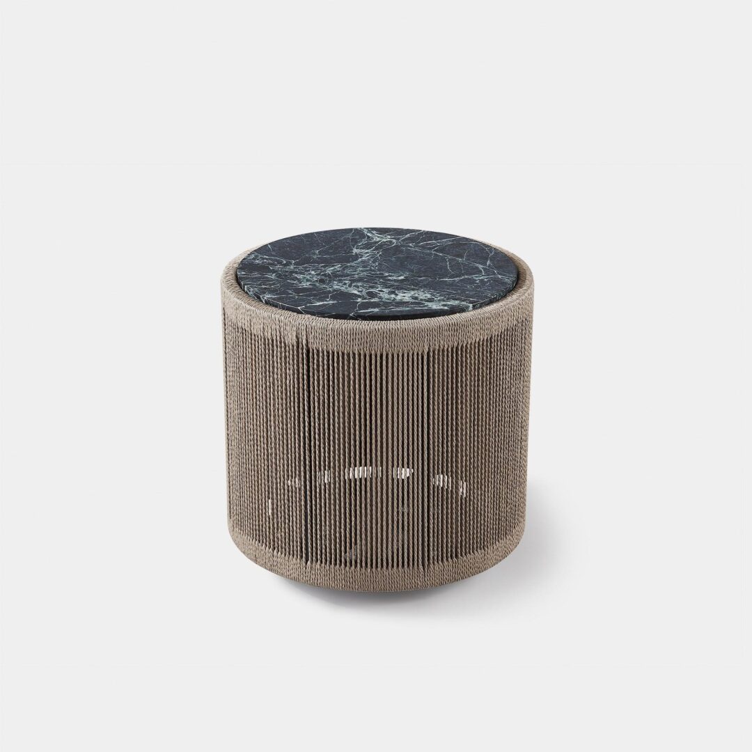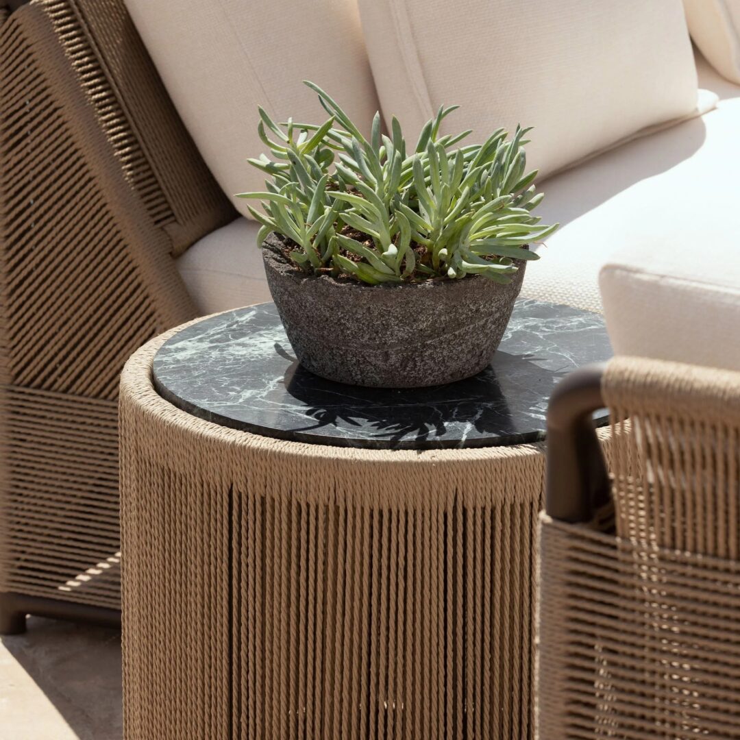 Designed by Kara Mann. Featuring exposed aluminum tube, twisted all-weather rope and deep green marble, our Formentera collection is organic luxury. The Formentera Round Side Table transforms traditional aesthetics for a coastal lifestyle — featuring a grounded plinth silhouette, hand woven with all-weather rope in our workshop. The rope features a twisted detail that recalls functional nautical ropes, while the vertical up-and-down pattern highlights the simplicity of form and allows light to pass through the rope onto the aluminum substructure. Topped with a stone surface in your choice of marble or travertine for an earthy detail, this piece is the perfect mix of contemporary materials for any outdoor space.