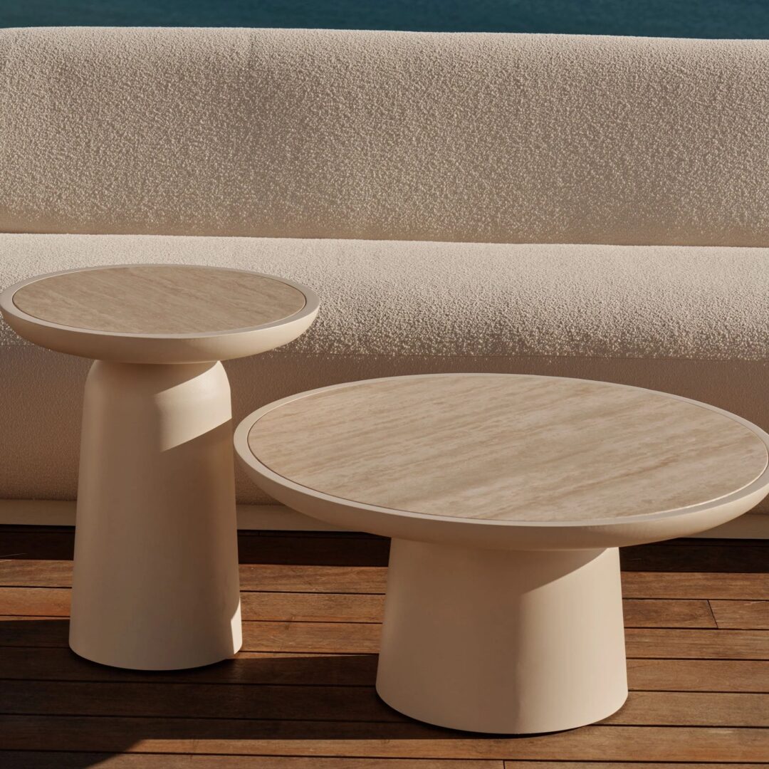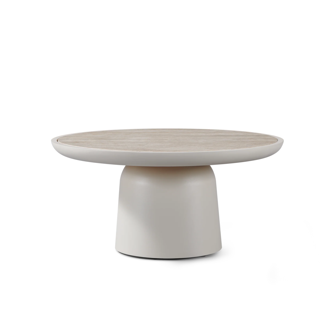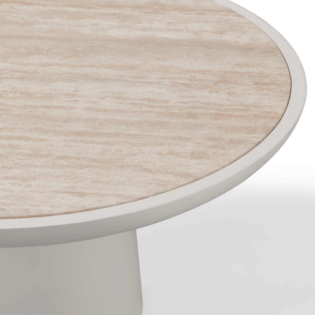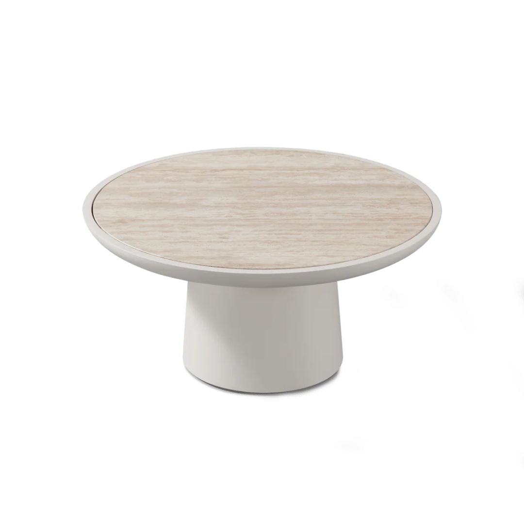 Sculptural simplicity echoes midcentury design in our Nova collection, where sleek and sophisticated lines provide an understated foundation for the contrasting textures of aluminum and travertine. The mixed–material Nova Round Nesting Coffee Table 30" anchors your outdoor seating set — featuring a powder coated aluminum base in Aluminum Bone with an inset travertine top in Natural. Enjoy the option to nest this piece with the collection's other tables to create layers and interest or let it make a statement on its own. Our mid–sized coffee table of the collection, this piece adds a refined touch to your outdoor space.