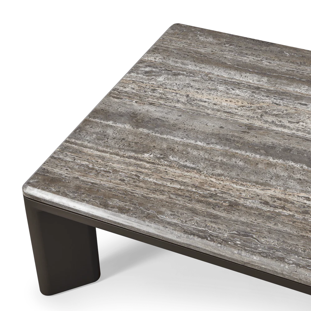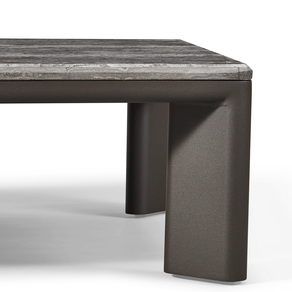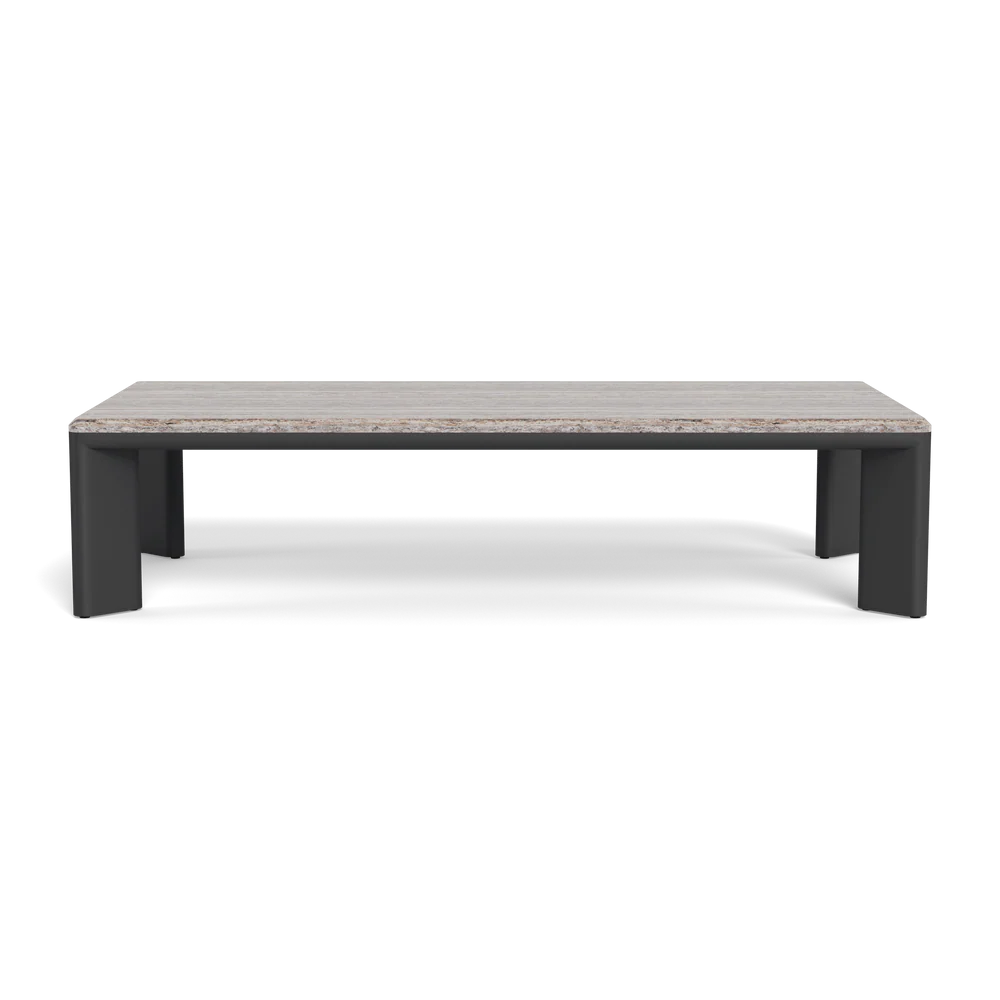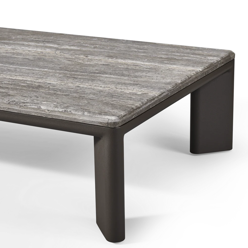 A nod to Sydney's iconic Palm Beach with its stately coastal pines. Rounded backs, vertical rope detailing and a harmonious mix of materials infuse classic silhouettes with modern elegance. Transitional in spirit, the Palm Beach Aluminum Rectangle Coffee Table is a refreshing update to our signature classics—a Parsons-style table crafted in solid teak, angled legs support a travertine top and spotlight a simple, but very thoughtfully connected, design. With mixed materials creating a luxe and dimensional design, this outdoor coffee table is perfect for entertaining and complements a range of styles.