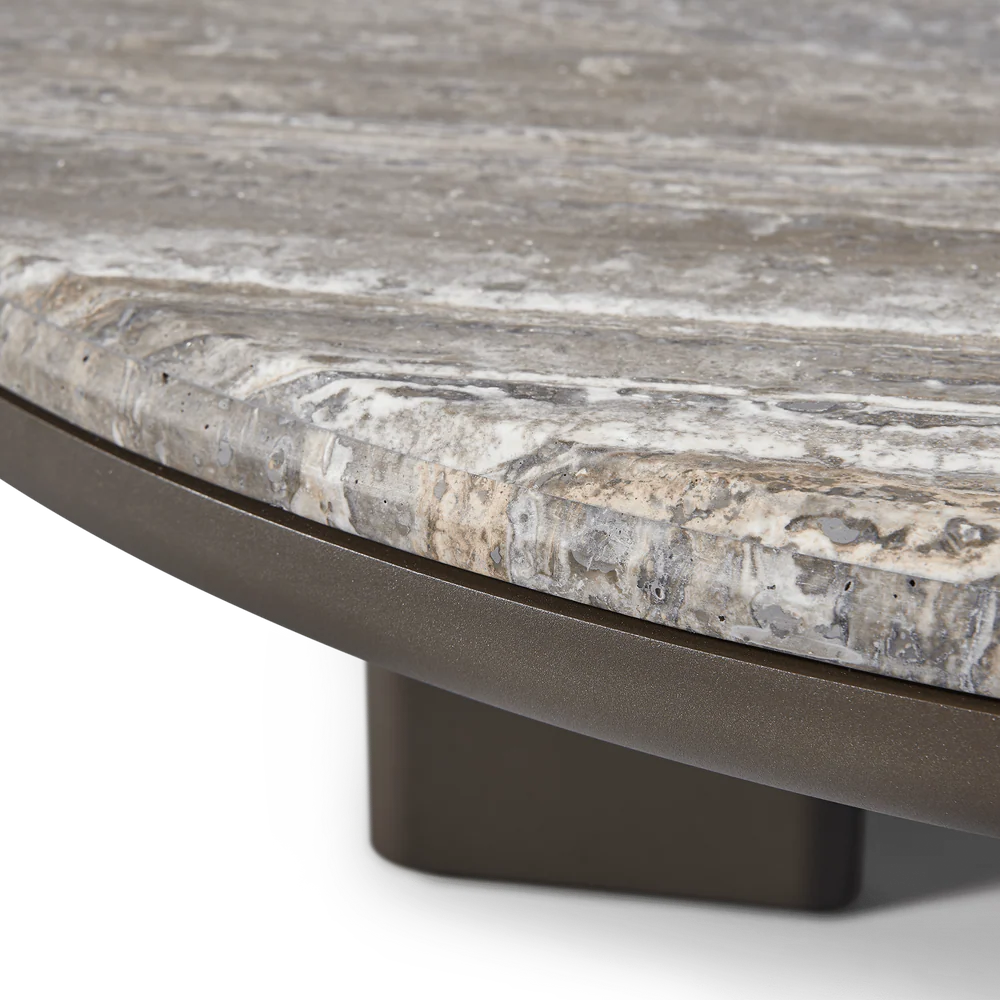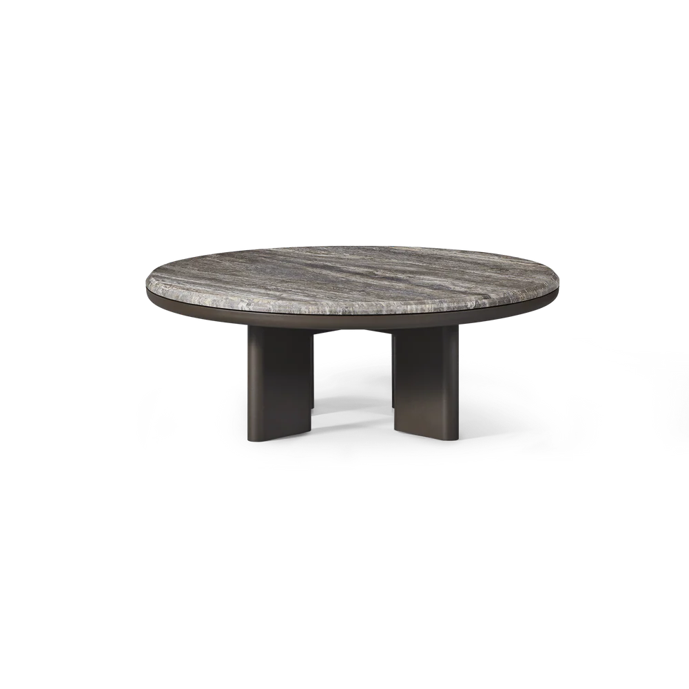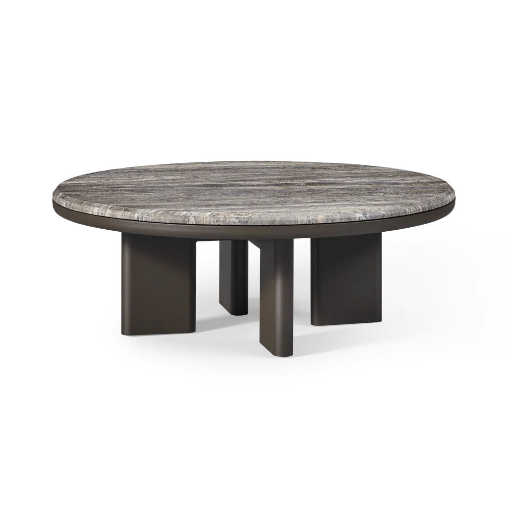 A nod to Sydney's iconic Palm Beach with its stately coastal pines. Rounded backs, vertical rope detailing and a harmonious mix of materials infuse classic silhouettes with modern elegance. Transitional in spirit, the Palm Beach Aluminum Round Coffee Table is a refreshing update to our signature classics—a Parsons-style table crafted in solid teak, angled legs support a travertine top and spotlight a simple, but very thoughtfully connected, design. With mixed materials creating a luxe and dimensional design, this outdoor coffee table is perfect for entertaining and complements a range of styles.