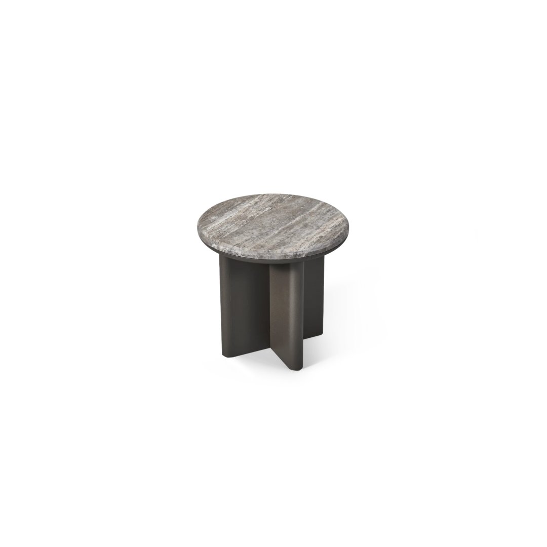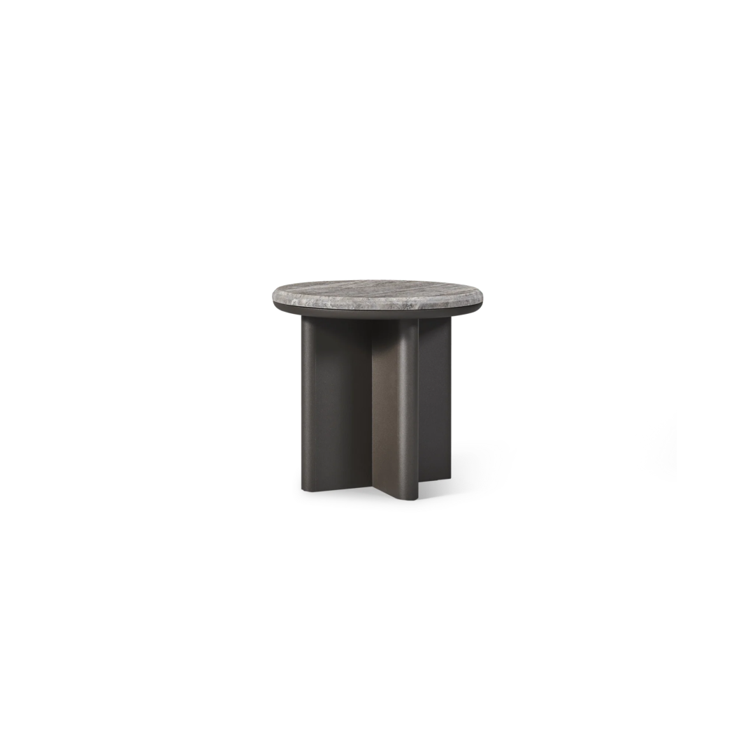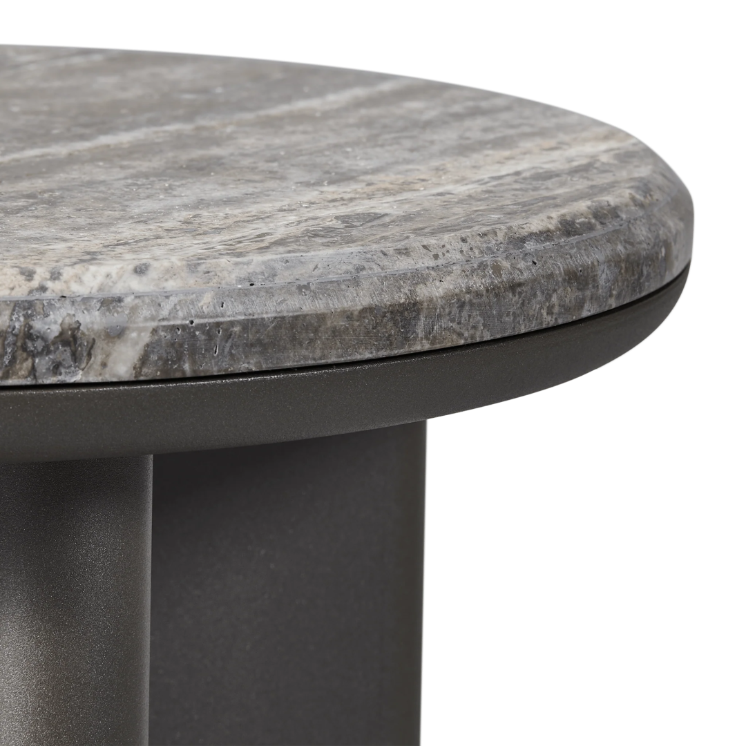 A nod to Sydney's iconic Palm Beach with its stately coastal pines. Rounded backs, vertical rope detailing and a harmonious mix of materials infuse classic silhouettes with modern elegance. Transitional in spirit, the Palm Beach Aluminum Round Side Table is a refreshing update to our signature classics—crafted in solid teak, crossed plank legs support a travertine top and spotlight a simple, but very thoughtfully connected, design. With mixed materials creating a luxe and dimensional design, this outdoor side table is perfect for entertaining and complements a range of styles.