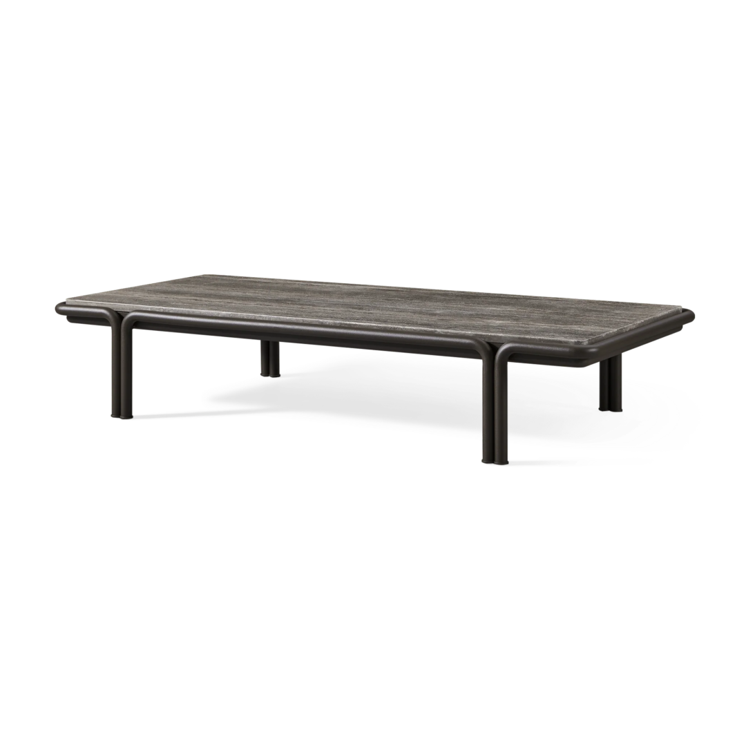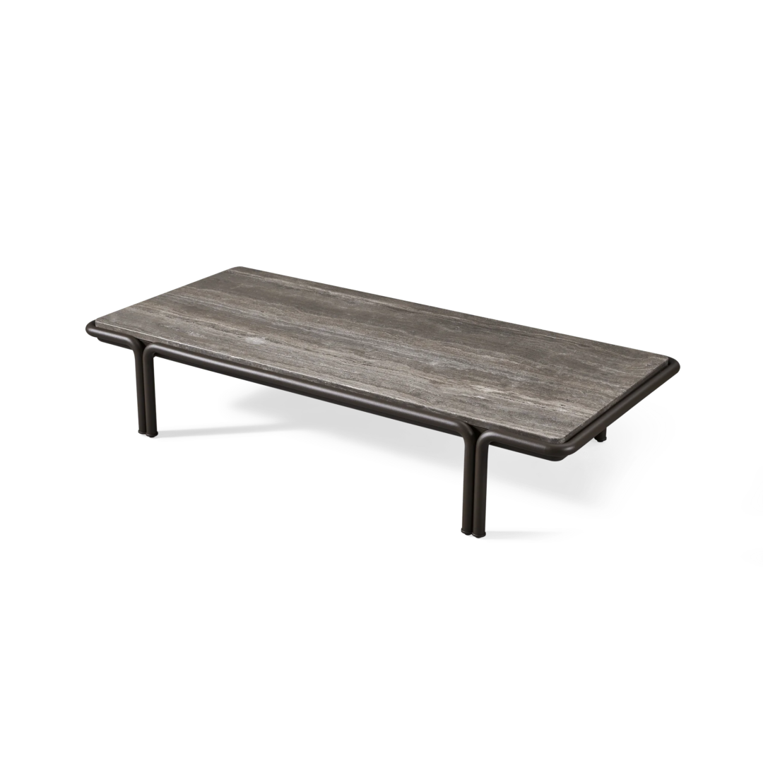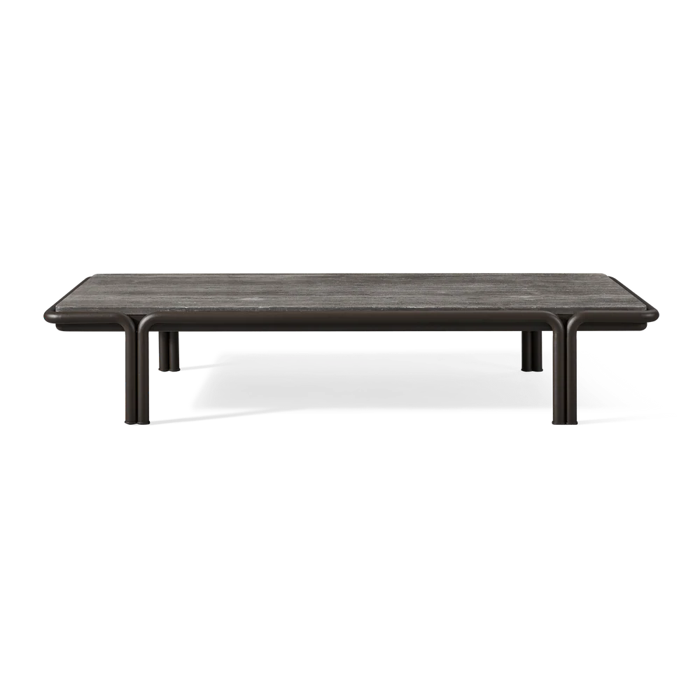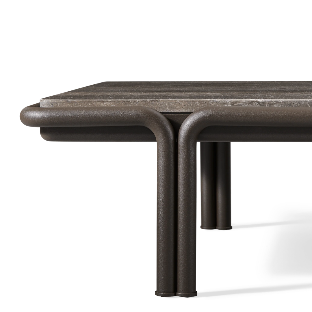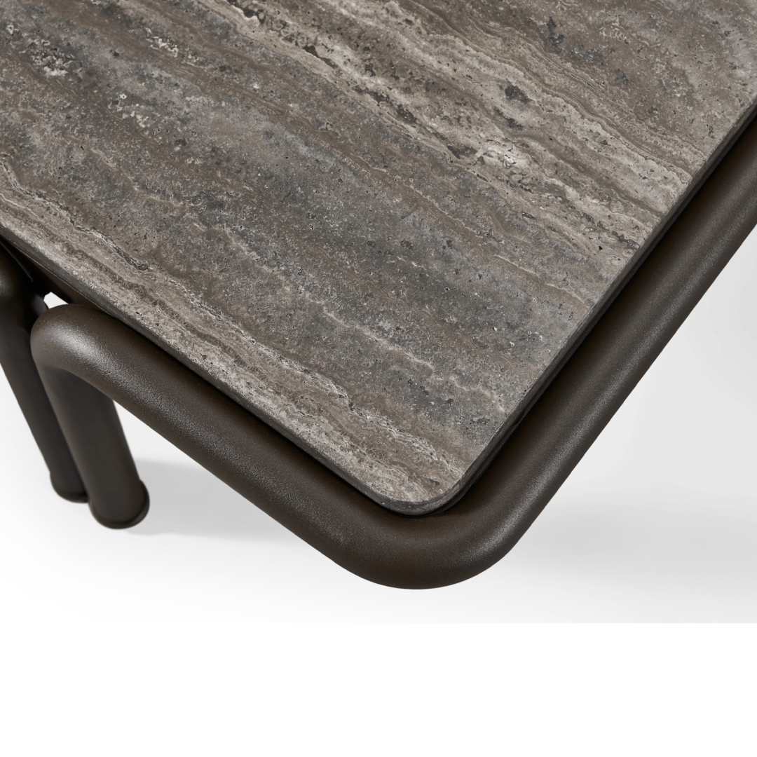 Tubular bronze aluminum, thick strapping and refined piping effortlessly update mid-century charm with contemporary sophistication for any outdoor space. The Parker Rectangle Coffee Table is a bold design statement—crafted in tubular bonze powder coated aluminum with natural slabs of grey travertine stone, reinforced with our aluminum honeycomb structure. The legs mirror the collection's tubed details, where legs merge beautifully with backs, here creating a nice double leg detail with a subtle curve. With mixed materials creating a luxe and versatile design, this outdoor coffee table complements a range of styles.