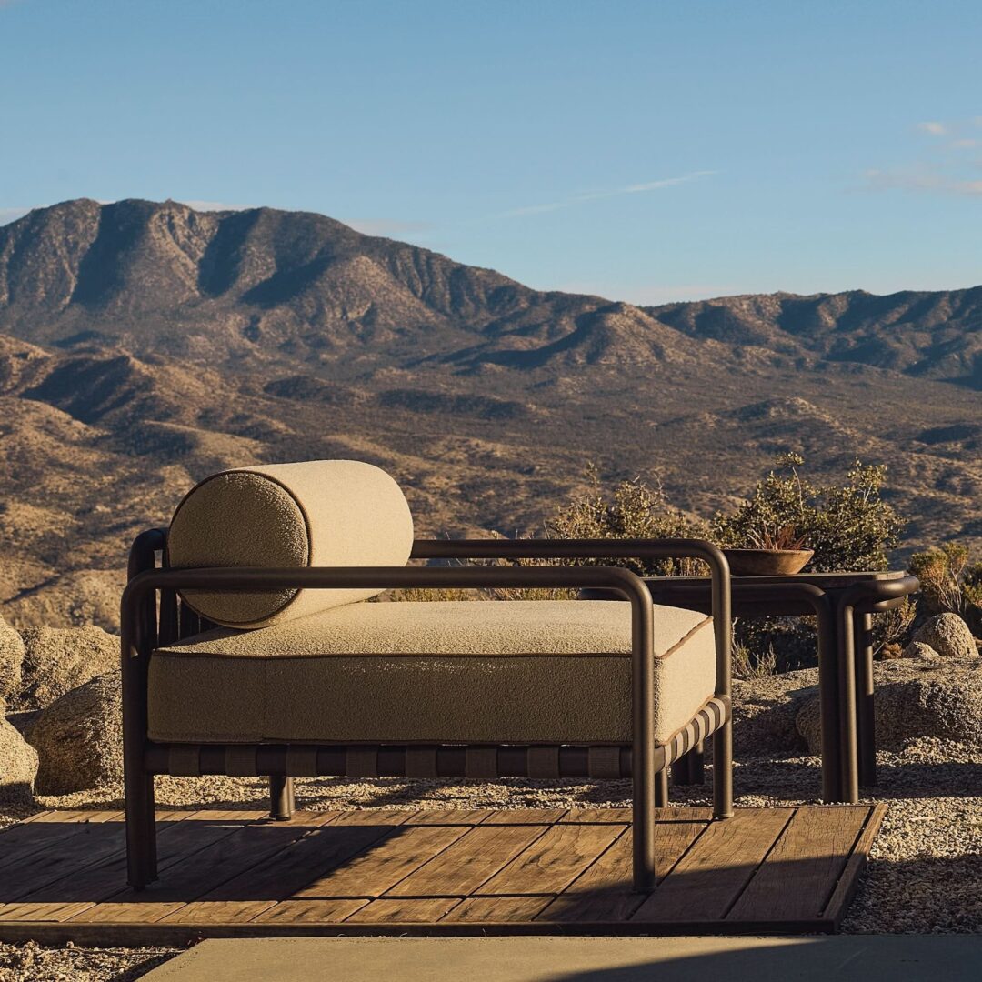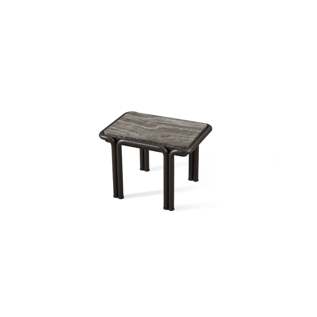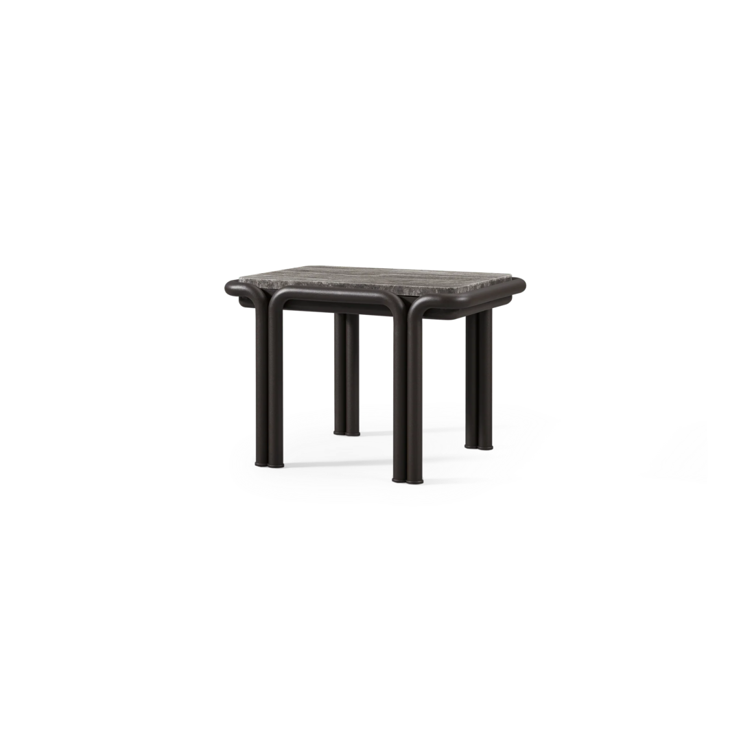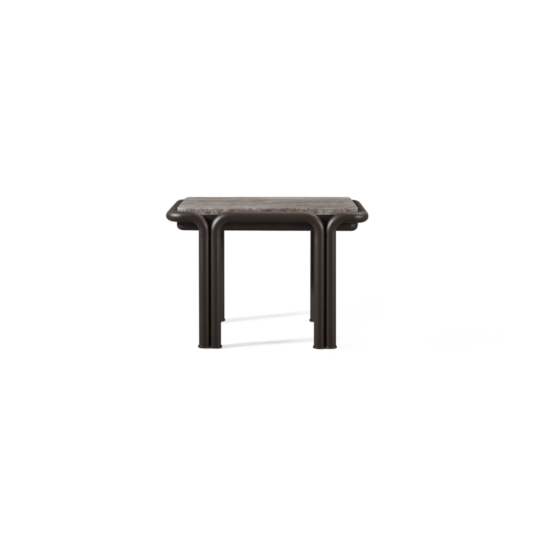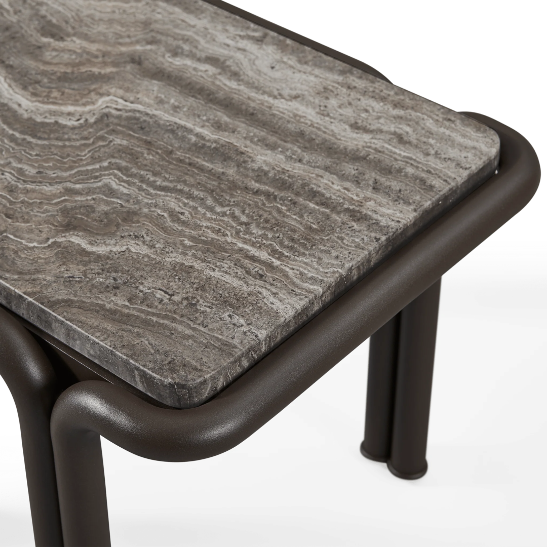 Tubular bronze aluminum, thick strapping and refined piping effortlessly update mid-century charm with contemporary sophistication for any outdoor space. The Parker Side Table is a bold design statement—crafted in tubular bonze powder coated aluminum with natural slabs of grey travertine stone, reinforced with our aluminum honeycomb structure. The legs mirror the collection's tubed details, where legs merge beautifully with backs, here creating a nice double leg detail with a subtle curve. With mixed materials creating a luxe and versatile design, this outdoor side table complements a range of styles.