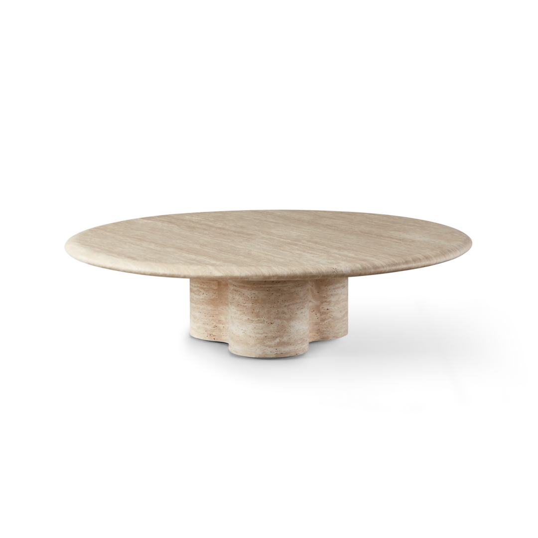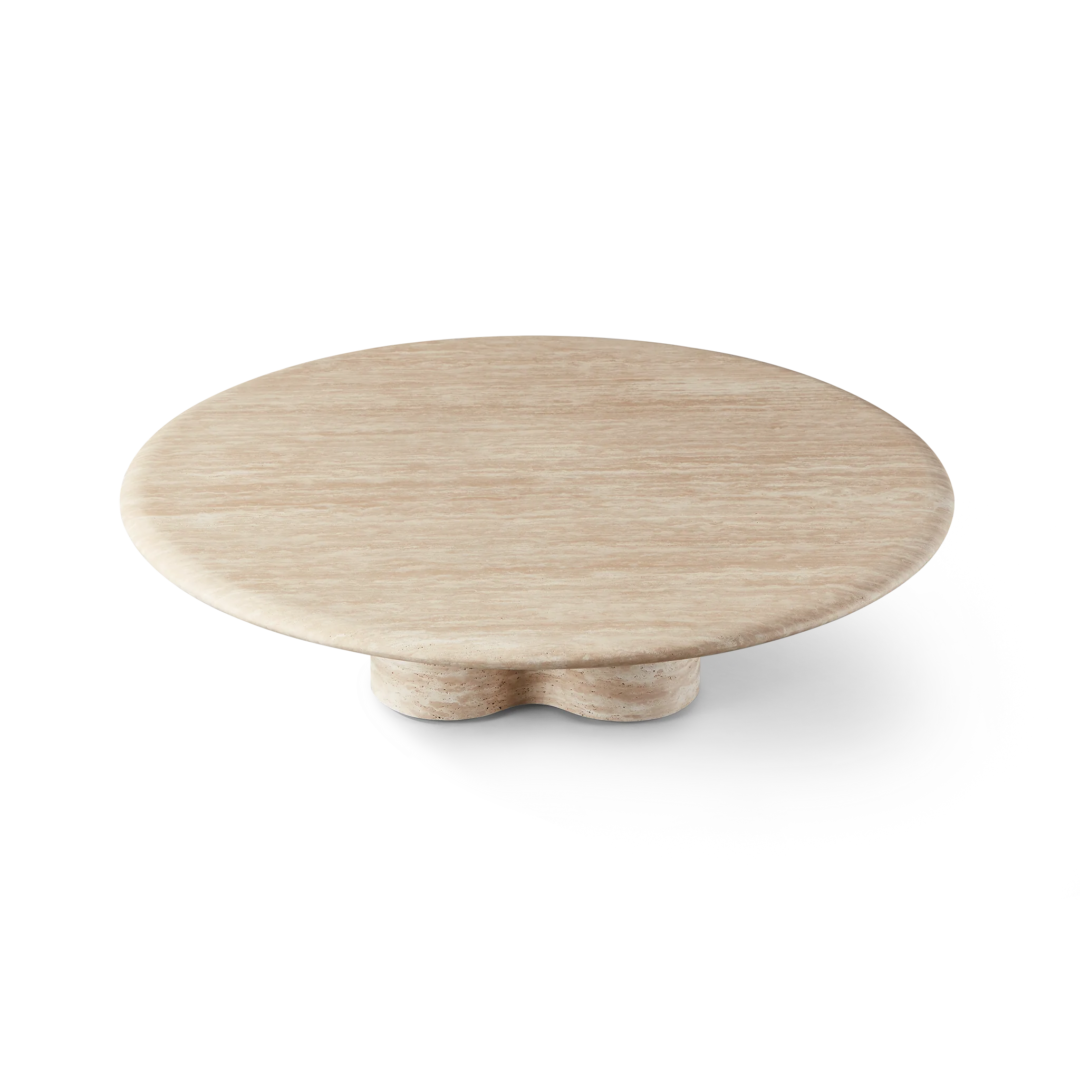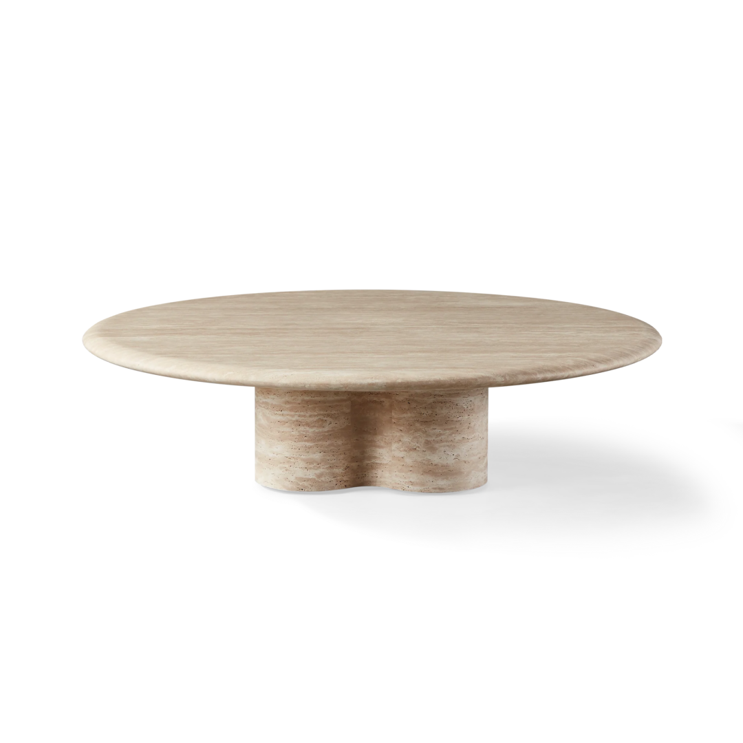 A contemporary and classic study in soft curves, our Porto collection creates a natural interplay between shadow and light with sculptural forms in the base. The mixed–material Porto Round Coffee Table 48" anchors your outdoor seating set — featuring a single robust travertine base suspending an organic travertine stone top all in Natural with a gentle, sloping bullnose edge. The compact circular shape of the table top pairs nicely with a variety of configurations and vignettes. This unique outdoor coffee table elevates a variety of spaces. Also available in an aluminum base.