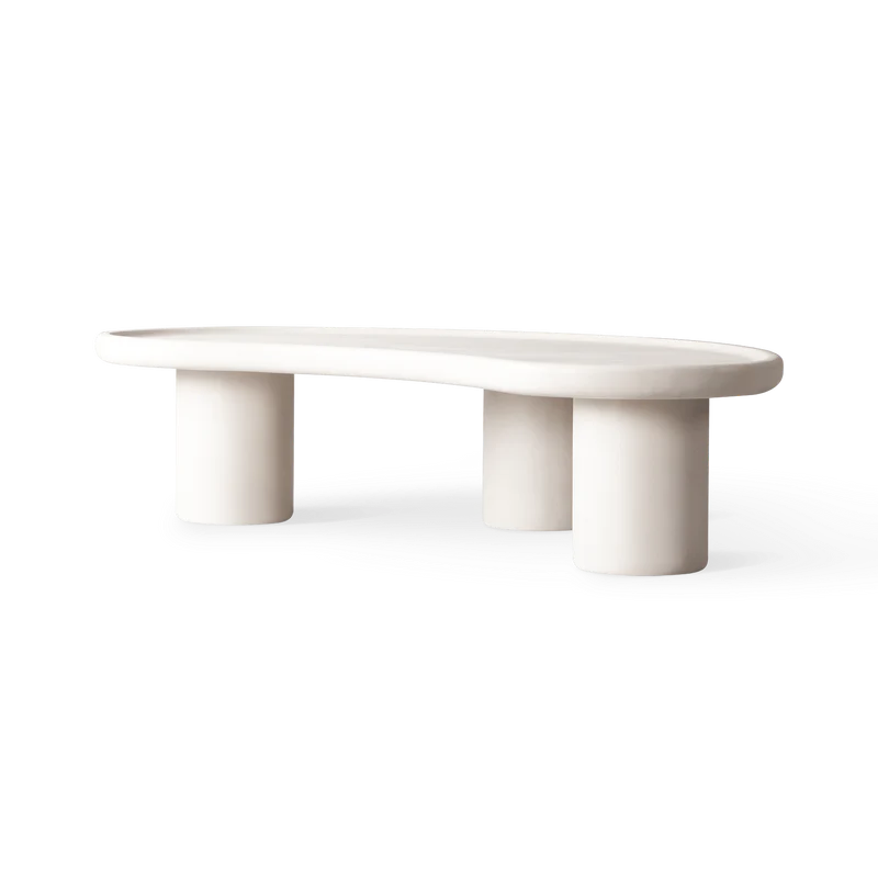 Crafted from an innovative concrete composite, these soft, sculptural nesting tables boast a chalky limestone finish that recalls the ancient white limestone cliffs that inspired their name. The Scala Organic Nesting Coffee Table showcases a new design in a brand-new material—poured into our custom molds, Composite Concrete - Salt assumes fluid and organic shapes while maintaining the strength suitable for the outdoors. Part of a trio of tables, this table is designed in a kidney shape with three legs and meant to be clustered with the collection's other pieces to curate overlapping shapes alongside your seating configuration. A harmony of soft shapes and edges, this outdoor coffee table elevates your outdoor entertaining with a unique, design-forward touch. Our custom outdoor covers are strongly recommended as an extra layer of protection against the elements and natural aging Adjustable non-marring nylon floor glides