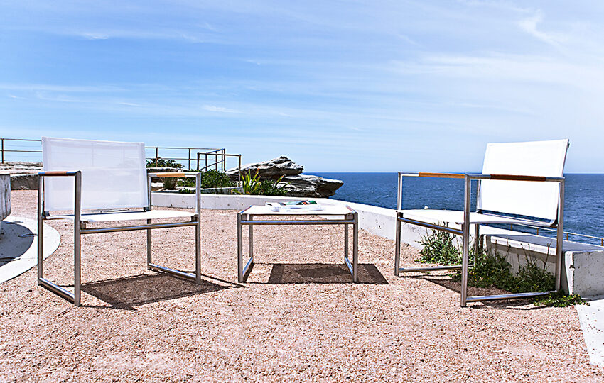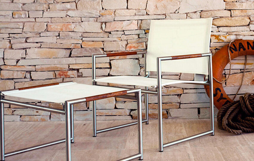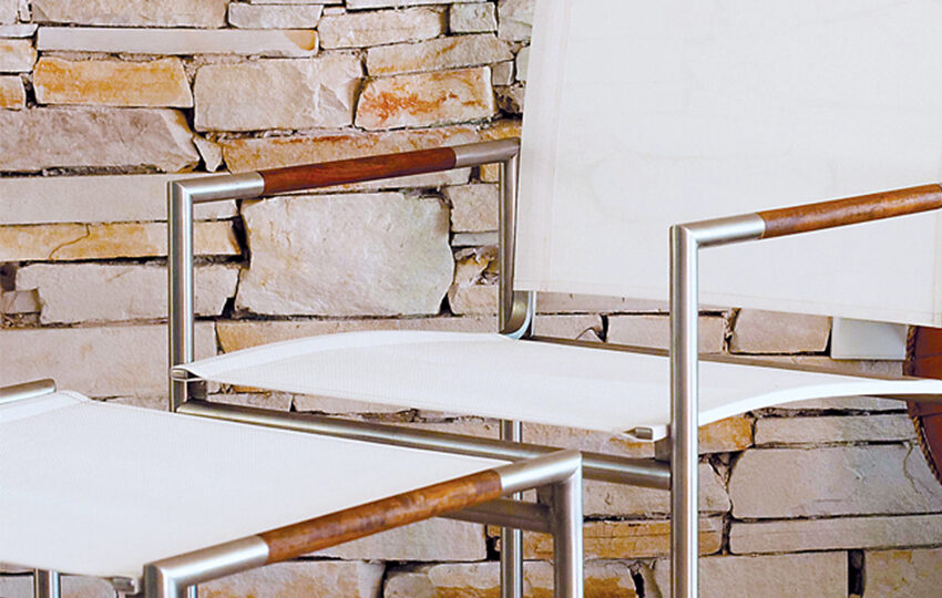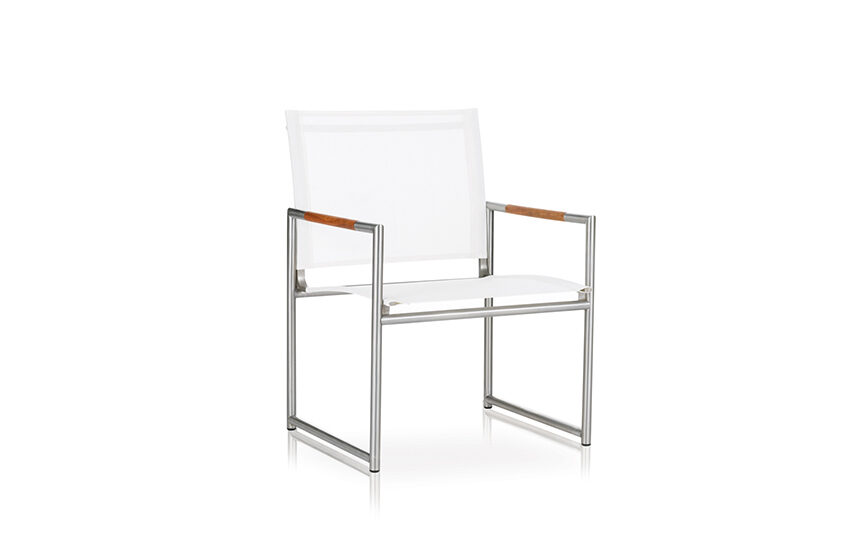 The smaller brother to our Breeze XL collection, our Breeze line mixes thin tubular aluminum construction with solid teak accents for an alluring simplicity. The lower and wider version of our Dining Chair, the sleek Breeze Club Chair is modern comfort — with an all–weather Batyline sling seat and back for support and easy cleaning. This elegant piece is made for smaller spaces and casual lounge seating.