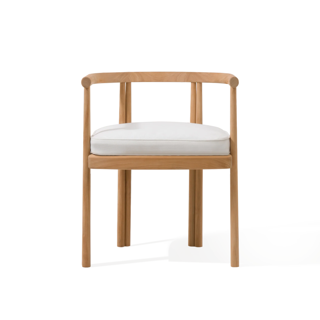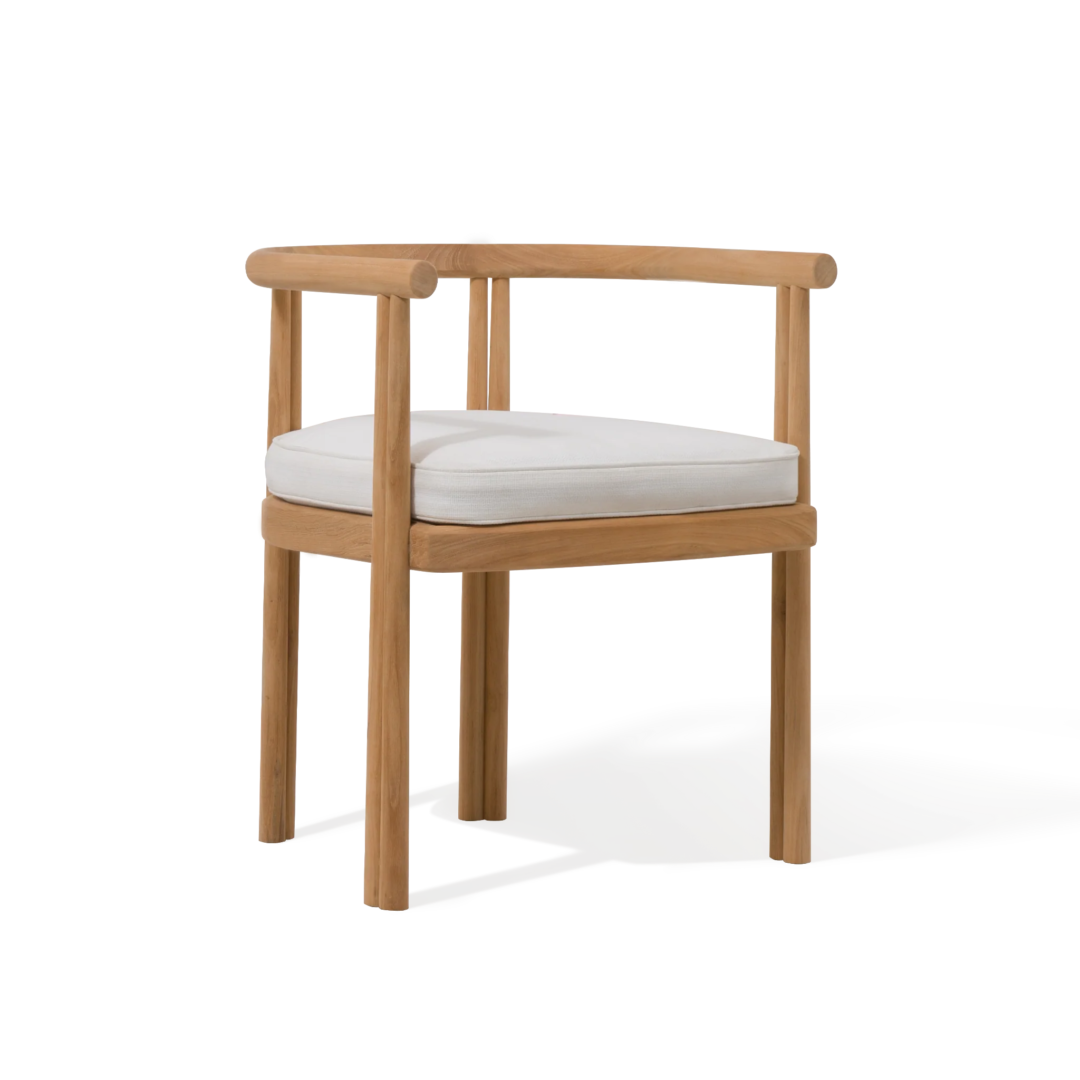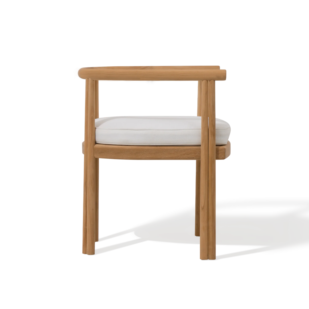 Influenced by modern Australian architecture and landscapes, our refined Cove collection features special details like double cylindrical legs and curved edges that create soft sculptural silhouettes. The Cove Dining Chair is contemporary comfort — featuring a refined solid teak frame in Natural with an architectural double leg detail and striking curved back. Enjoy a plush all–weather cushion in Copacabana Natural that invite sink–in comfort. Tracery and light with a footprint to match, this comfort–driven outdoor dining chair is a versatile design element for any space and effortlessly coordinates with the matching side chair. Pair it with any table to complete the outdoor dining set.