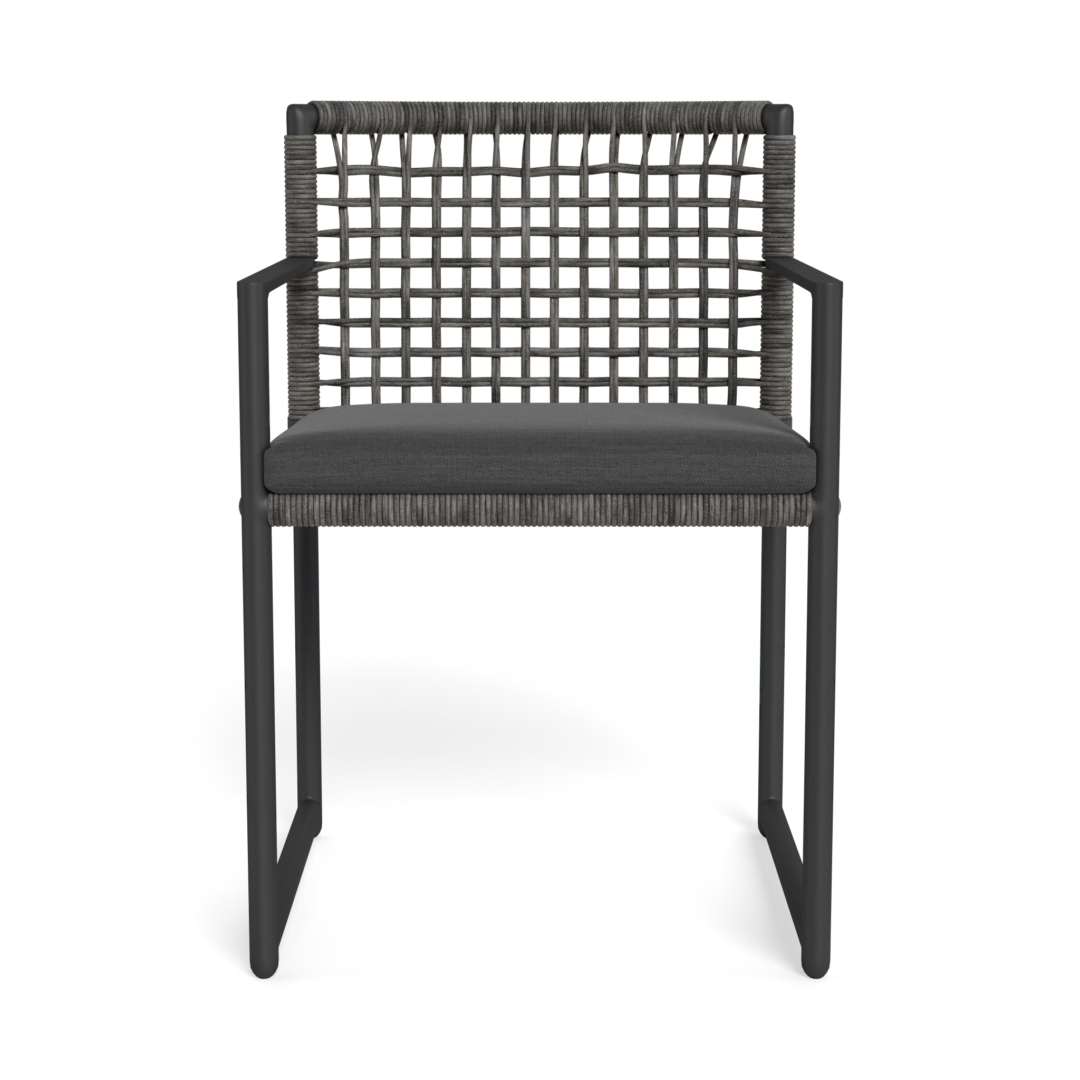 Our Loop collection blends clean angled lines with the grid of the wicker to create a namesake looping design. The Loop Dining Chair is the perfect match for your outdoor dining set — enjoy a plush cushion and a gentle curved back, part of a powder coated extruded aluminum frame. The seat and back feature an open weave all–weather wicker that balances the contemporary with the modern. Impeccably crafted and quick drying, this versatile piece completes any outdoor space.