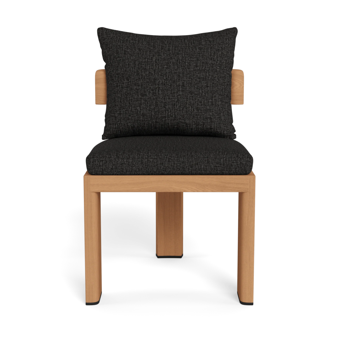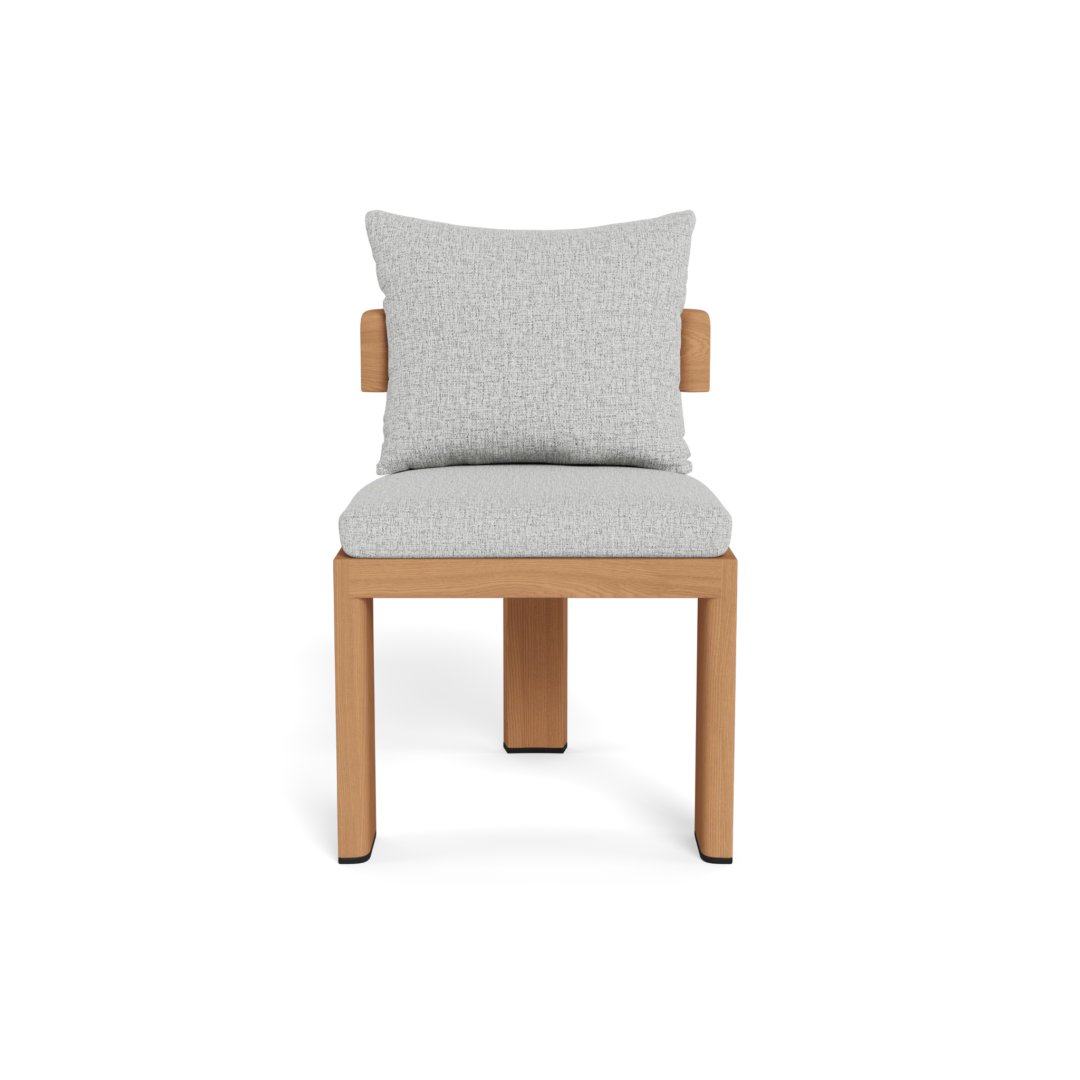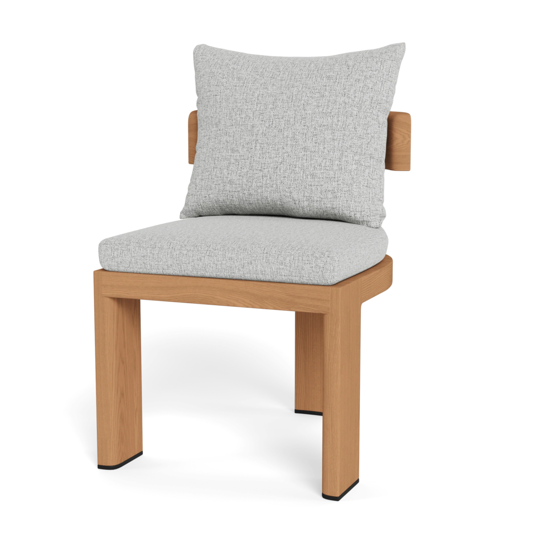 Our Victoria Teak collection balances sculptural curves and right angles for true simplicity of proportion. The perfect complement to Victoria tables, the Victoria Teak Dining Chair is our take on a mid–century tripod chair — enjoy plush all–weather seat and back cushions in a range of neutral tones supported by a slatted suspension with a striking rounded frame in solid natural Indonesian teak. Tailored and sophisticated, this contemporary armless dining chair brings harmony to a variety of outdoor spaces. Pair it with any Victoria table to complete the outdoor dining set.