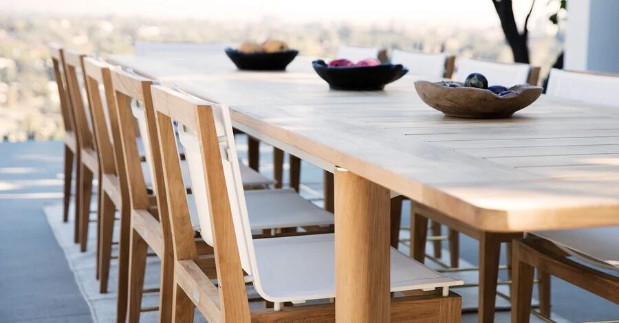 Our Byron collection blends sophisticated styling with an architectural play of angles to create exceptional design. Our star dining table, the Byron Extendable Dining Table was designed as the perfect outdoor table for up to twelve — featuring a handcrafted solid Indonesian teak frame with curved corners and legs and built–in flexibility thanks to a folding extension leaf. Brass–toned accents highlight the luxury inherent in the craft and really set this table apart. Built to last, this highly usable piece instantly enhances any space with its subtle elegance. When the table is extended, the length of the table increases to 155.1 inches, allowing for more guests to sit around the table.