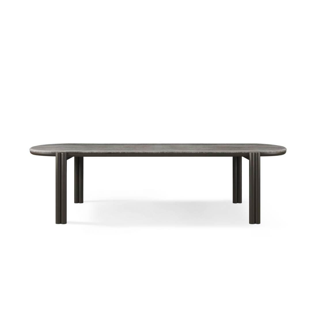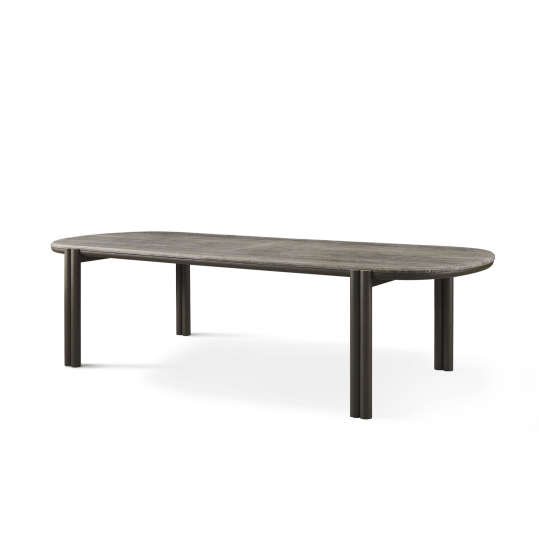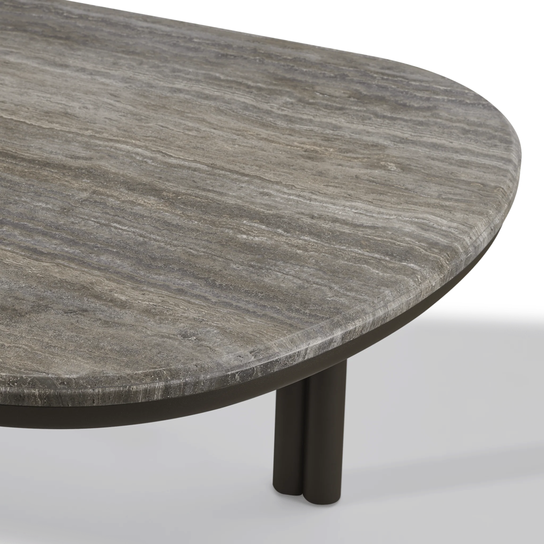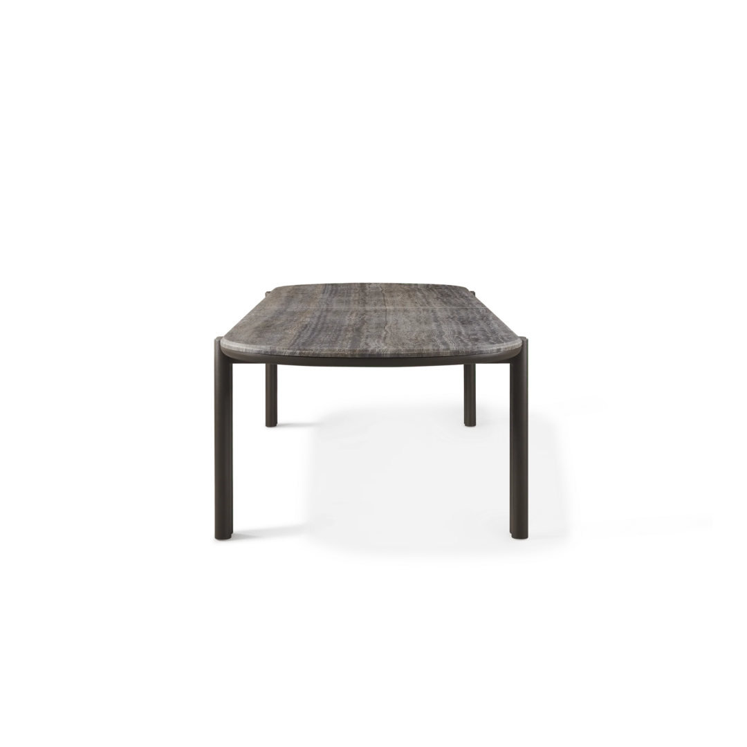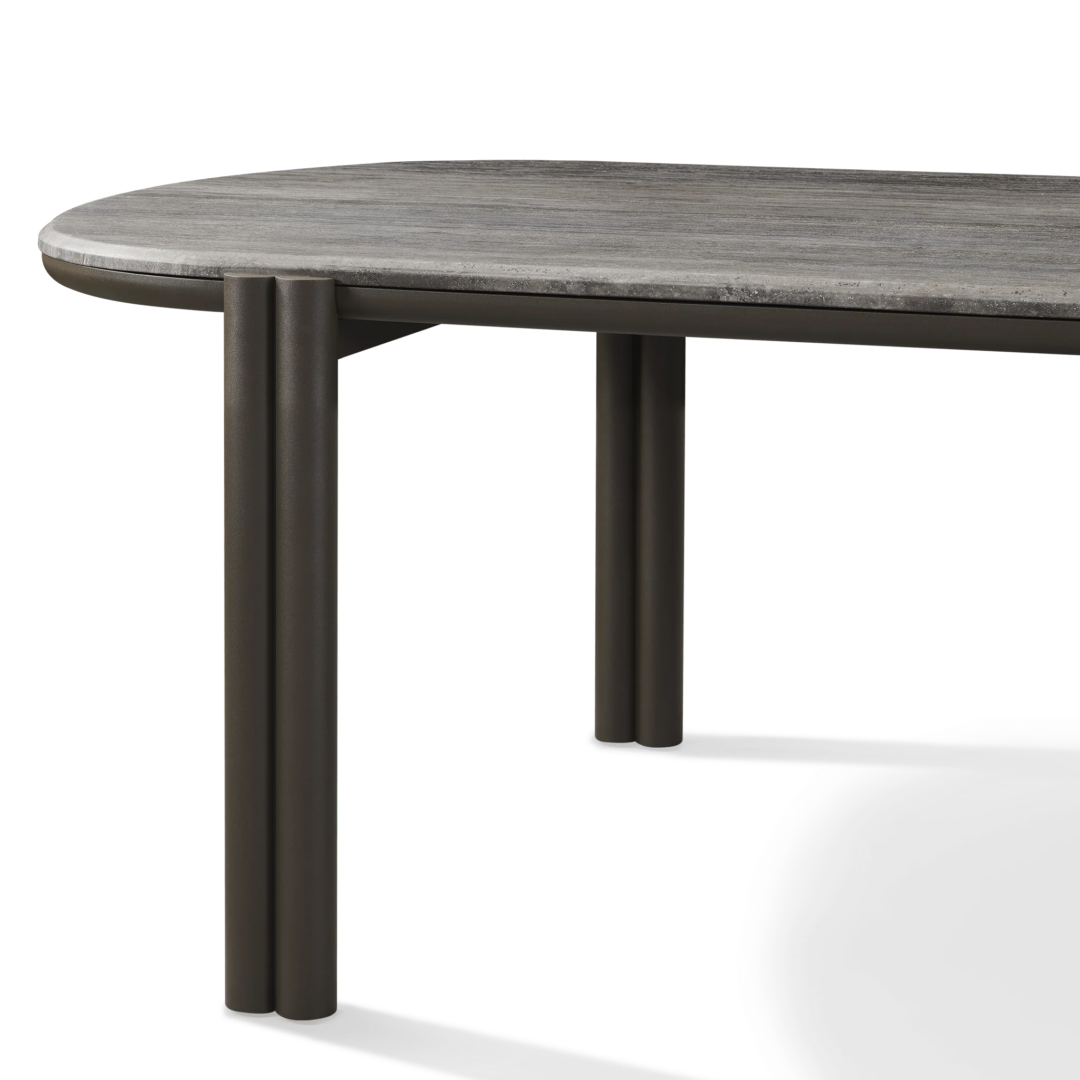Influenced by modern Australian architecture and landscapes, our refined Cove collection features special details like double cylindrical legs and curved edges that create soft sculptural silhouettes. The mixed–material Cove Pill Dining Table anchors your outdoor dining experience — featuring a refined powder coated aluminum frame in Aluminum Bone with an architectural double leg detail suspending an organic travertine stone top in Cream. The unique pill shape of the table top curves around the edges for an unexpected contemporary touch that gives this design its name. Pair this outdoor dining table with our matching chairs to complete your outdoor dining set.