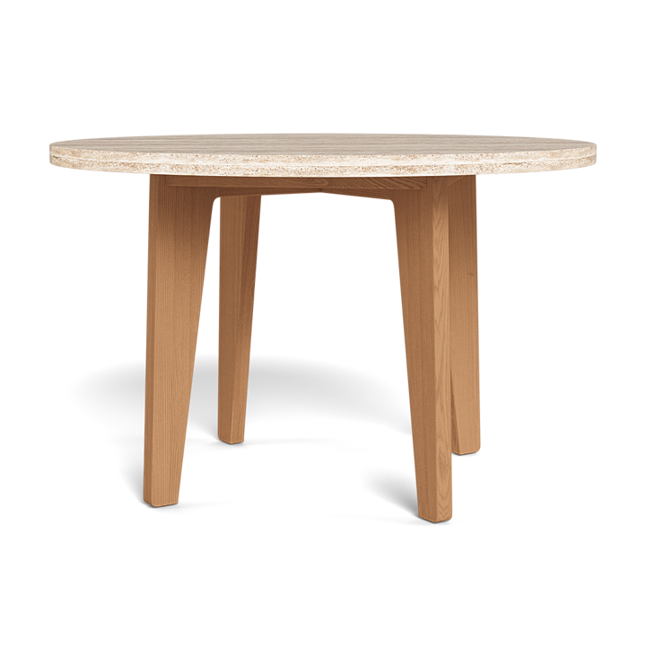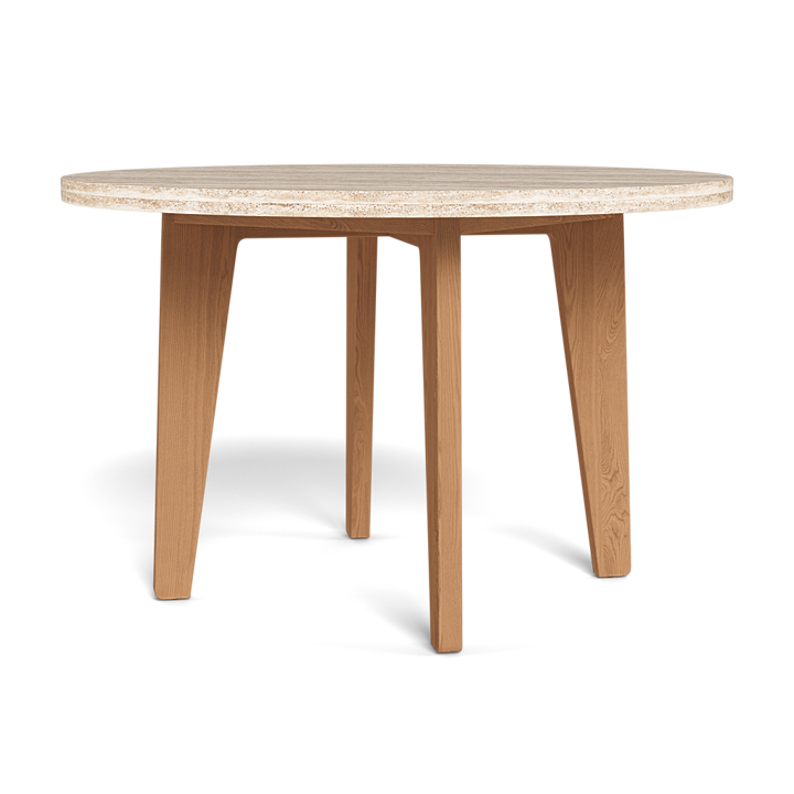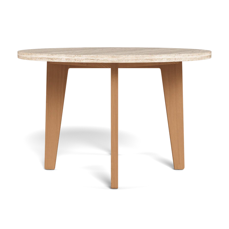 A collaboration with decorated interior designer Martyn Lawrence Bullard, our MLB collection balances modern proportions with a striking juxtaposition of outdoor materials. The MLB Round Dining Table 1200 was designed as the perfect outdoor table for up to four — featuring a handcrafted frame of solid natural Indonesian teak with four angled teak legs supporting a beautiful travertine top. A truly versatile statement piece, layer this modern round outdoor dining table into a multitude of aesthetics or leave it as a stand–alone to really let it shine. Pair it with any MLB dining chair to complete the outdoor dining set.