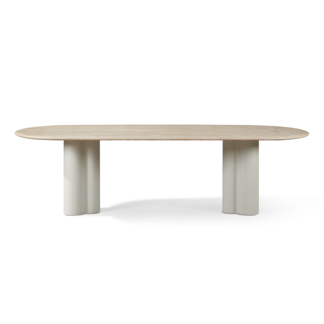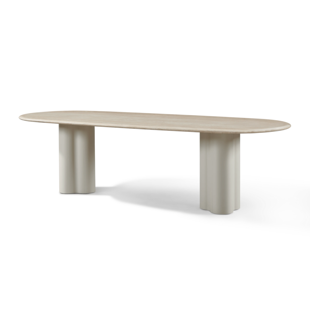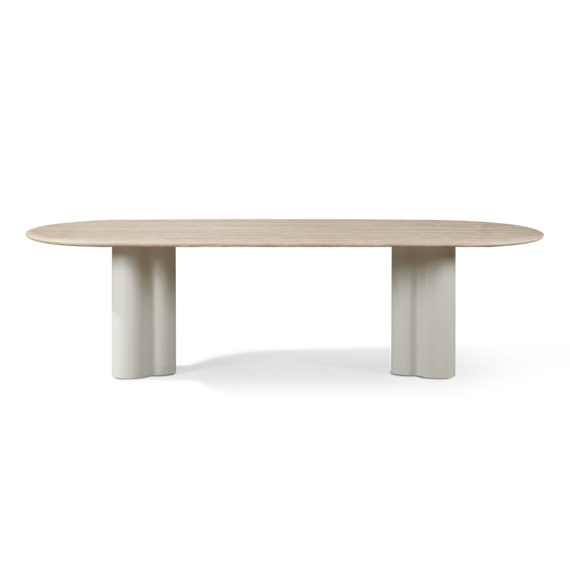 A contemporary and classic study in soft curves, our Porto collection creates a natural interplay between shadow and light with sculptural forms in the base. The mixed–material Porto Pill Dining Table 108" anchors your outdoor dining set — featuring a pair of softly curved powder coated aluminum bases in Aluminum Bone suspending an organic travertine stone top in Natural with a gentle, sloping bullnose edge. The unique long pill shape of the table top curves around the edges for an unexpected contemporary touch. The contrasting aluminum base introduces texture and a subtle sheen against the coolness of the travertine. This unique outdoor dining table is a showpiece that highlights the natural combination of fine materials and expert craftsmanship. Also available in an all–stone base and top. Pair it with any dining chair to complete your outdoor dining set.