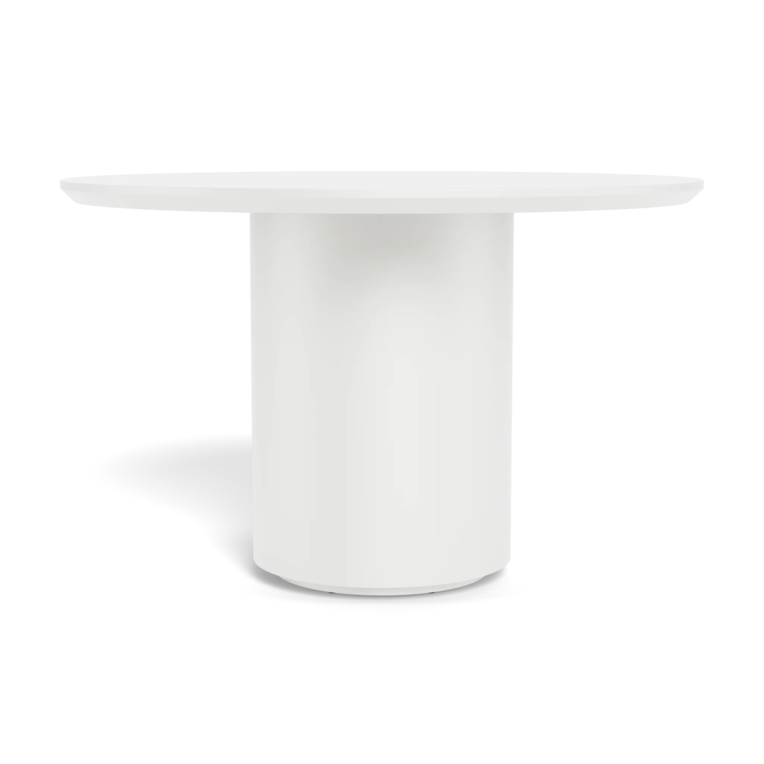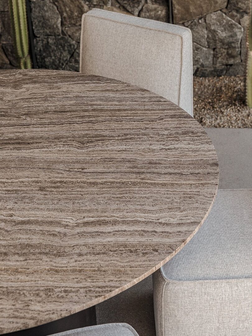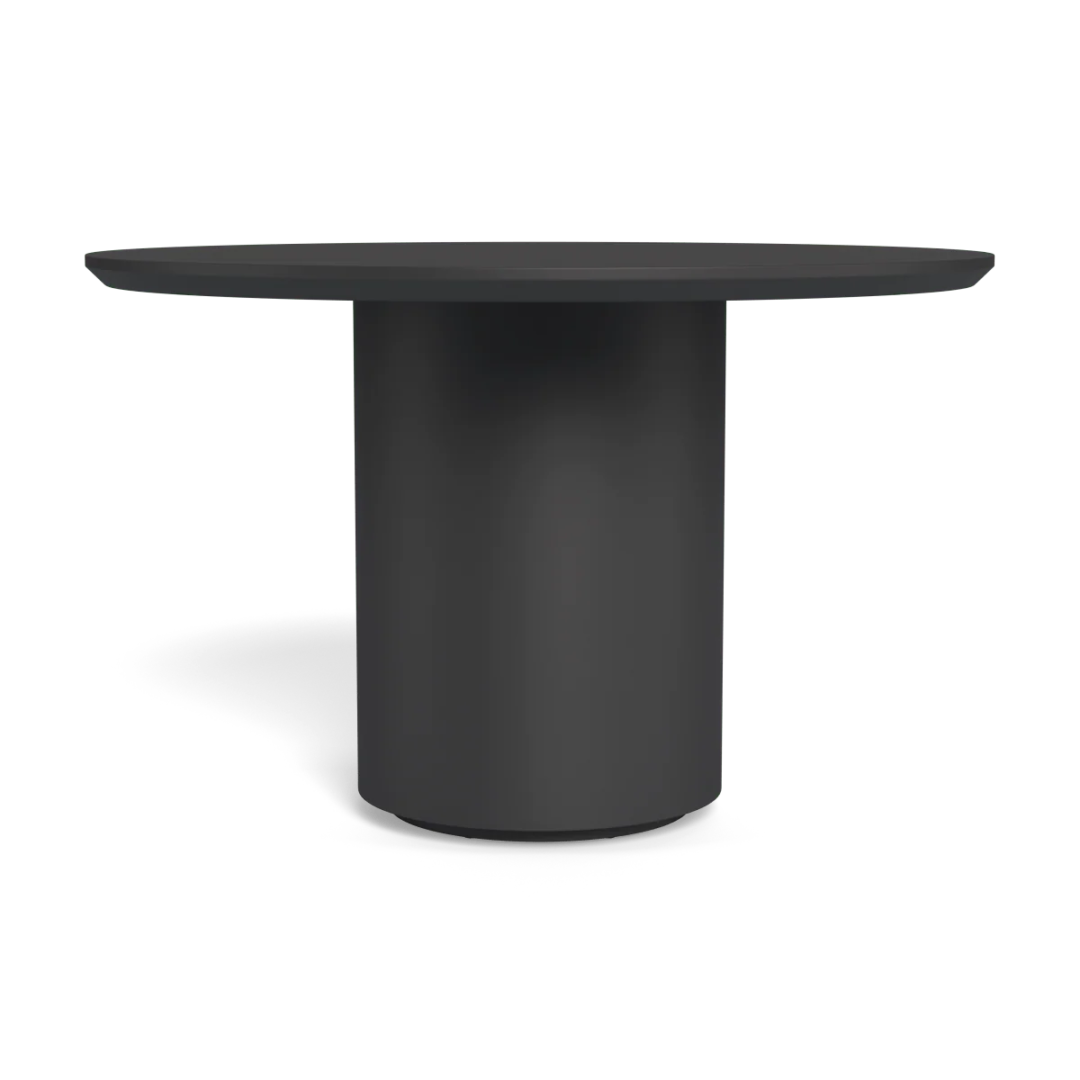 Inspired by minimal round drum plinth tables, we engineered our extruded aluminum to achieve this look as an exercise in simplicity and bold geometry. A Round aluminum lone drum supports the beveled top aluminum table top, here with slats for easy use and maintence.Round table is available in 2 sizes and you choice of slatted or stone top– a perfect timeless table