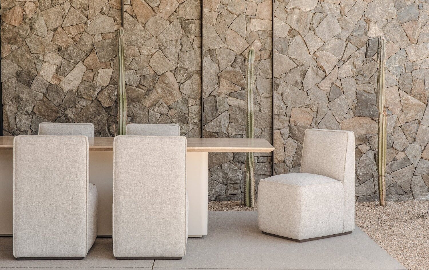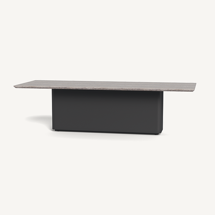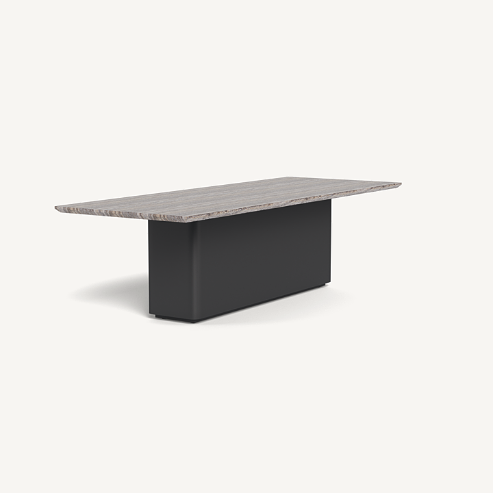 Inspired by minimal center plinth dining tables, we engineered our extruded aluminum to achieve this look as an exercise in simplicity and bold geometry. A singular hollow plinth of extruded aluminum with gentle curved edges supports the beveled top engineered in Travertine stone – supported by our aluminum honeycomb sub structure for support and resilience. A perfect and timless table with seating for many