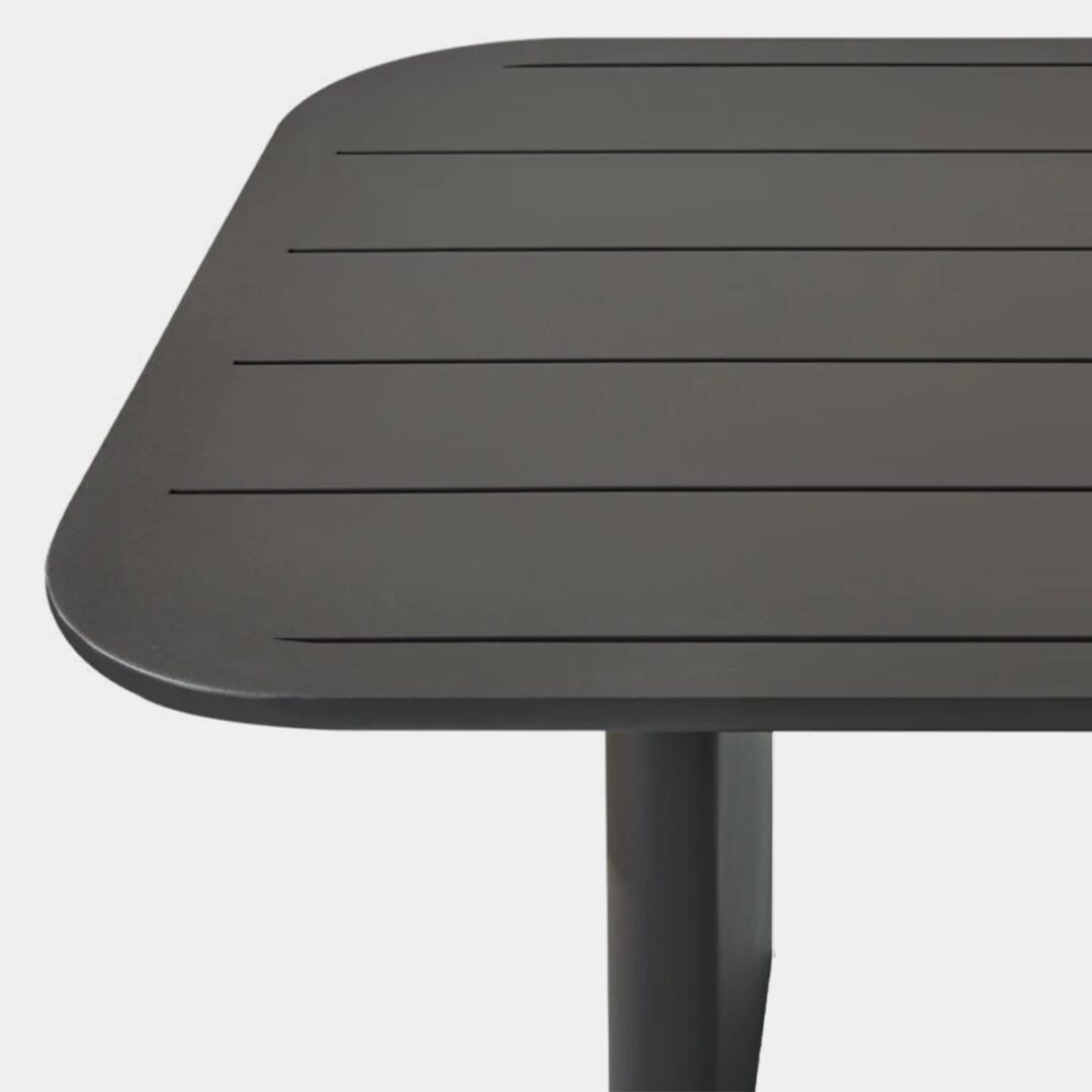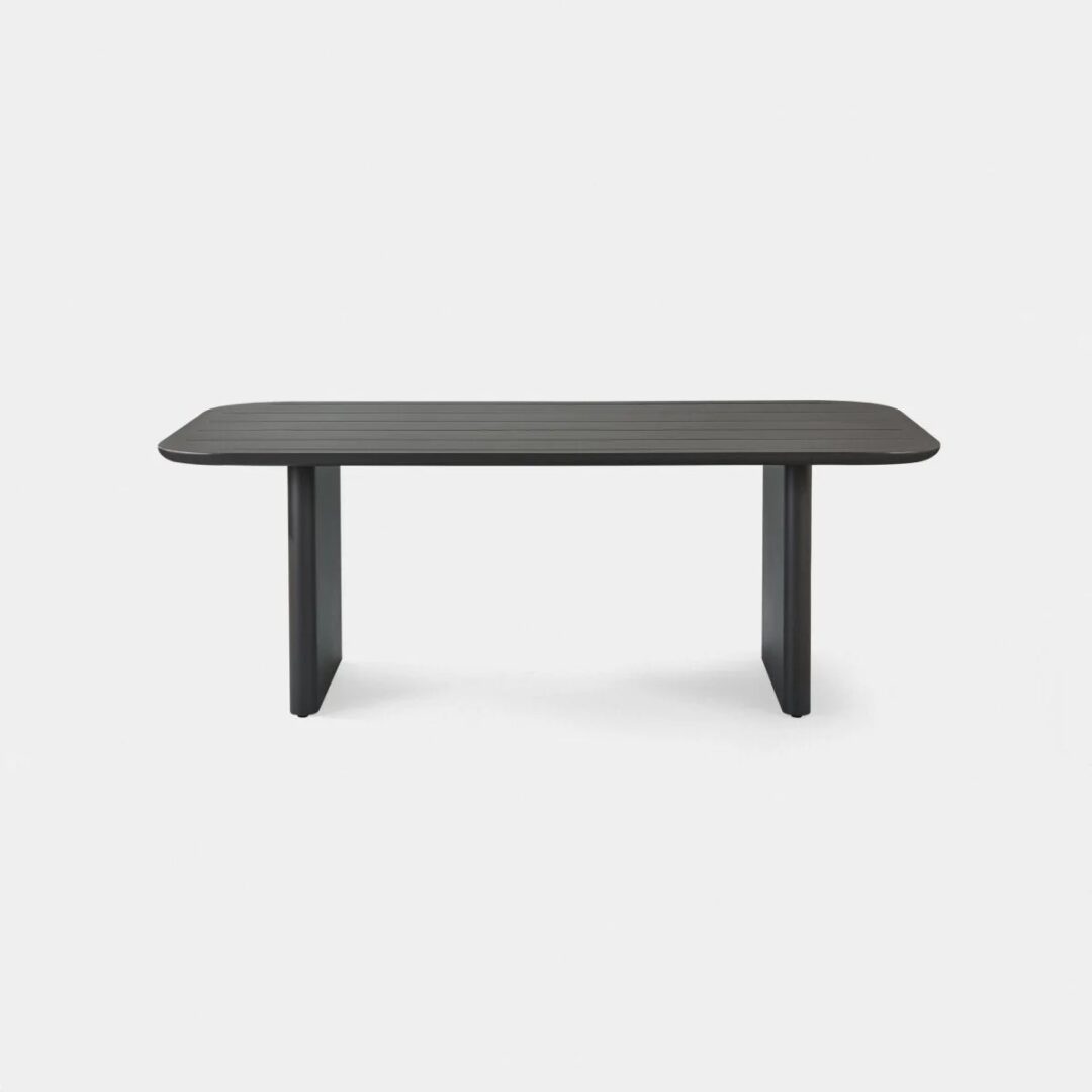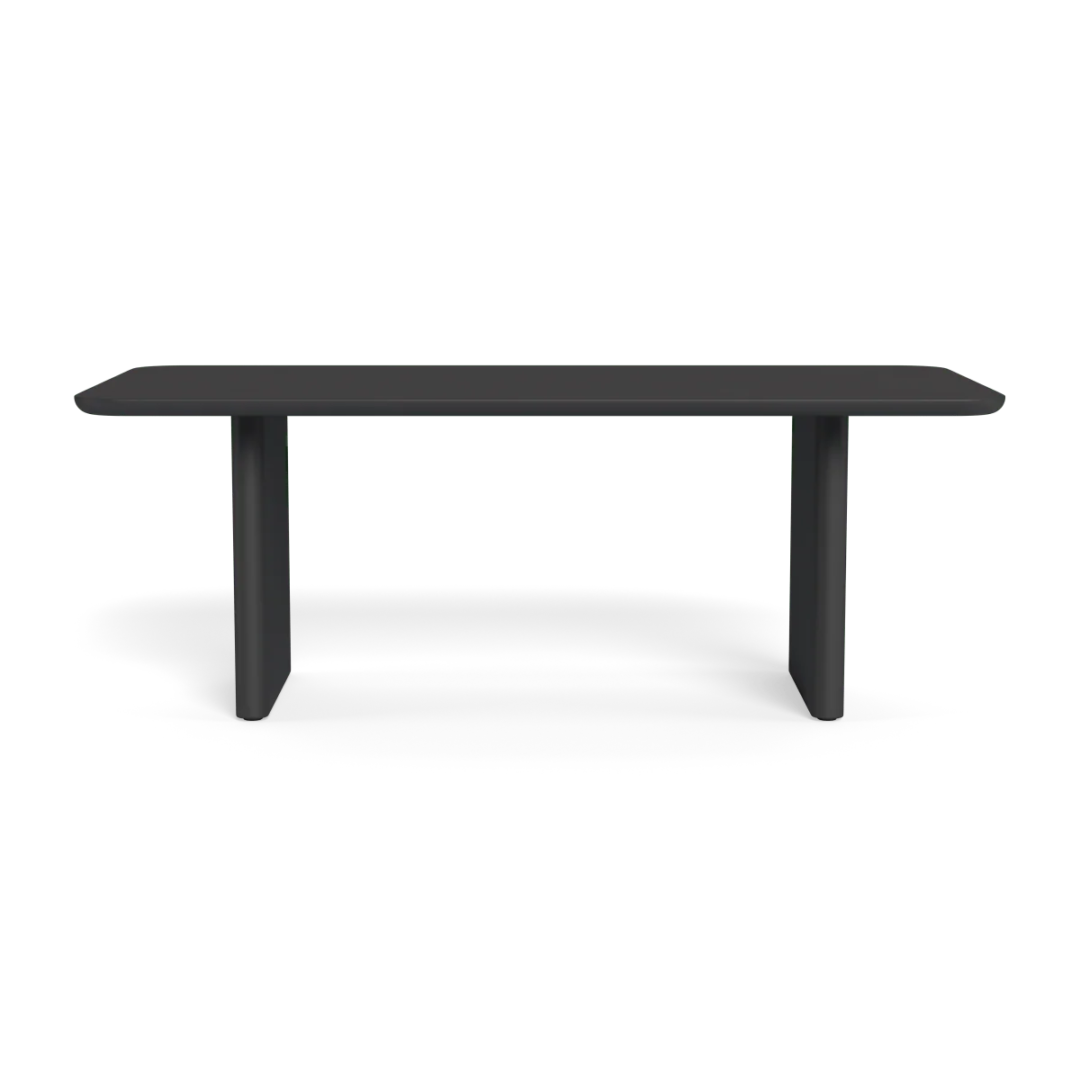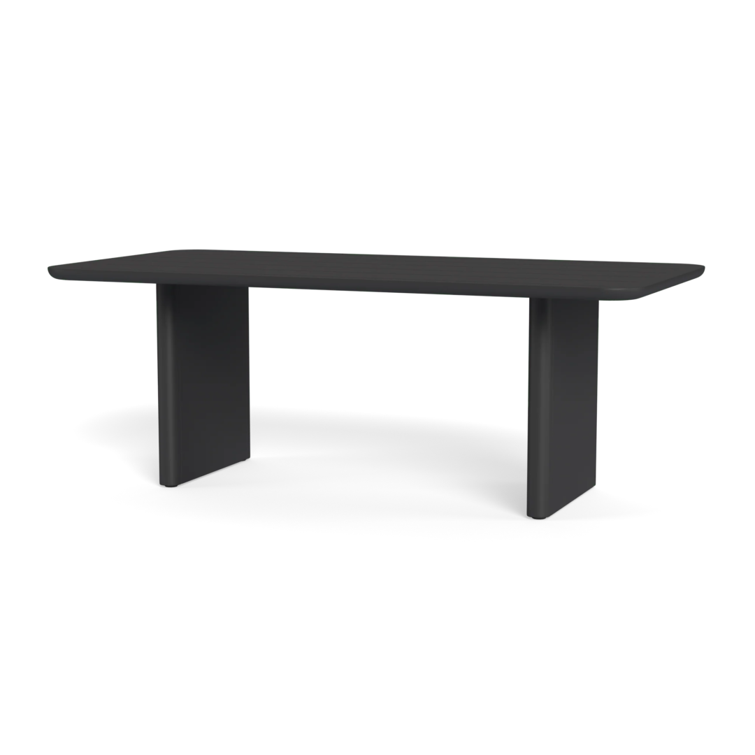 Our Victoria collection balances sculptural curves and right angles for true simplicity of proportion. The Victoria Dining Table 81" was designed as the perfect outdoor table for up to eight — featuring a stunning curved frame in powder coated extruded aluminum echoed in the rounded edges of the plank legs, with the option of a matching aluminum slatted top or contrasting slab of beautiful travertine stone. Our smaller rectangular table, this contemporary piece brings harmony to a variety of spaces.