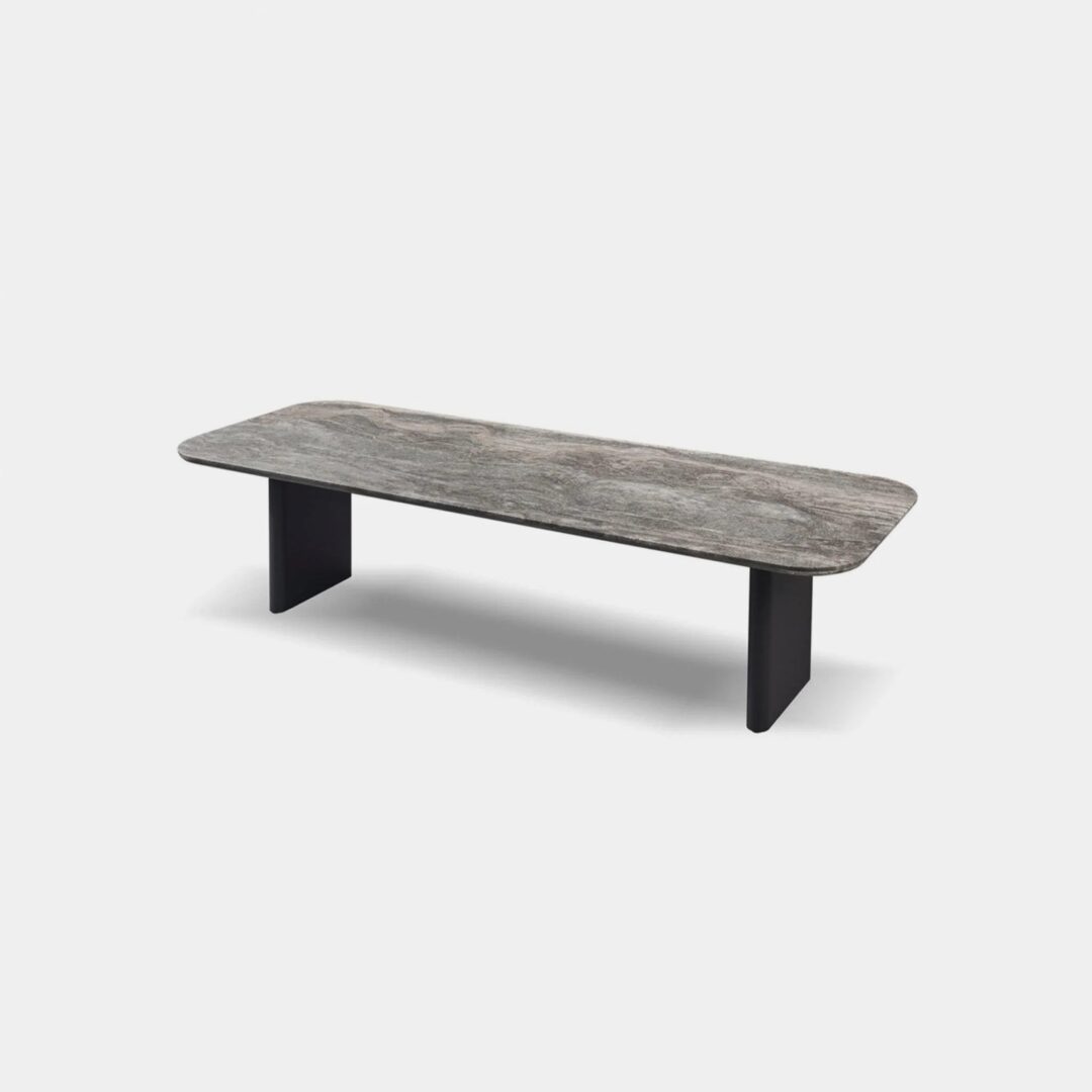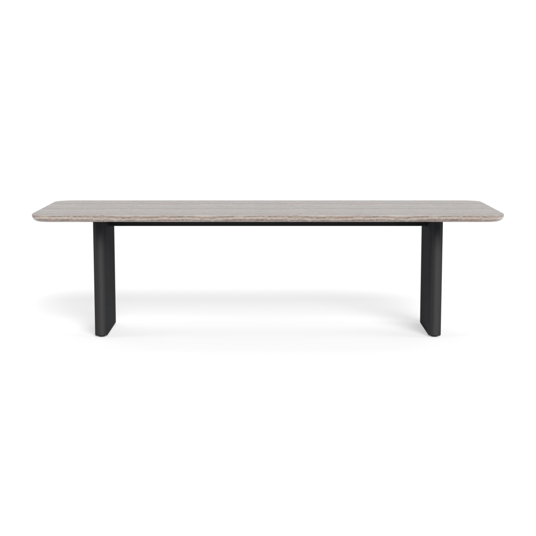 Our Victoria collection balances sculptural curves and right angles for true simplicity of proportion. The Victoria Dining Table 108" was designed as the perfect outdoor table for up to ten — featuring a stunning curved frame in powder coated extruded aluminum available in Asteroid or Taupe echoed in the rounded edges of the plank legs, with the option of a matching aluminum slatted top or contrasting slab of beautiful travertine stone. Our larger rectangular table, this contemporary dining table brings harmony to a variety of outdoor spaces. Pair it with our Victoria dining chairs to complete the outdoor dining set.