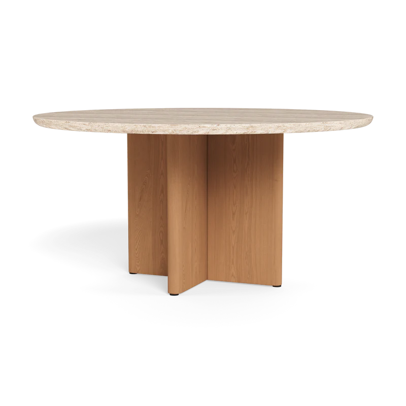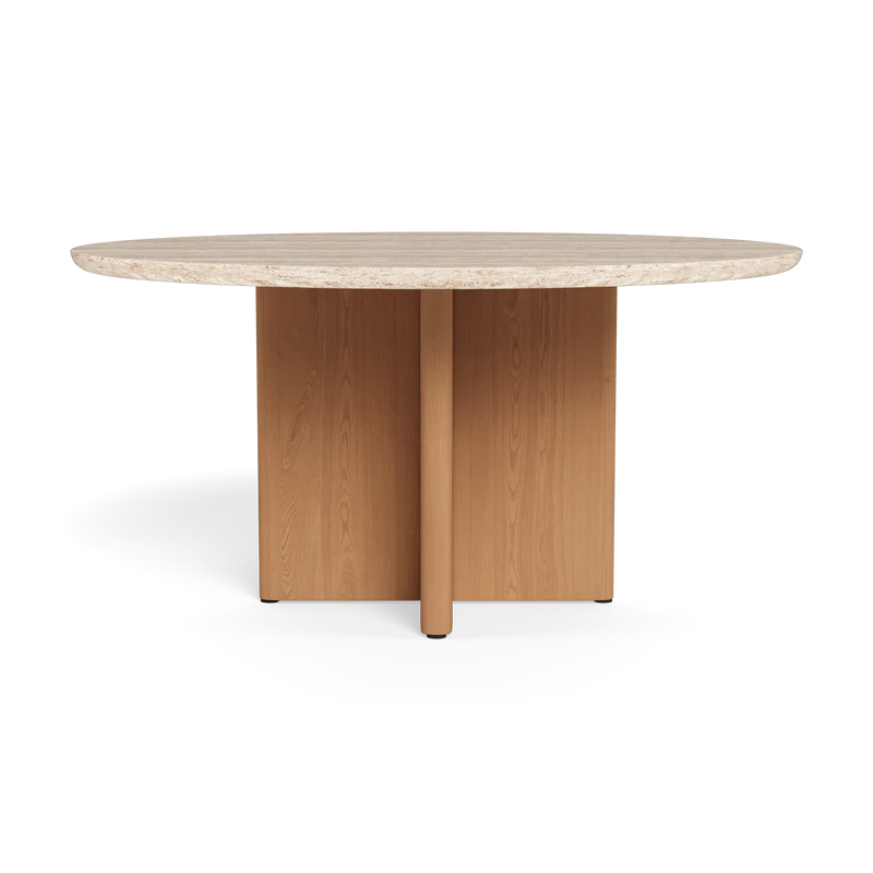 Our Victoria Teak collection balances sculptural curves and right angles for true simplicity of proportion. The Victoria Round Dining Table 1500 was designed as the perfect outdoor table for up to eight — featuring a stunning curved frame in in solid natural Indonesian teak echoed in the rounded edges of the plank legs, supporting a slab of beautiful travertine stone in Cream. Our smaller round table, this contemporary dining table brings harmony to a variety of outdoor spaces. Pair it with our Victoria dining chairs to complete the outdoor dining set.