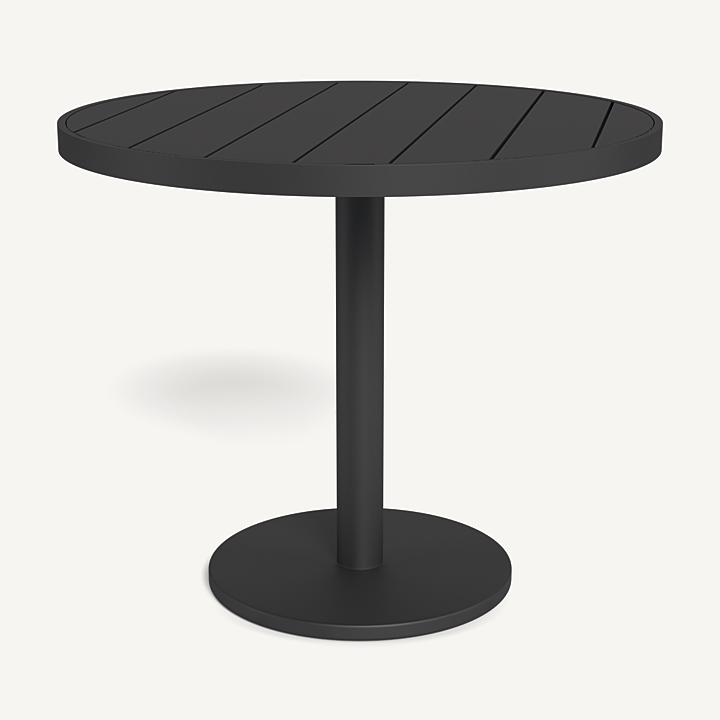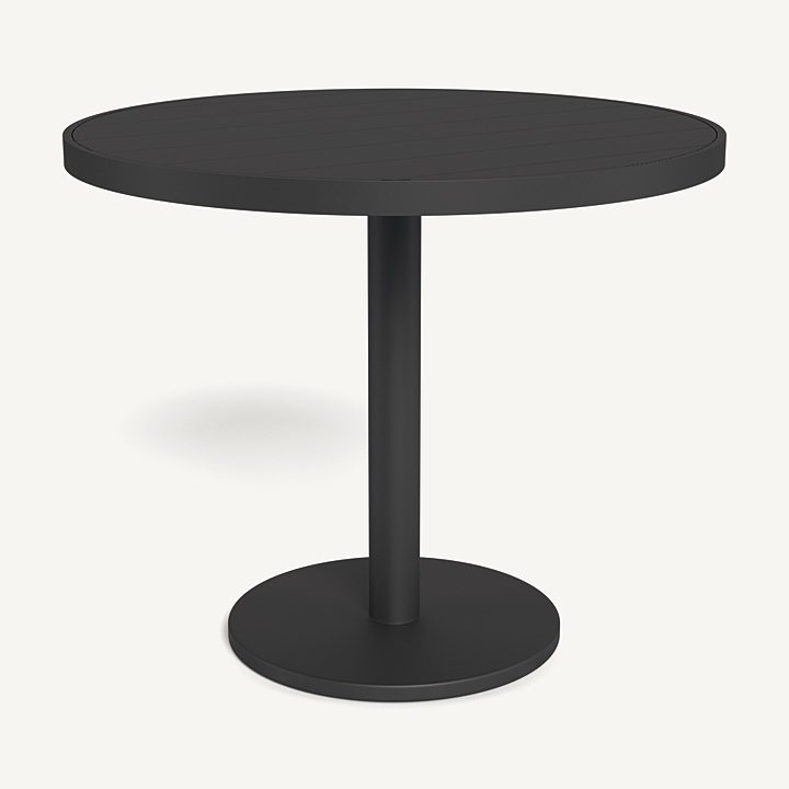 This simple and streamlined table collection is also customizable by finish, size and material. Our Vienna bistro collection was designed specifically for contract and hospitality settings, but doubles as a great table for any space with a smaller dining area. Choose an aluminum frame in any of our powder coated colors, and pair it with a top in Aluminum Slats, Natural Teak slats, solid HPCL (high-pressure laminate) or Laminam ceramic. Each top is universal to the same base. For a larger dining table, slide two matching square or rectangular tables together. Vienna is available in five size options: two square shapes, two round shapes and one rectangular shape. Pair it with any dining chair to complete your outdoor dining set.