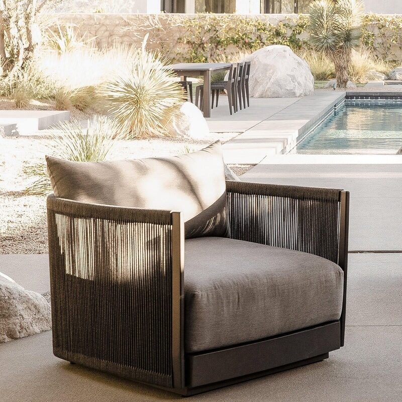 Our Antigua collection brings European styling and a new vision of rope to the coastal lifestyle. Subtle curves set our Antigua Lounge Chair apart — and hug the body into a deep and comfortable seat featuring a generous, plush cushion available in a range of neutral hues floating on a plinth base. But the real luxury is the ability to place this versatile and modern outdoor lounge chair in any space for maximum impact.