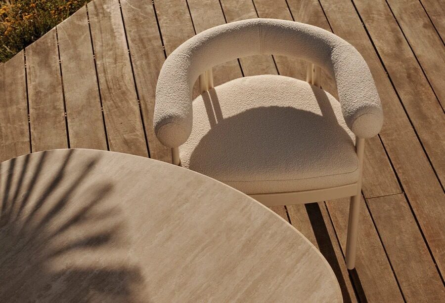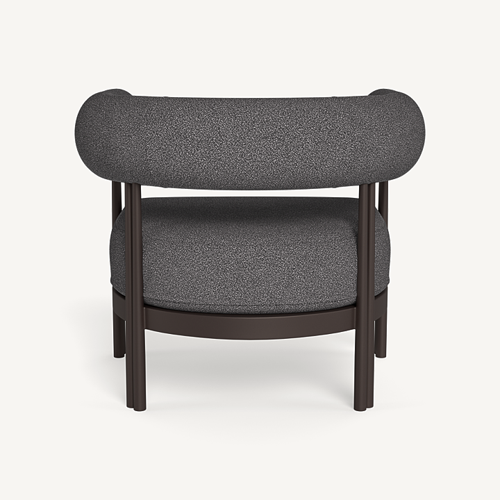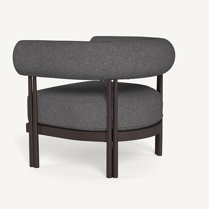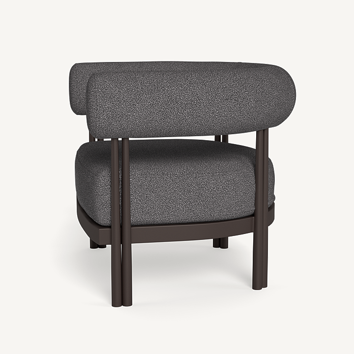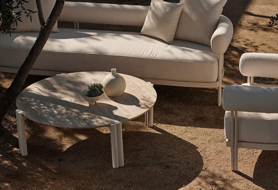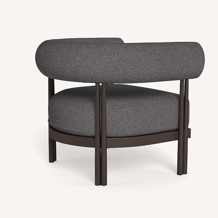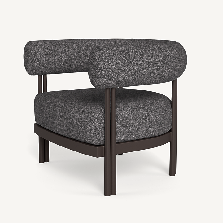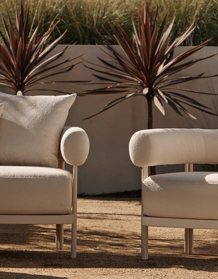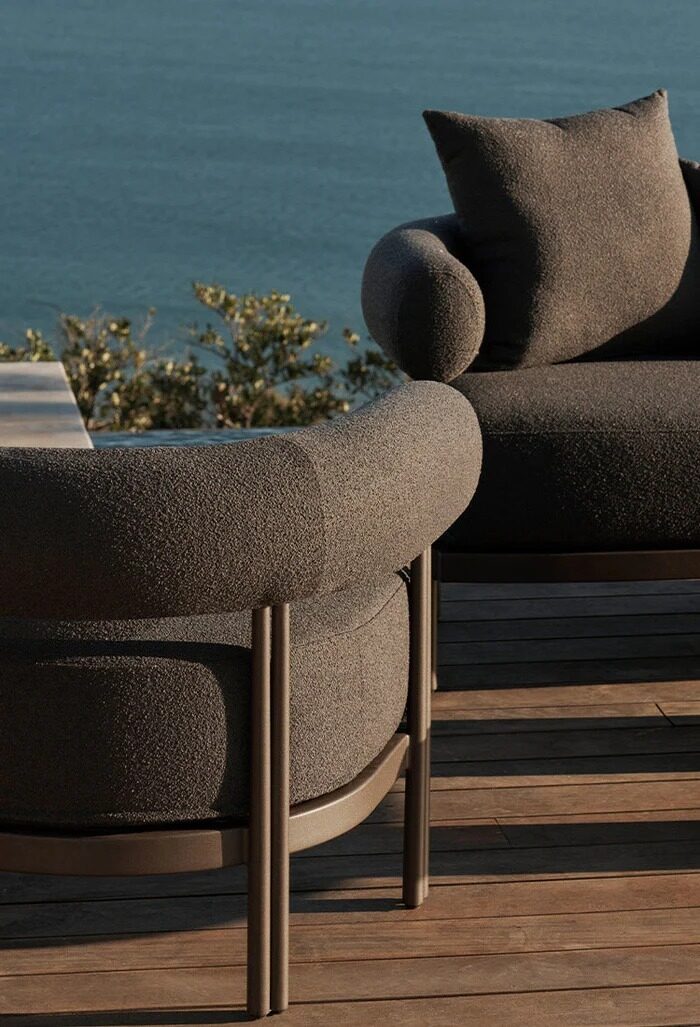 This sophisticated collection features special details like double cylindrical legs and curved edges – refined with luxurious upholstered bolster backs – that create soft sculptural silhouettes with understated elegance.