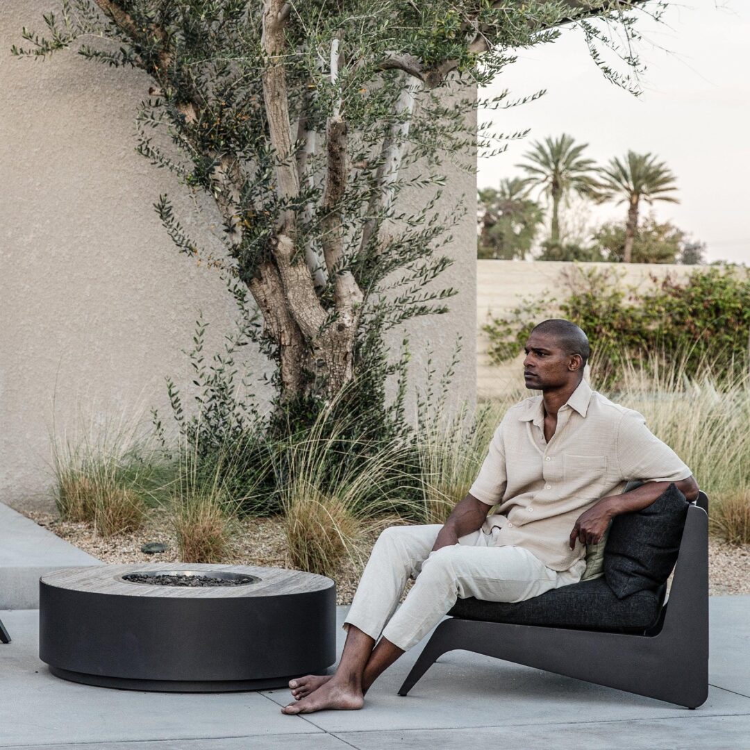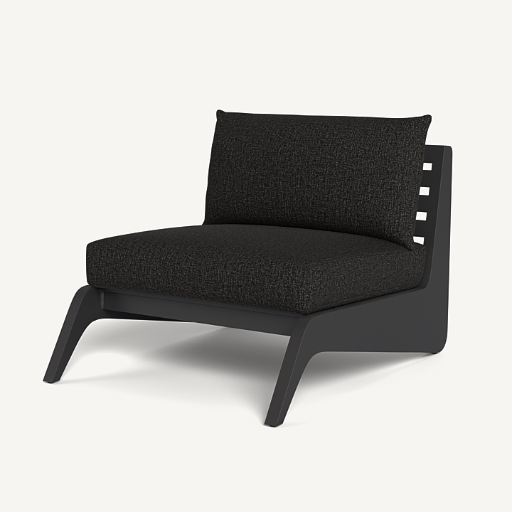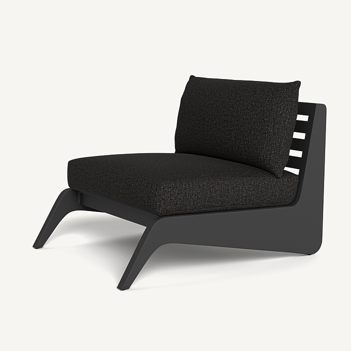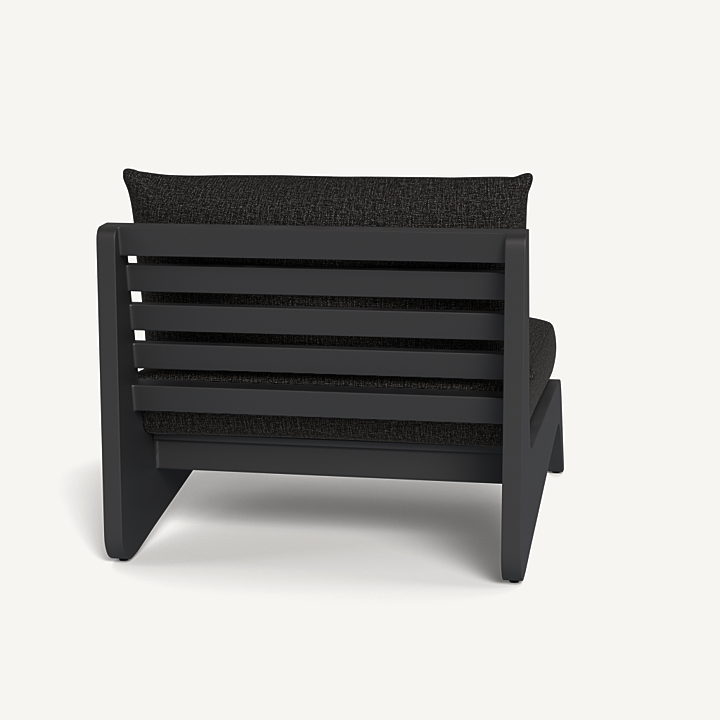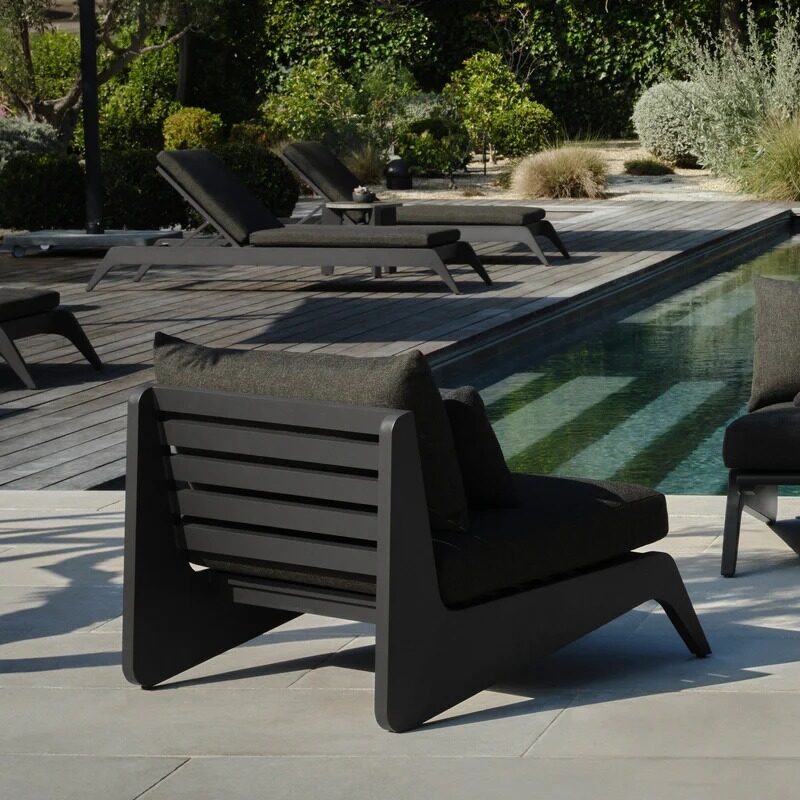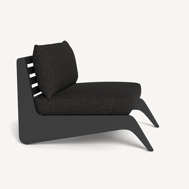 A collaboration with decorated interior designer Martyn Lawrence Bullard, our MLB collection now in aluminum balances modern proportions with a striking juxtaposition of outdoor materials. The MLB Easy Chair is a standout — enjoy a plush deep seat cushion supported by a slatted extruded powdercoated aluminum frame featuring dynamic angled legs. From the side, a striking zigzag shape adds intrigue. A truly versatile statement piece, the low sit makes it ideal for casual outdoor lounging or gathering around a fire table.