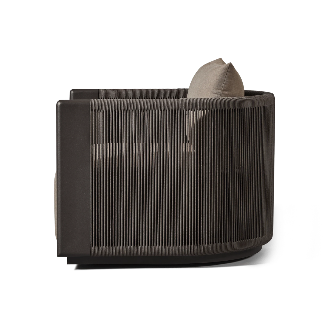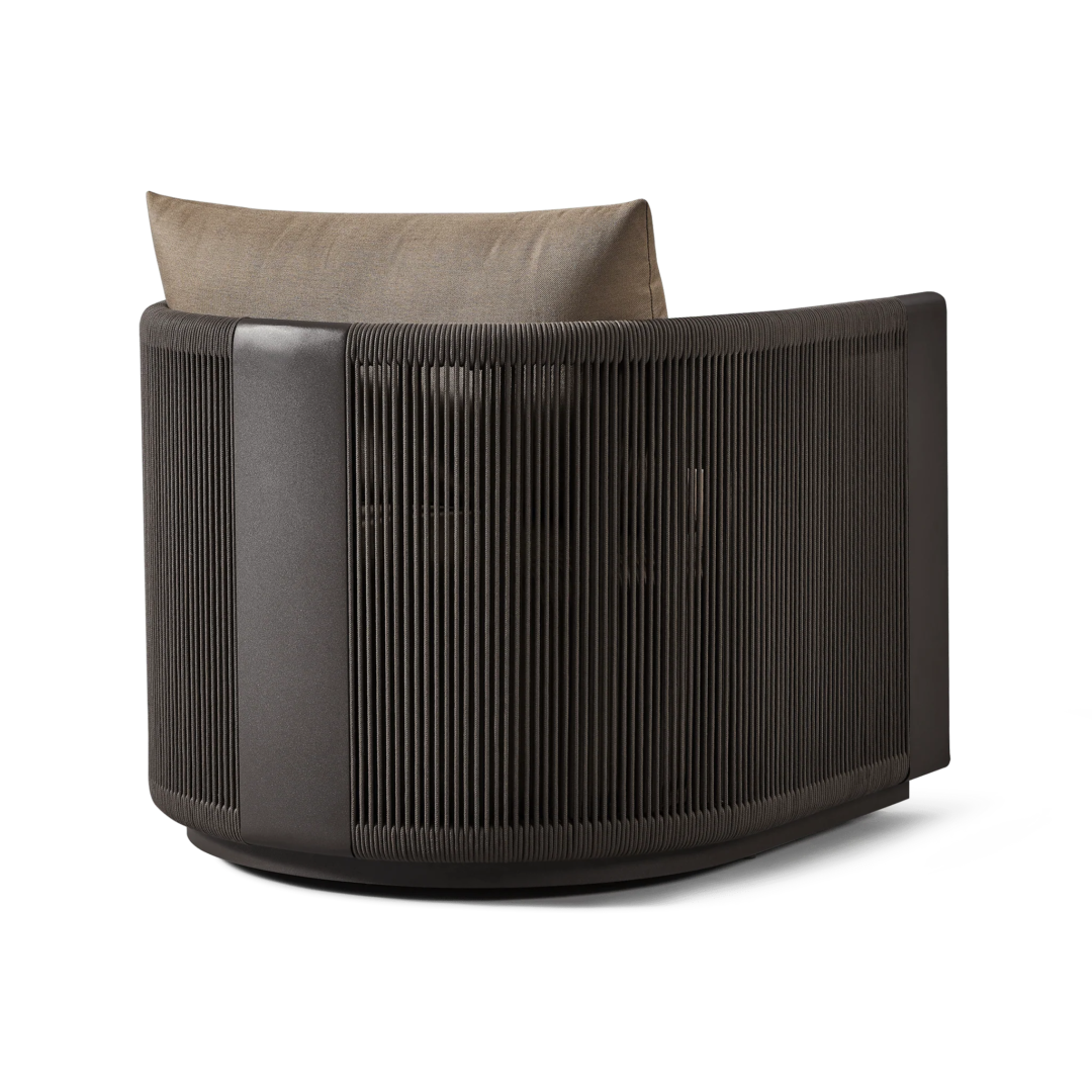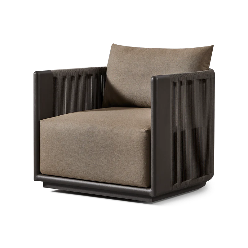 A nod to Sydney’s iconic Palm Beach with its stately coastal pines. Rounded backs, vertical rope detailing and a harmonious mix of materials infuse classic silhouettes with modern elegance. Transitional in spirit, the Palm Beach Aluminum Swivel Lounge Chair is a refreshing update to our signature classics—enjoy a luxuriously low seat cushion with a knife–edge back pillow on a supportive slatted suspension in the just–released colorway of Stone. The powder coated extruded aluminum frame, which goes all the way to the ground, features vertically woven all–weather rope and plays with materials and form. In the back, a single leg adds style and interest, echoing the tripod construction of the collection’s chairs. Available in a static style, this comfort–driven piece seamlessly blends with many styles and in many outdoor spaces.