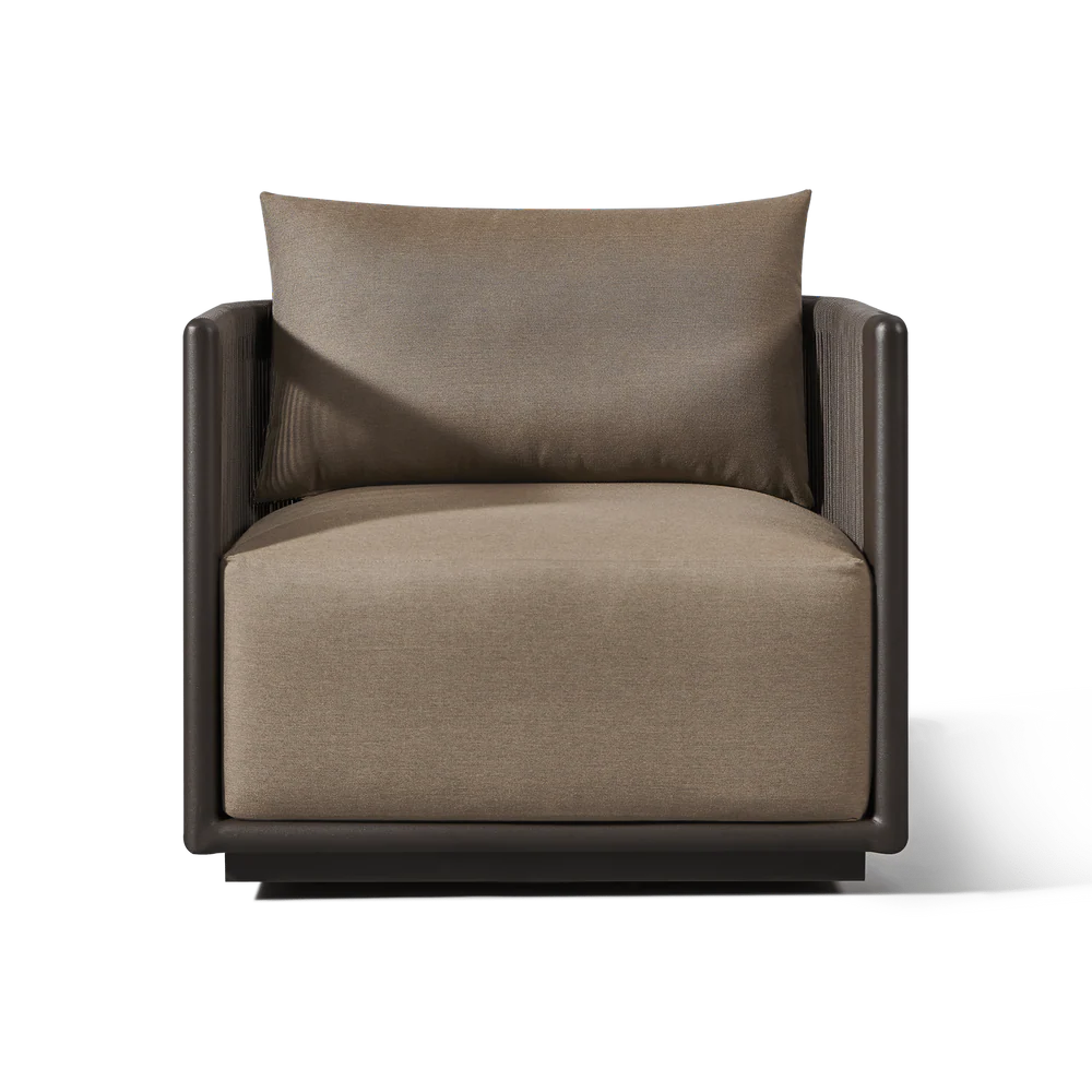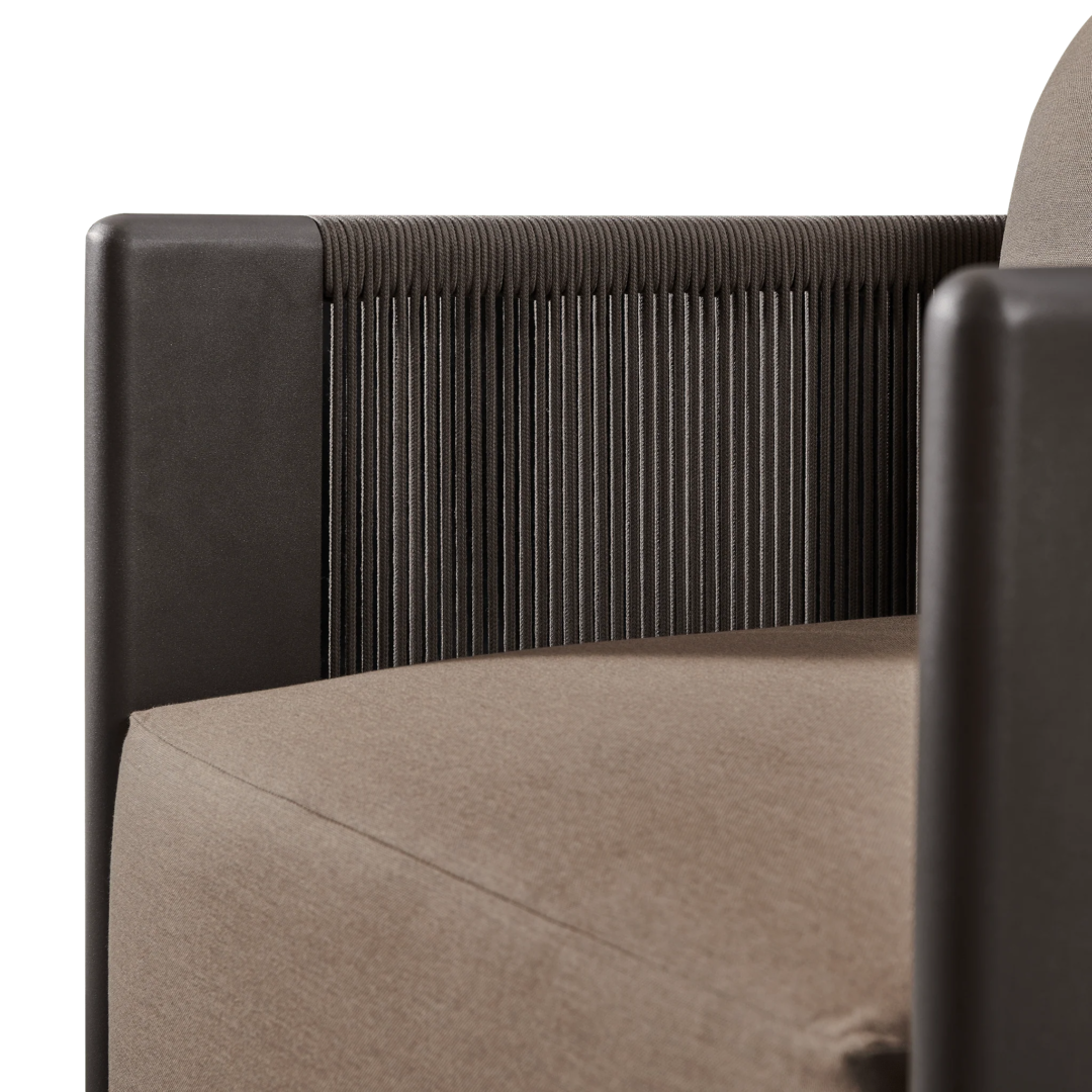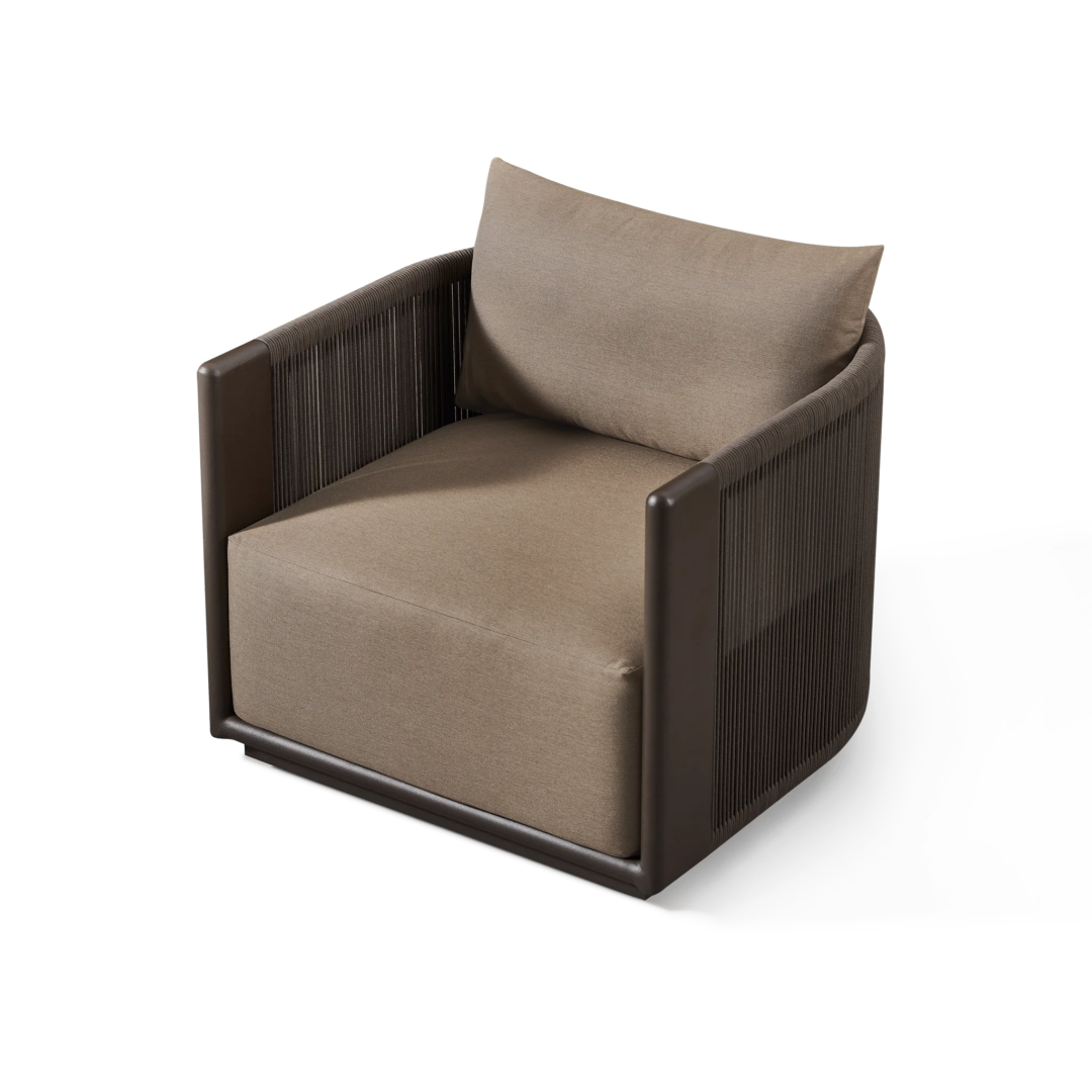 A nod to Sydney’s iconic Palm Beach with its stately coastal pines. Rounded backs, vertical rope detailing and a harmonious mix of materials infuse classic silhouettes with modern elegance. Transitional in spirit, the Palm Beach Aluminum Swivel Lounge Chair is a refreshing update to our signature classics—enjoy a luxuriously low seat cushion with a knife–edge back pillow on a supportive slatted suspension in the just–released colorway of Stone. The powder coated extruded aluminum frame, which goes all the way to the ground, features vertically woven all–weather rope and plays with materials and form. In the back, a single leg adds style and interest, echoing the tripod construction of the collection’s chairs. Available in a static style, this comfort–driven piece seamlessly blends with many styles and in many outdoor spaces.
