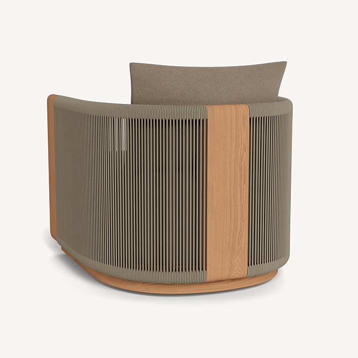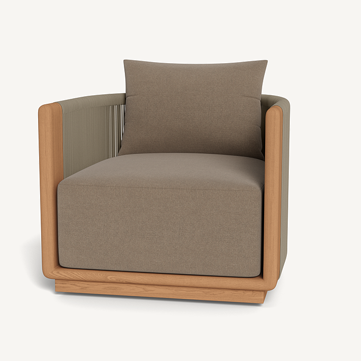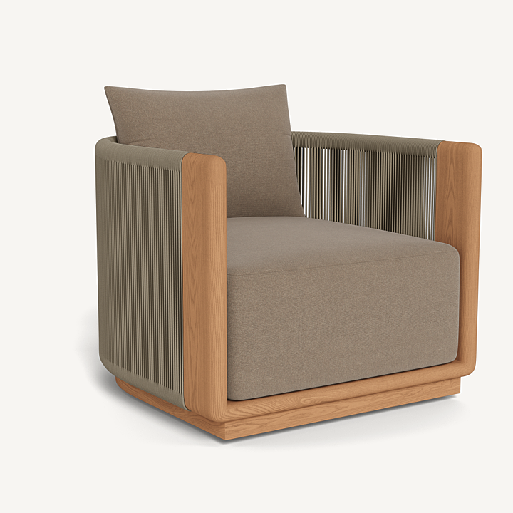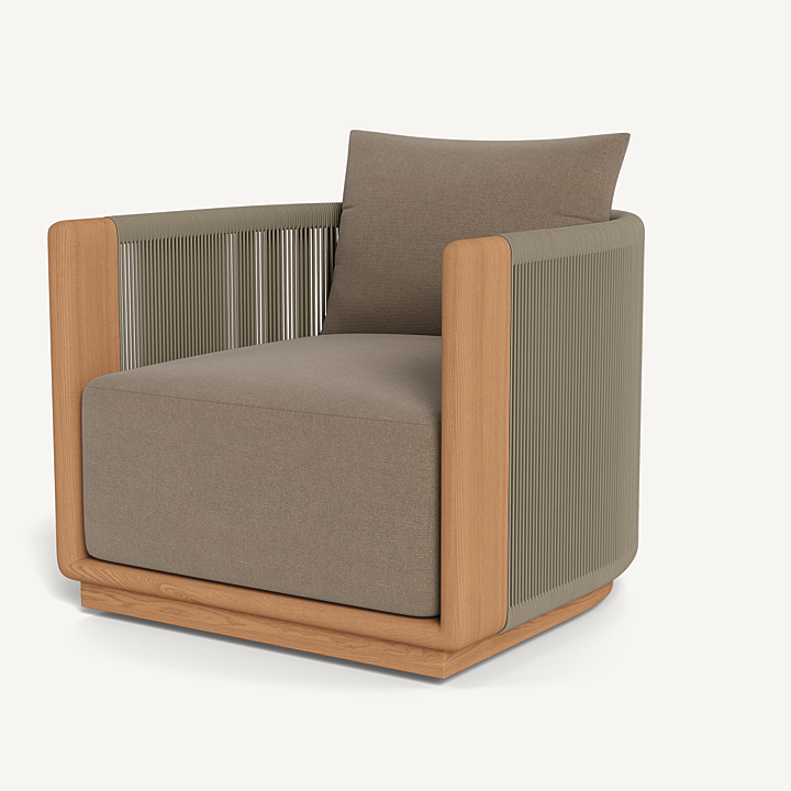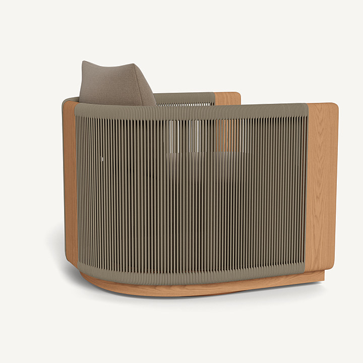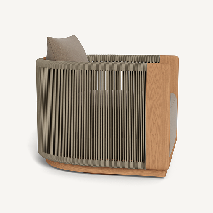 A nod to Sydney’s iconic Palm Beach with its stately coastal pines. Rounded backs, vertical rope detailing and a harmonious mix of materials infuse classic silhouettes with modern elegance. Transitional in spirit, the Palm Beach Teak Swivel Lounge Chair is a refreshing update to our signature classics—enjoy a luxuriously low seat cushion with a knife–edge back pillow on a supportive slatted suspension in the just–released Colourway of Stone. The solid teak frame, which goes all the way to the ground, features vertically woven all–weather rope and plays with materials and form. In the back, a single leg adds style and interest, echoing the tripod construction of the collection’s chairs. Available in a static style, this comfort–driven piece seamlessly blends with many styles and in many outdoor spaces.