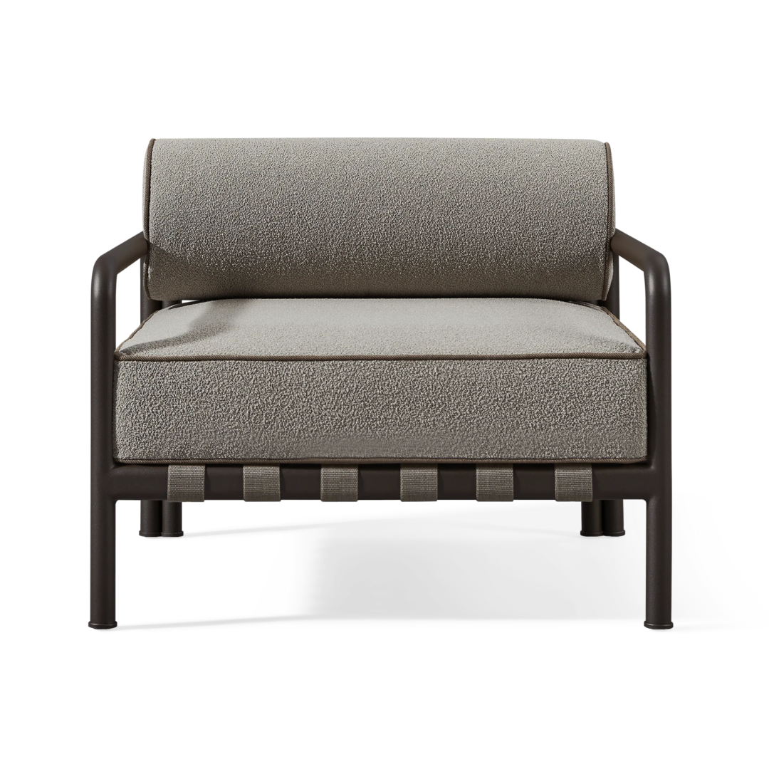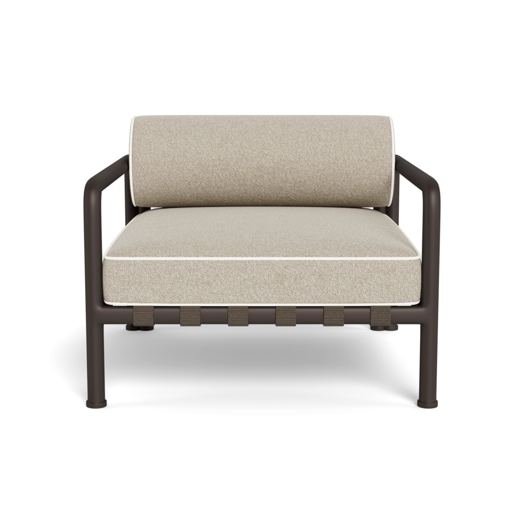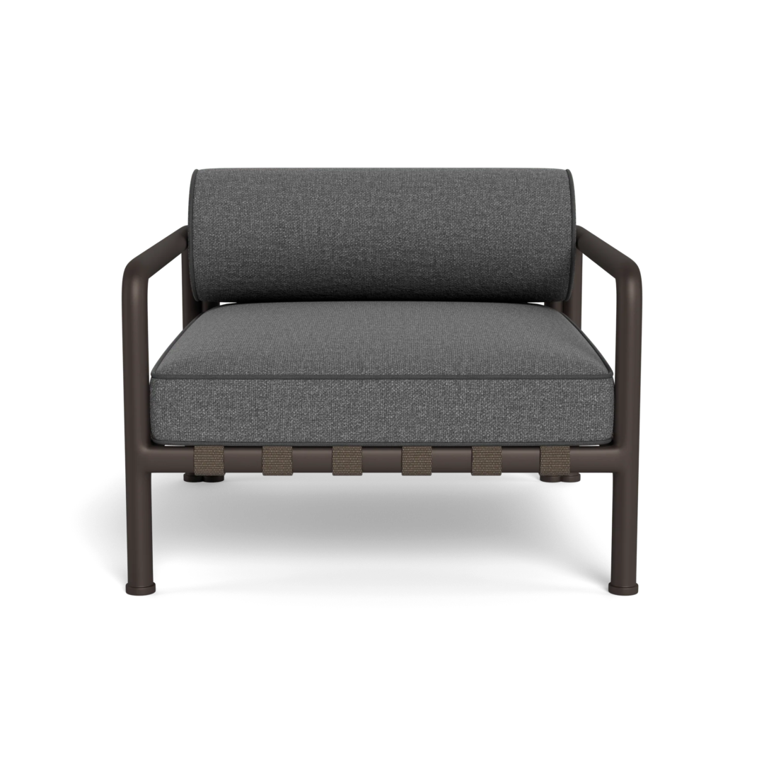 Tubular bronze aluminum, thick strapping and refined piping effortlessly update mid–century charm with contemporary sophistication for any outdoor space. The Parker Lounge Chair is a bold design statement—enjoy a comfort–driven seat cushion and bolster back, supported by a tubular metal frame and high–quality strapping woven in parallel lines in both directions for added interest as it’s spotted through the seat deck or back. Details like contrast piping and a subtle shape placed at the foot complete this design–forward low seating collection. A gorgeous and intricately crafted piece, this outdoor lounge chair brings a touch of tradition into modern day.