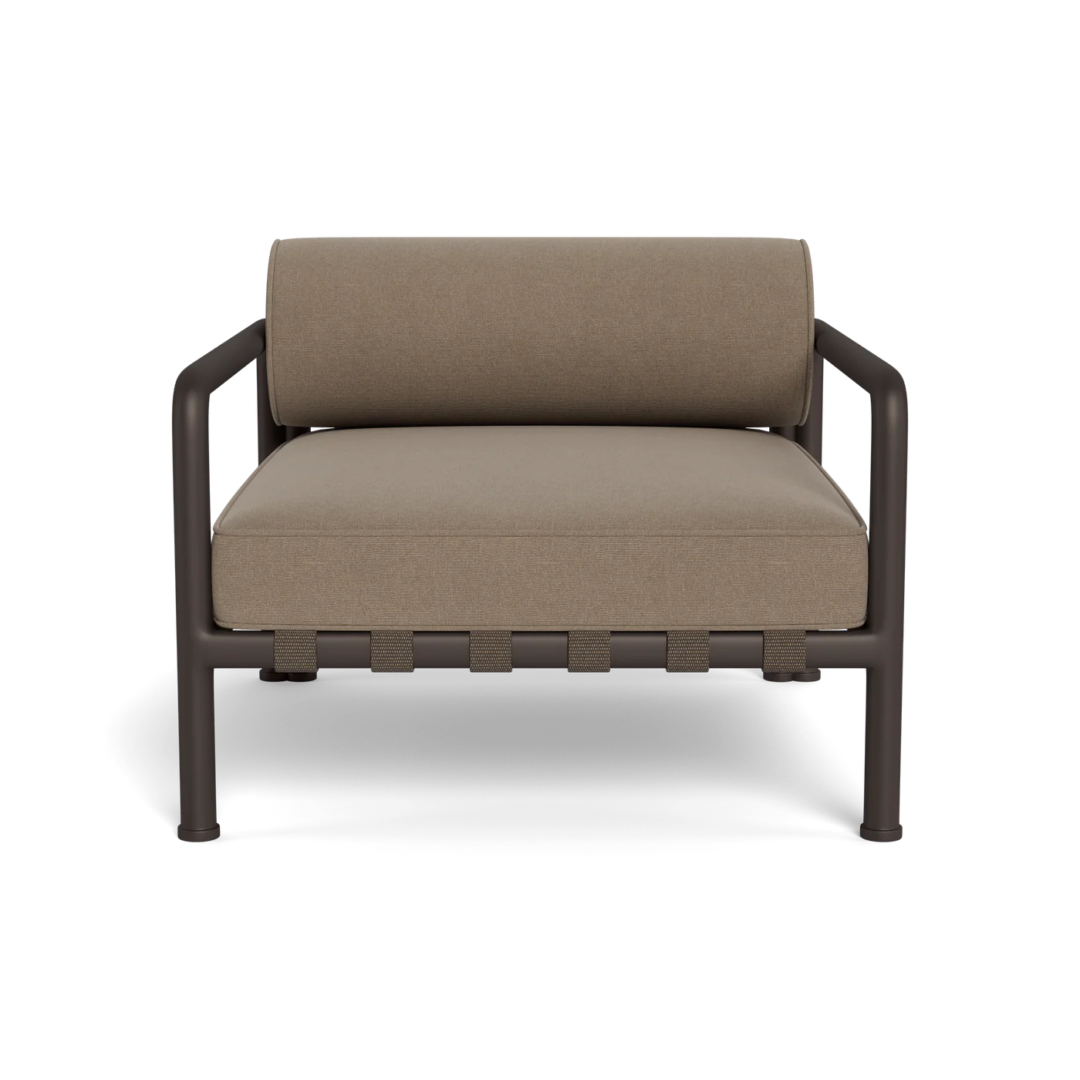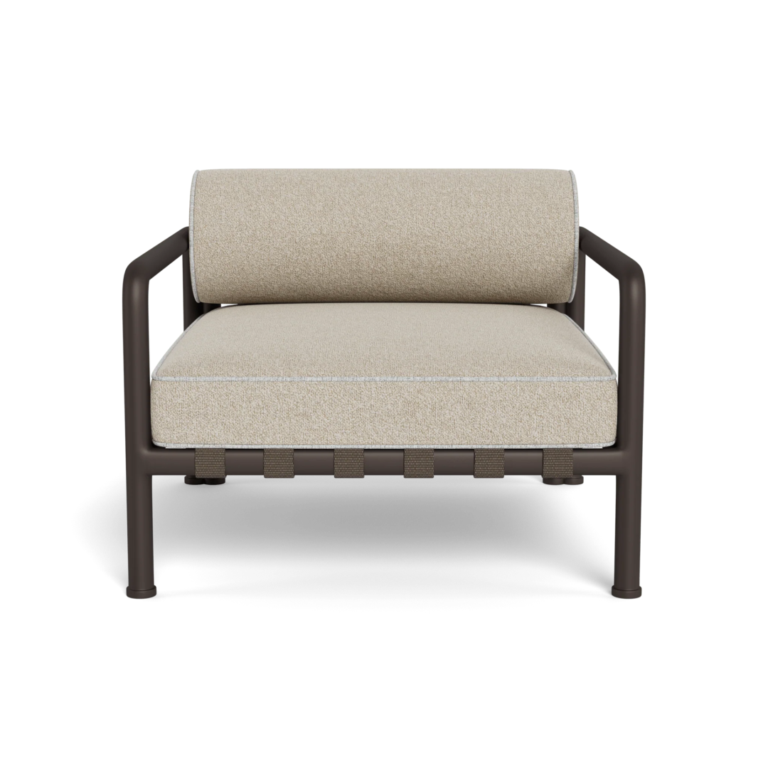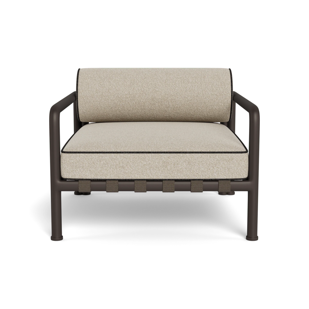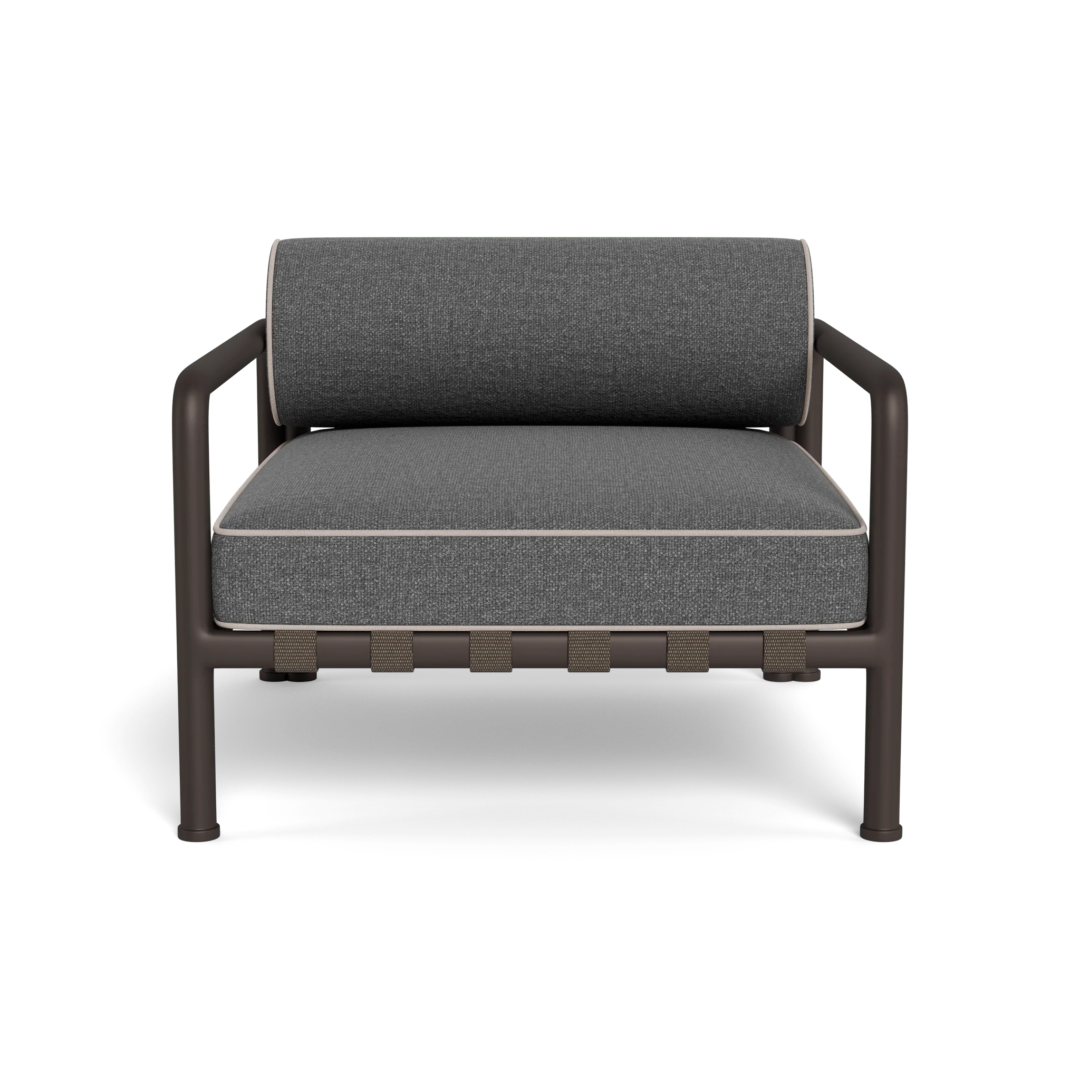 Tubular bronze aluminum, thick strapping and refined piping effortlessly update mid–century charm with contemporary sophistication for any outdoor space. The Parker Lounge Chair is a bold design statement—enjoy a comfort–driven seat cushion and bolster back, supported by a tubular metal frame and high–quality strapping woven in parallel lines in both directions for added interest as it’s spotted through the seat deck or back. Details like contrast piping and a subtle shape placed at the foot complete this design–forward low seating collection. A gorgeous and intricately crafted piece, this outdoor lounge chair brings a touch of tradition into modern day.