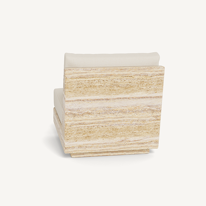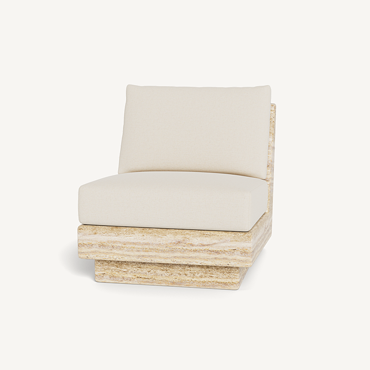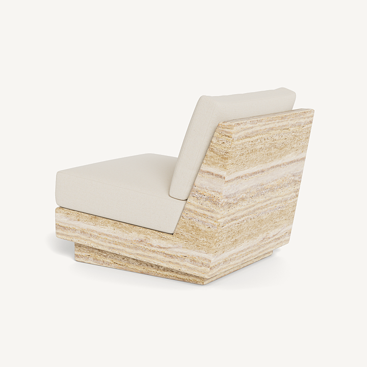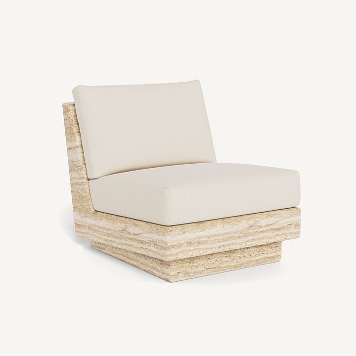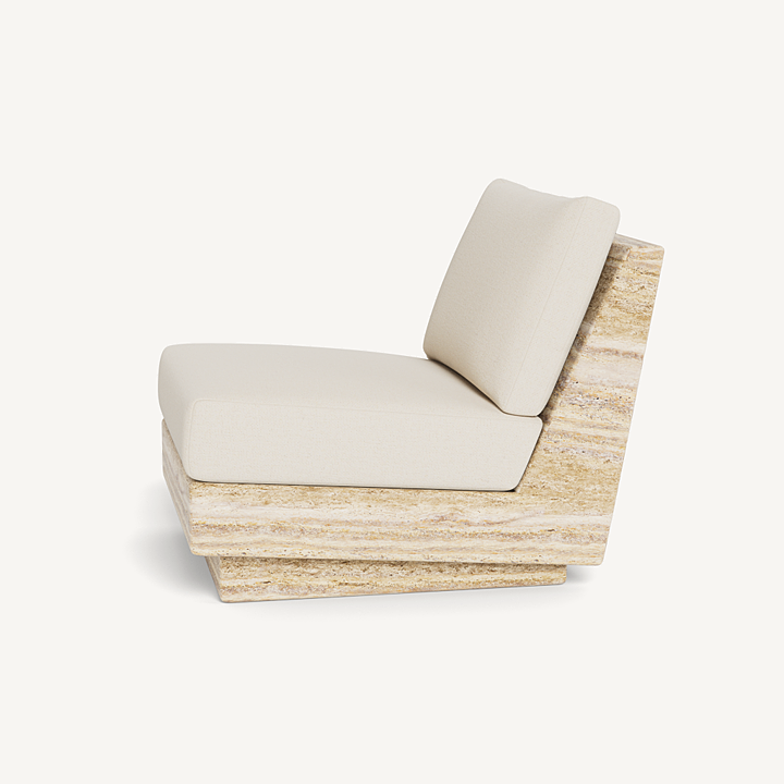 A new addition to our Tulum Collection, our Travertine Tulum Armless Lounge Chair features low single seating finished in Natural Travertine with plush cushions for relaxed comfort. Angled silhouettes and sharp sharp lines energize the design. Gather around the fire table in style — this lounge chair is the definition of easy living.