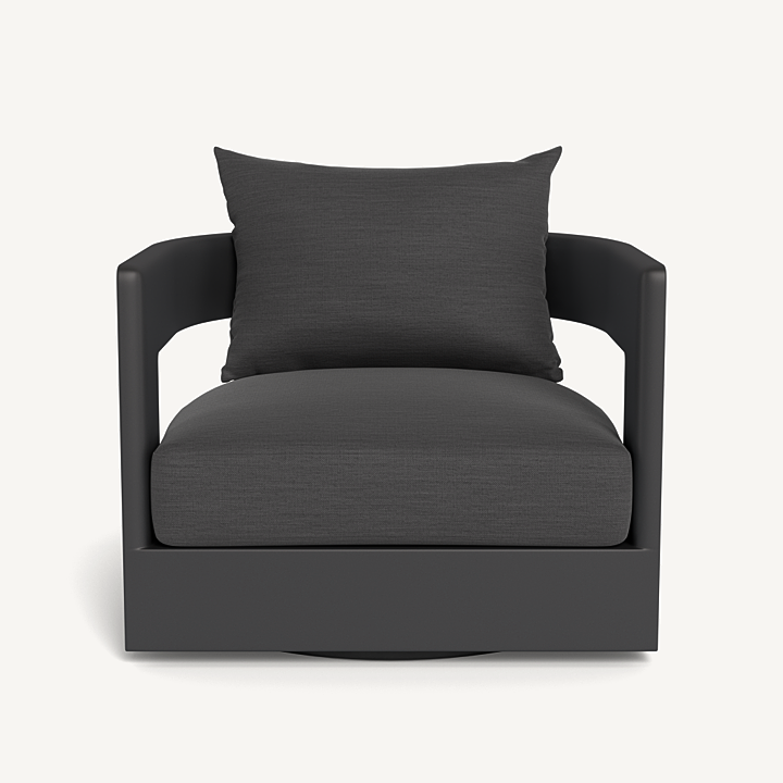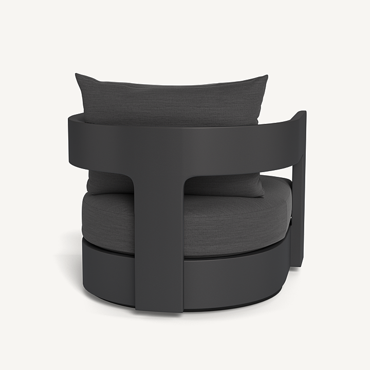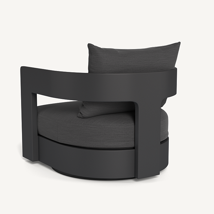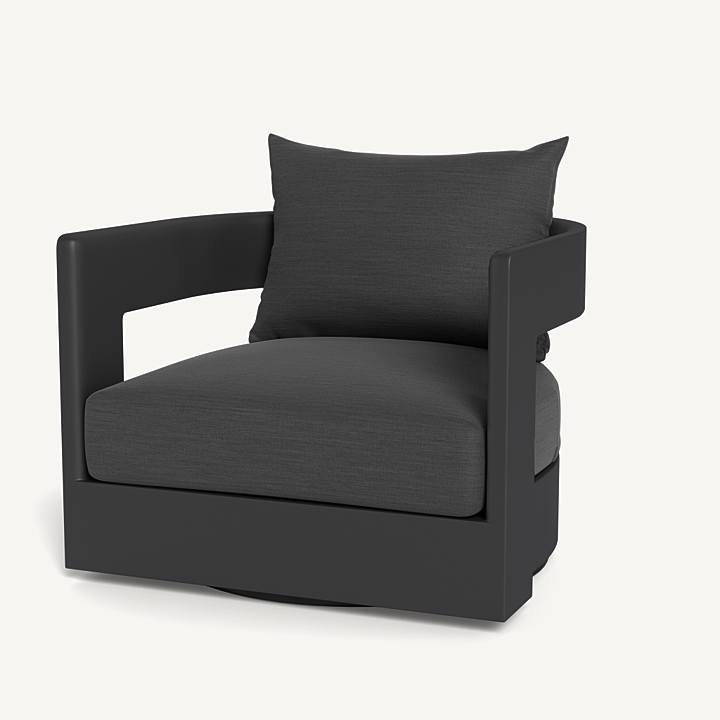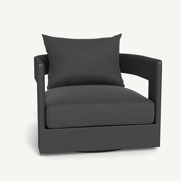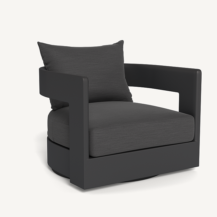 Our Victoria collection balances sculptural curves and right angles for true simplicity of proportion. The Victoria Swivel Lounge Chair is our take on the mid-century tripod chair, now updated onto a swivel plinth base for ease of motion and comfort — enjoy plush all-weather seat and back cushions supported by a slatted suspension with a striking rounded frame in powder coated extruded aluminum. Tailored and sophisticated, this contemporary piece brings harmony to a variety of spaces.