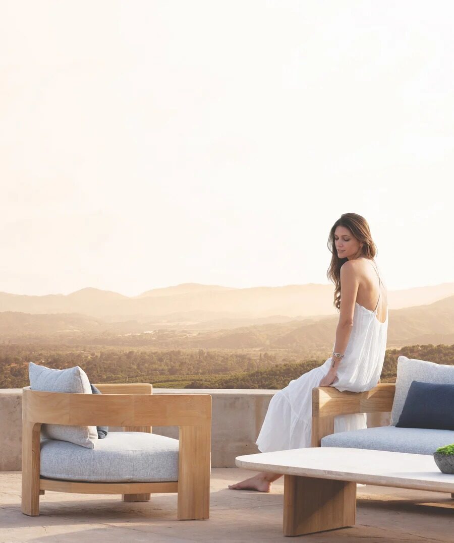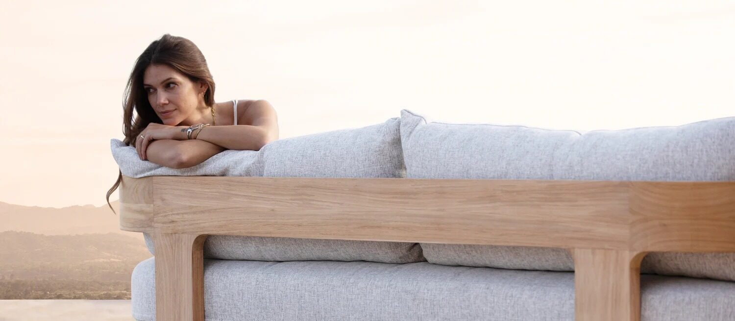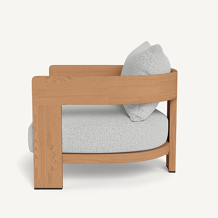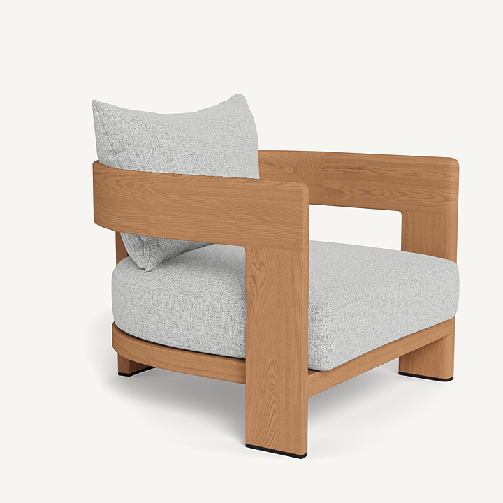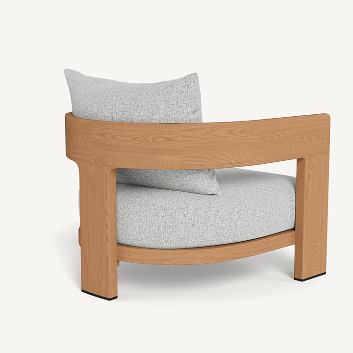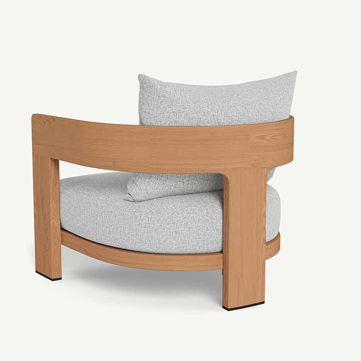 Our Victoria Teak collection balances sculptural curves and right angles for true simplicity of proportion. The Victoria Teak Lounge Chair is our take on the mid–century tripod chair — enjoy plush all–weather seat and back cushions in a range of neutral tones supported by a slatted suspension with a striking rounded frame in solid natural Indonesian teak. Tailored and sophisticated, this contemporary outdoor lounge chair brings harmony to a variety of spaces.